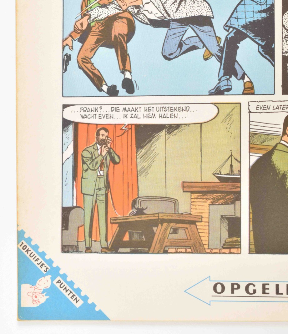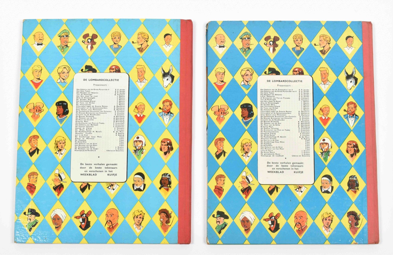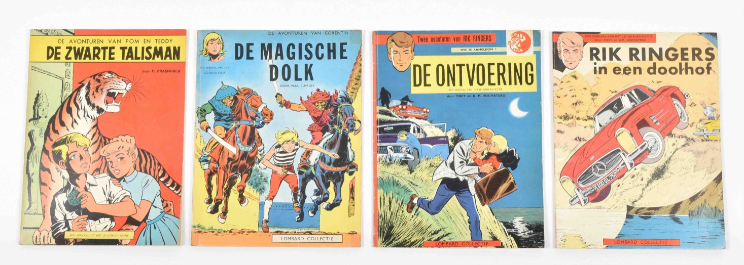 Tibet/A.P. Duchateau. Rik Ringers. De ontvoering. Two small strips of (hardly visible) tape on outer edges back, else fine copy incl. Kuifje punt. With: (2) Rik Ringers in een doolhof. Small crease on back cover, else good copy. (3) Goscinny en Uderzo. Hoempa Pa. De Roodhuid. Lombard, 1961. Hc. Upper right corner edge worn, else good copy incl. Kuifje punt. (4) Raymond Reding. Jari in de Knel. Lombard, 1961. First flyleaf partly loose, else fine, corners and edges very good. (5) Paul Cuvelier. De avonturen van Corentin. De Magische Dolk. Lombard, 1963. Outer edges small strip of tape (put there for protection, unfortunately). Added: (6) F. Craenhals. De Avonturen van Pom en Teddy. De Zwarte Talisman. Lombard, sc, 1958.