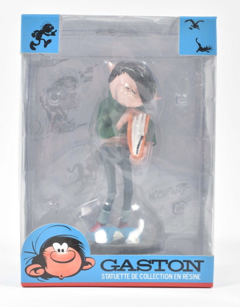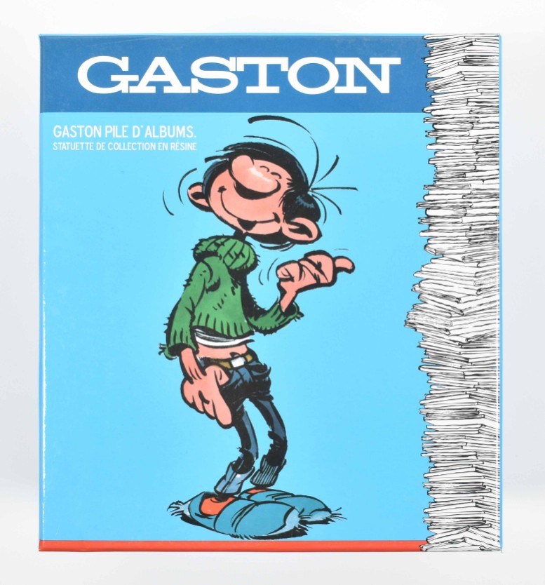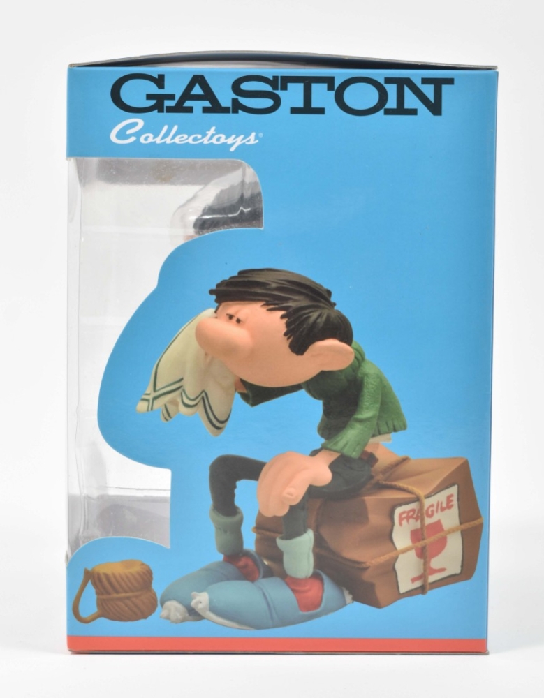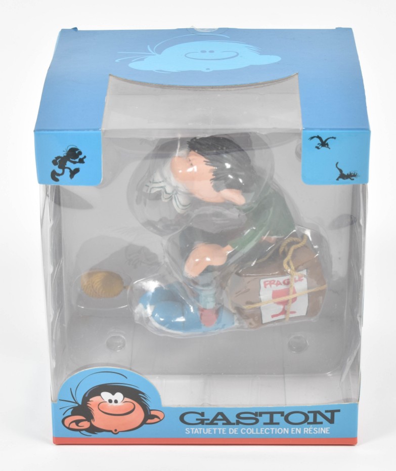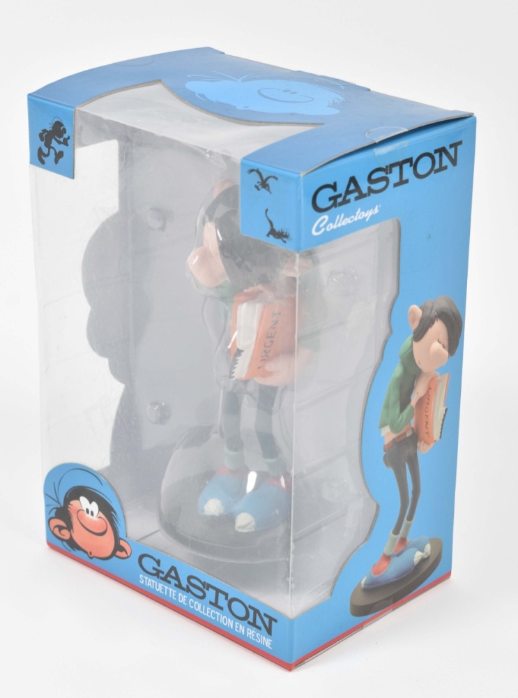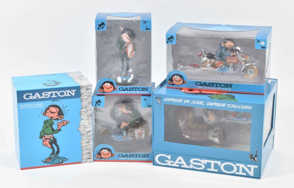 (1) Coffret Collector. Gaffeur un jour, gaffeur toujours. Including a resin Collectoys figurine, h. 18 cm, 6 dvds and the album "The animated Gaston". (2) Gaston Pile d'Albums, h. 17 cm. Collectoys no. 321. (3) Gaston et la moto "Sapetoku", 23 x 10 cm. Collectoys no. 305. (4) Gaston caisse fragile, h. 12 cm. Collectoys no. 316. (5) Gaston dossier urgent. Collectoys no. 311. Dupuis, 2016-2020, all in original box. Near mint/mint condition.
