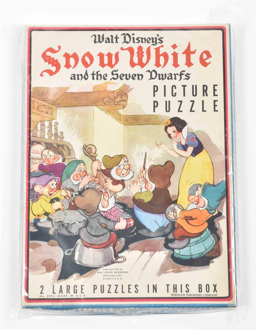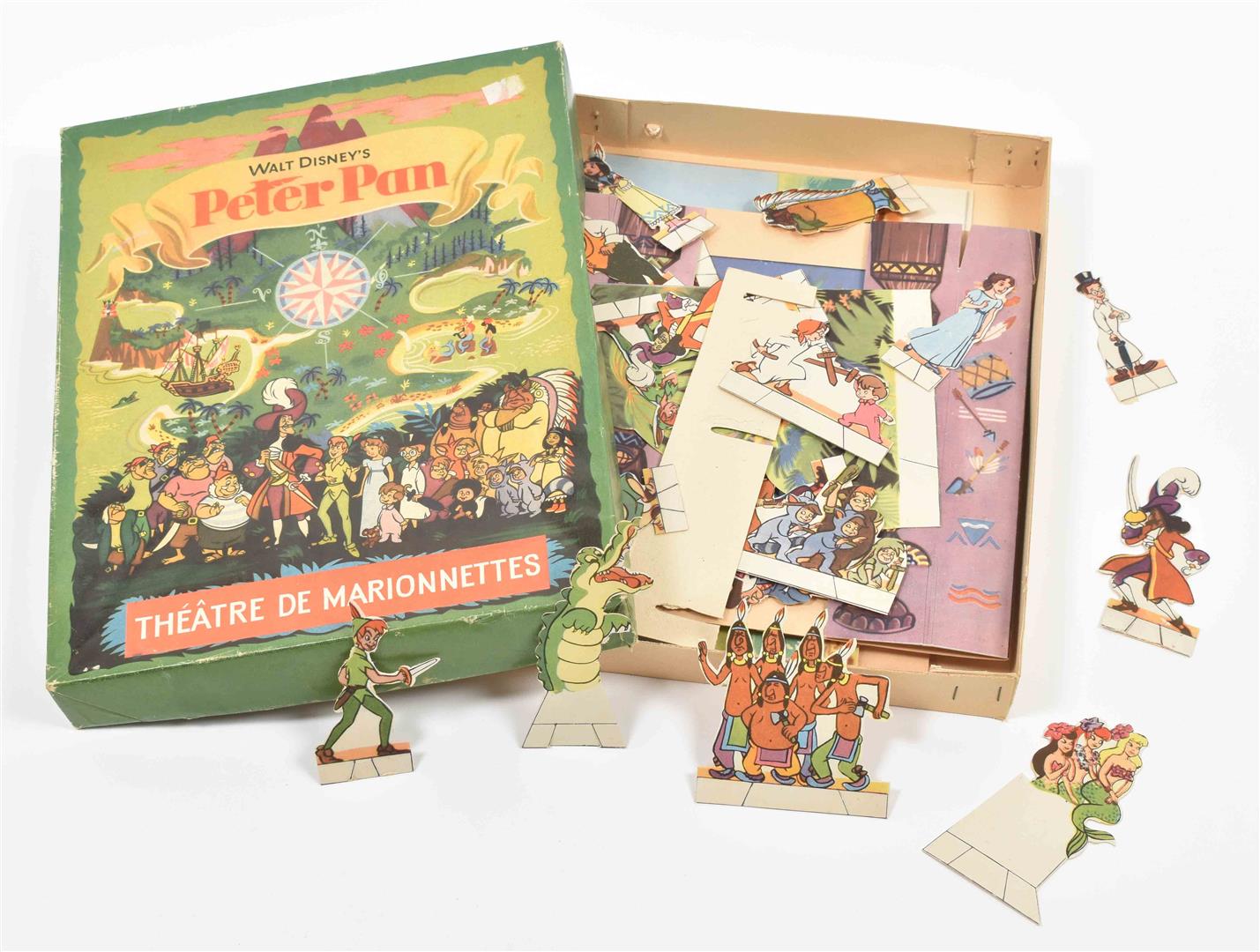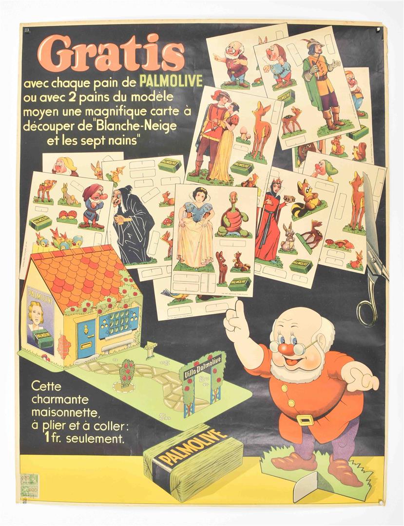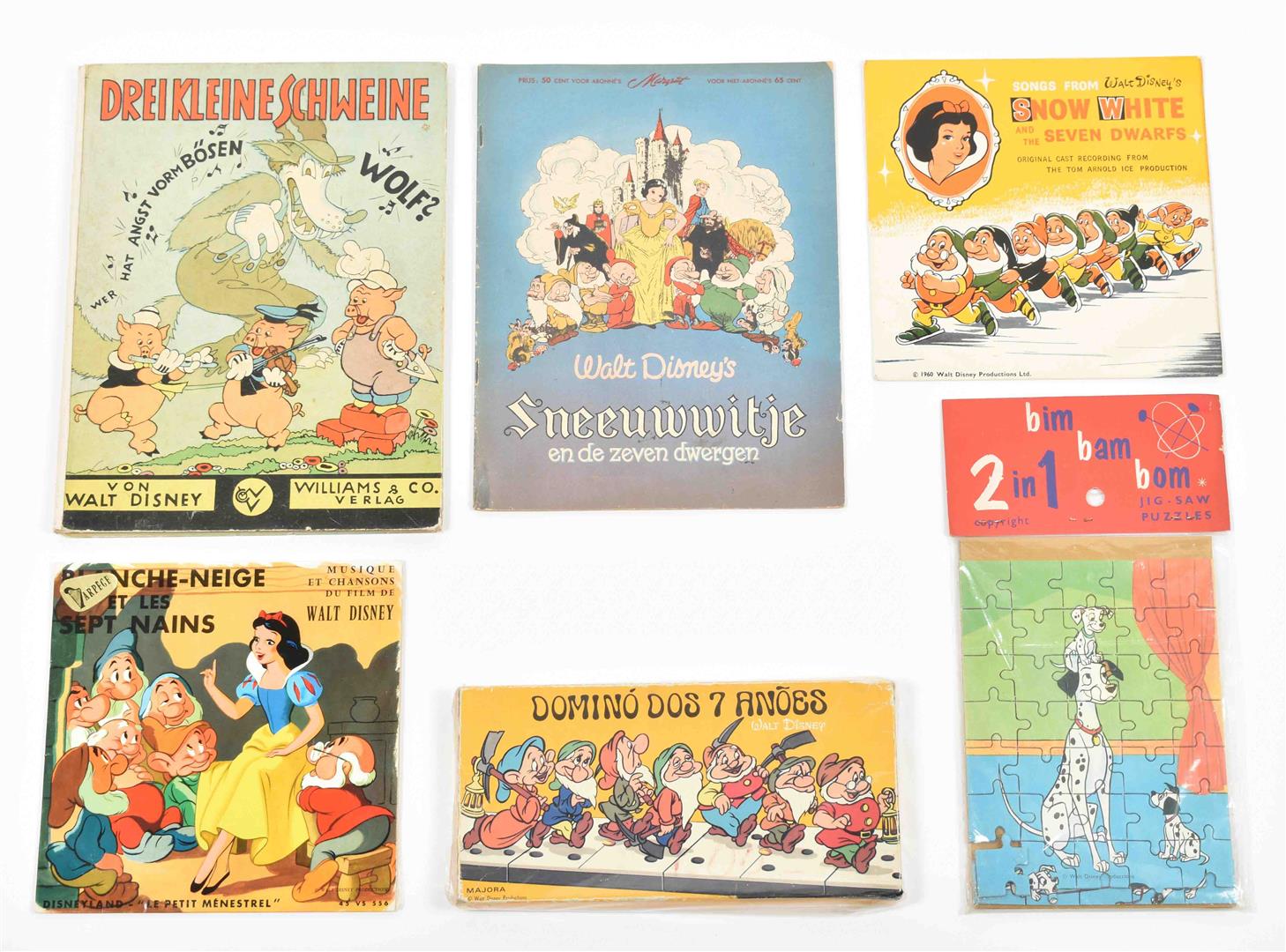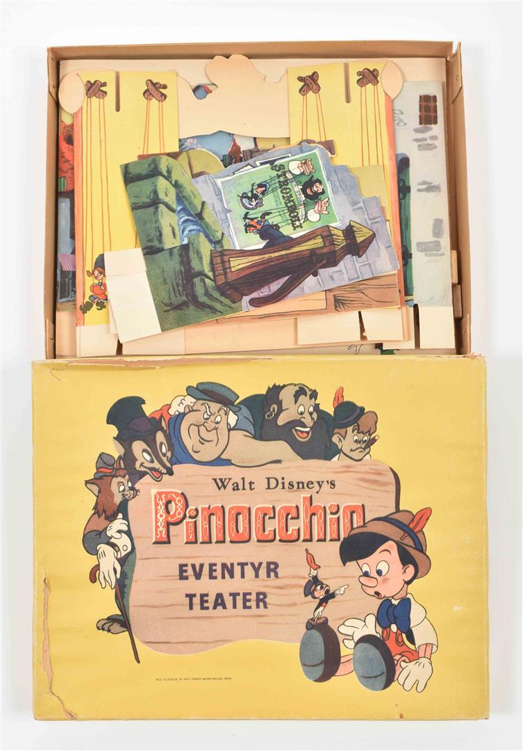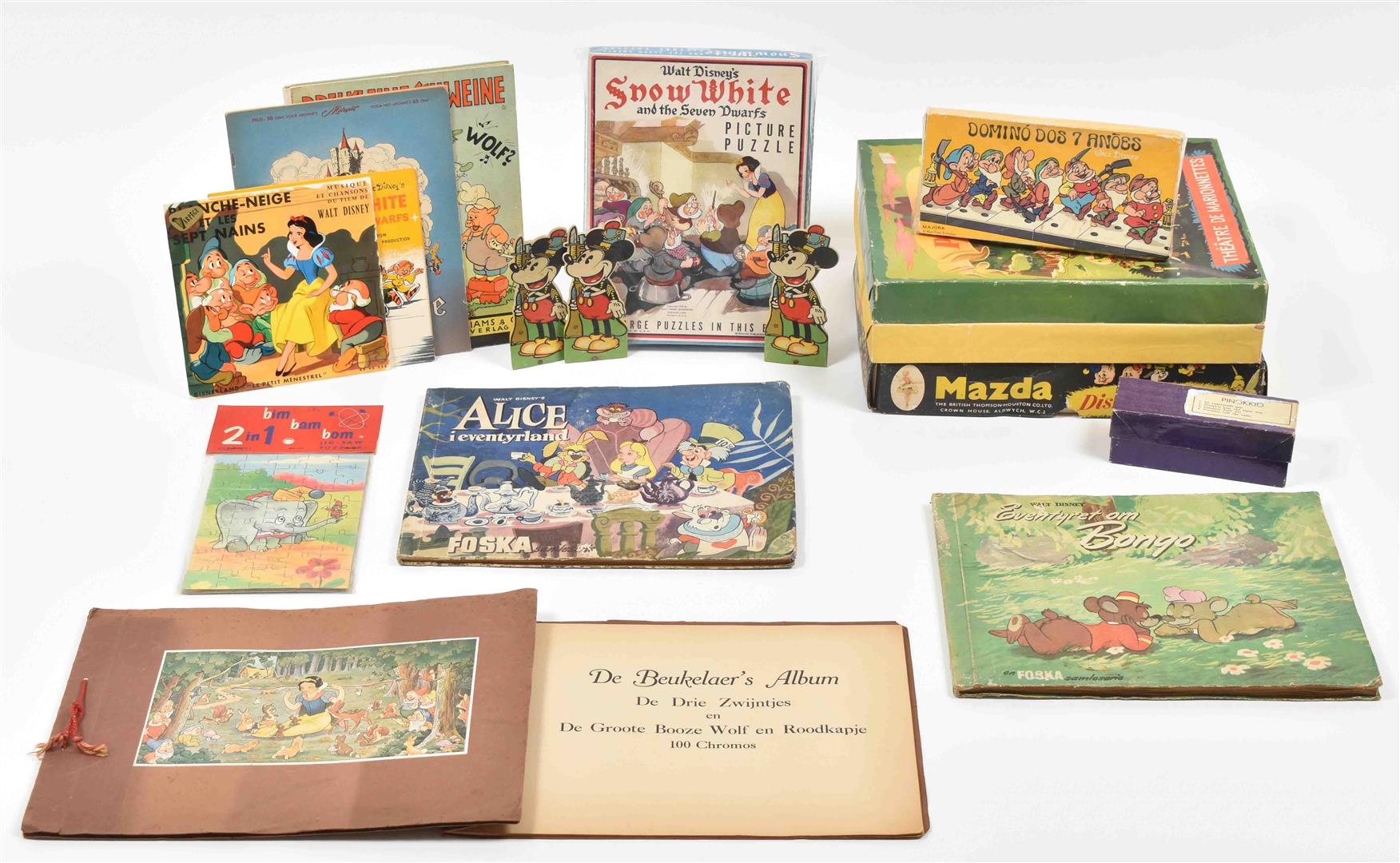 The British Tomson-Houston co, 1950. Box (sl. dam.) incl. a set of 10 lights. With: (2) Peter Pan. Théâtre de Marionnettes. (3) Pinocchio. Eventyr Teater. (box sl. dam.) (4) Snow White and the Seven Dwarfs Picture Puzzle. Whitman publ. company, U.S.A., 1938. (5) Pinokkio. Set of 4 Dutch magic lantern movies, 1950s. (6) Snow White Palmolive poster, ca. 1938. 72 x 55 cm -and 14 more items from the 1940s-1960s on Disney animated movie characters.