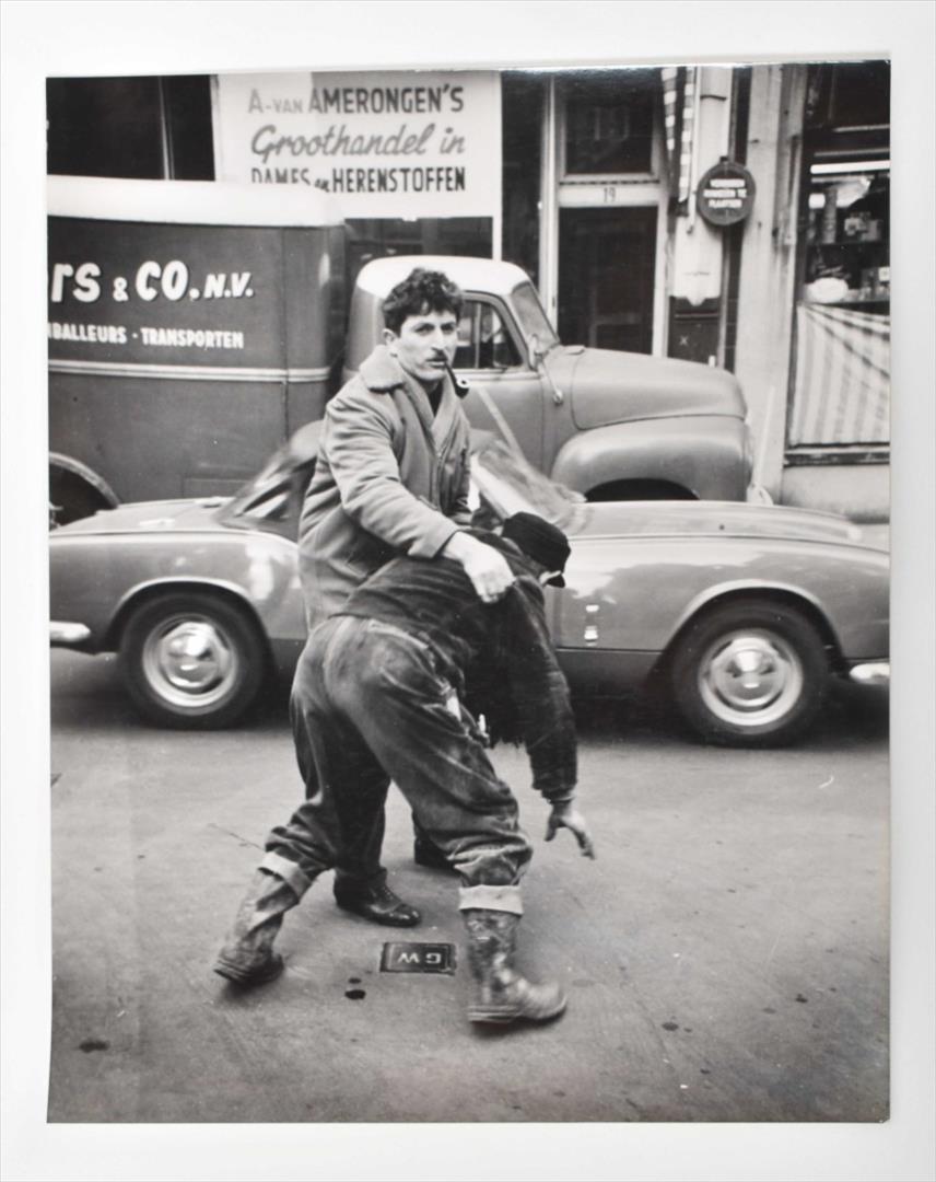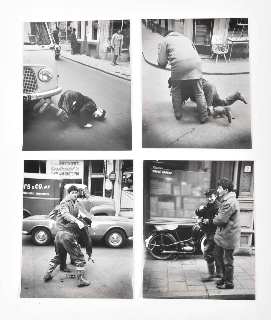 Series of four vintage gelatine silver photos of a drunken man being thrown on the street by another. Ca. 1960. All approx. 25 x 20 cm. All w. stamp Jaring Commelinstraat on reverse.