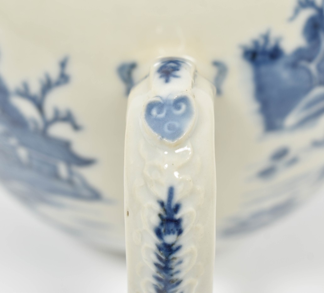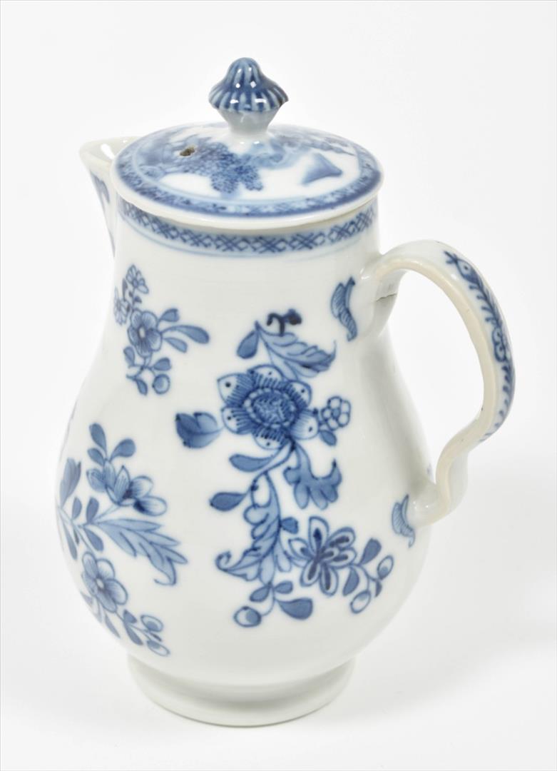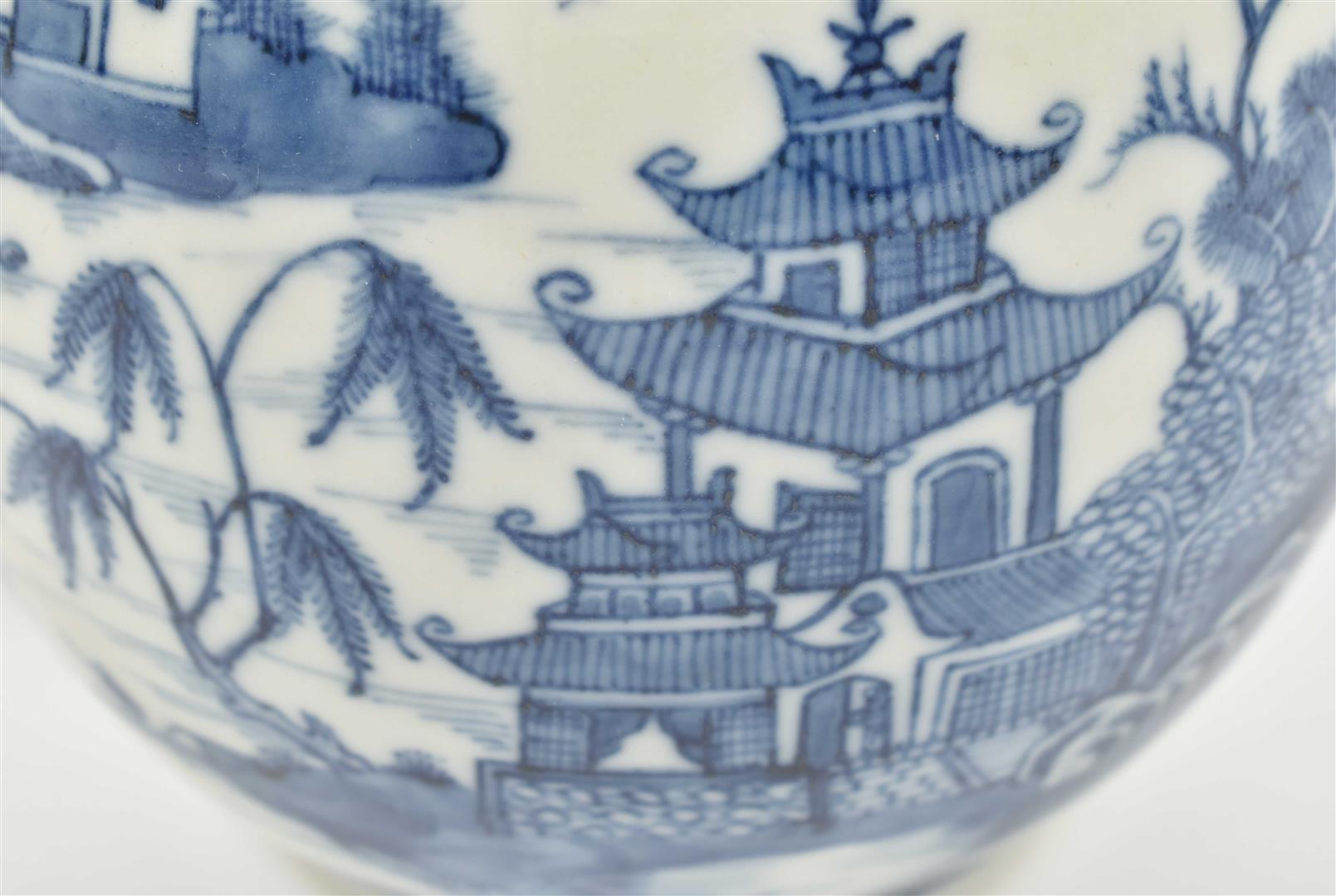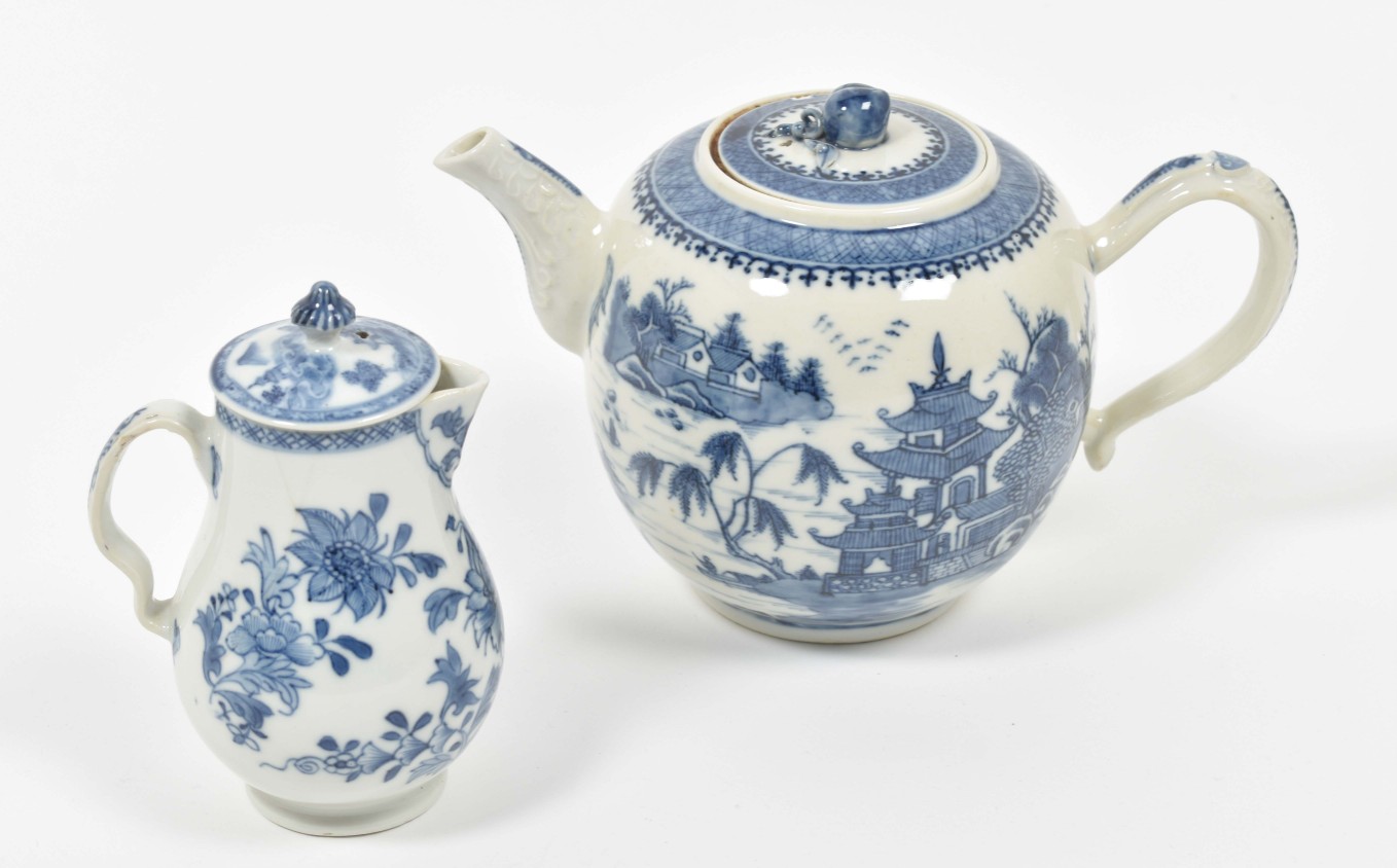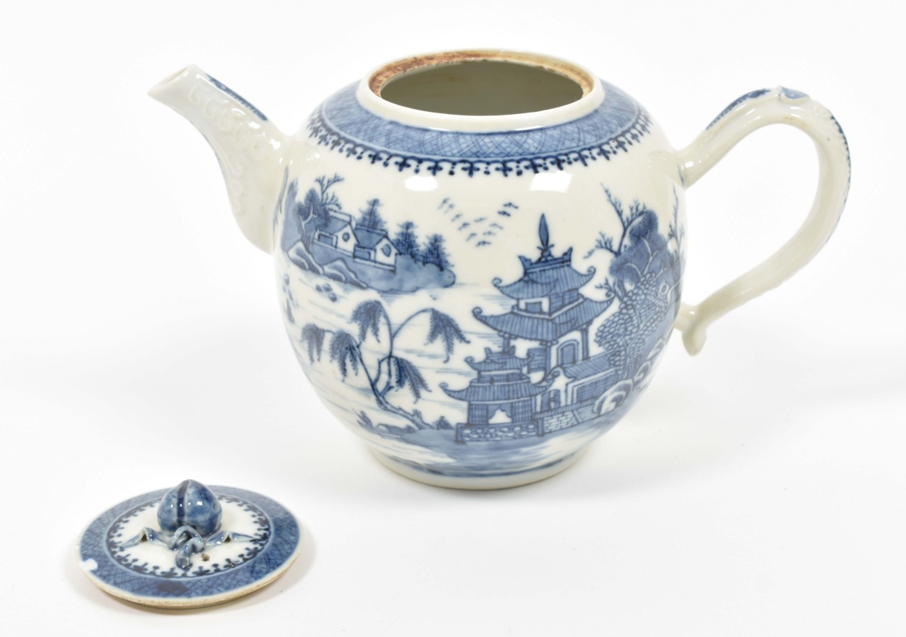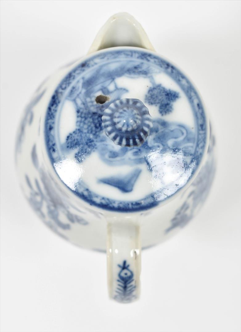 18th cent. A large porcelain teapot w. lid and full blue and white landscape dec. w. harbour and temples. Approx. 16 cm tall w. lid.