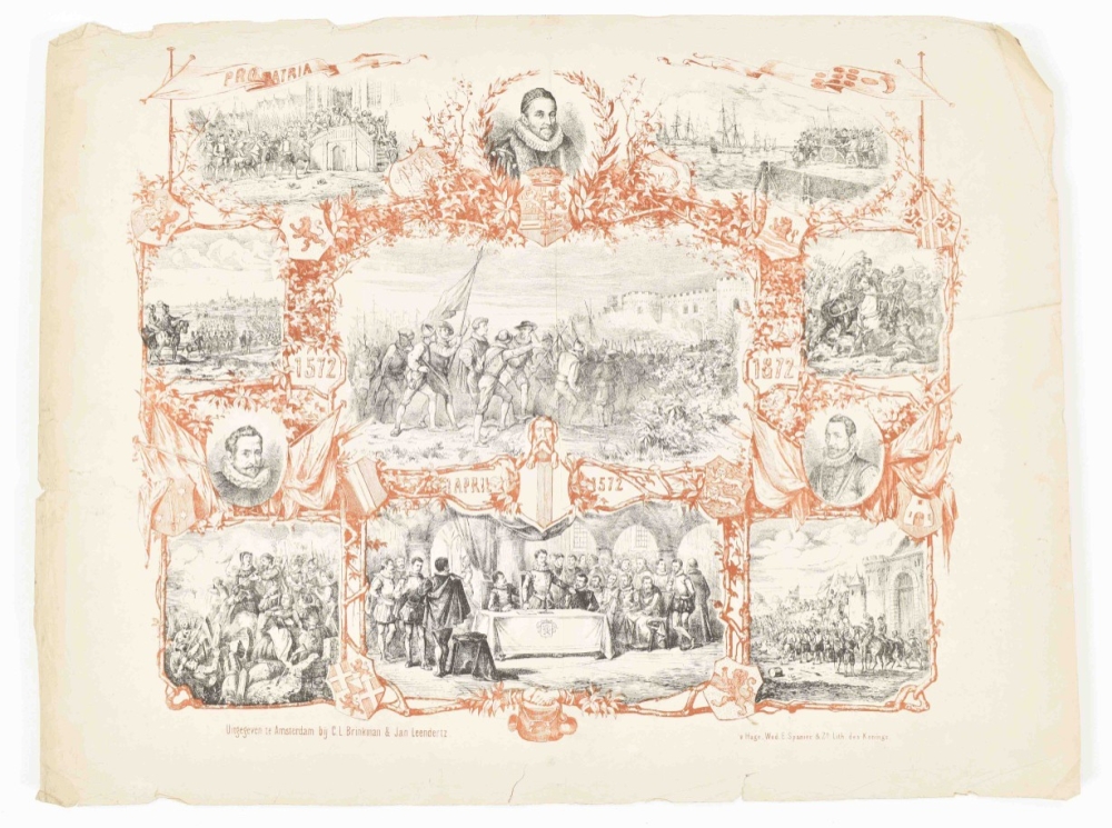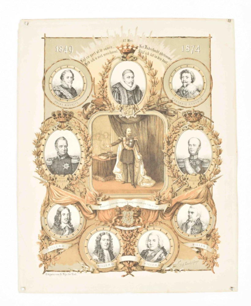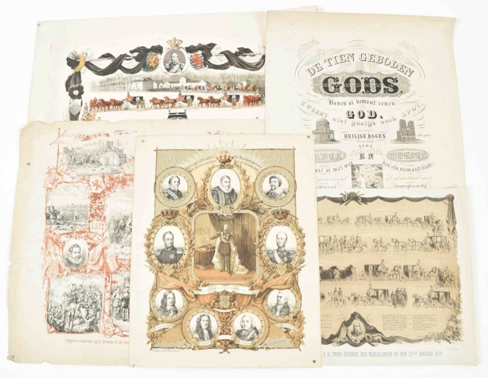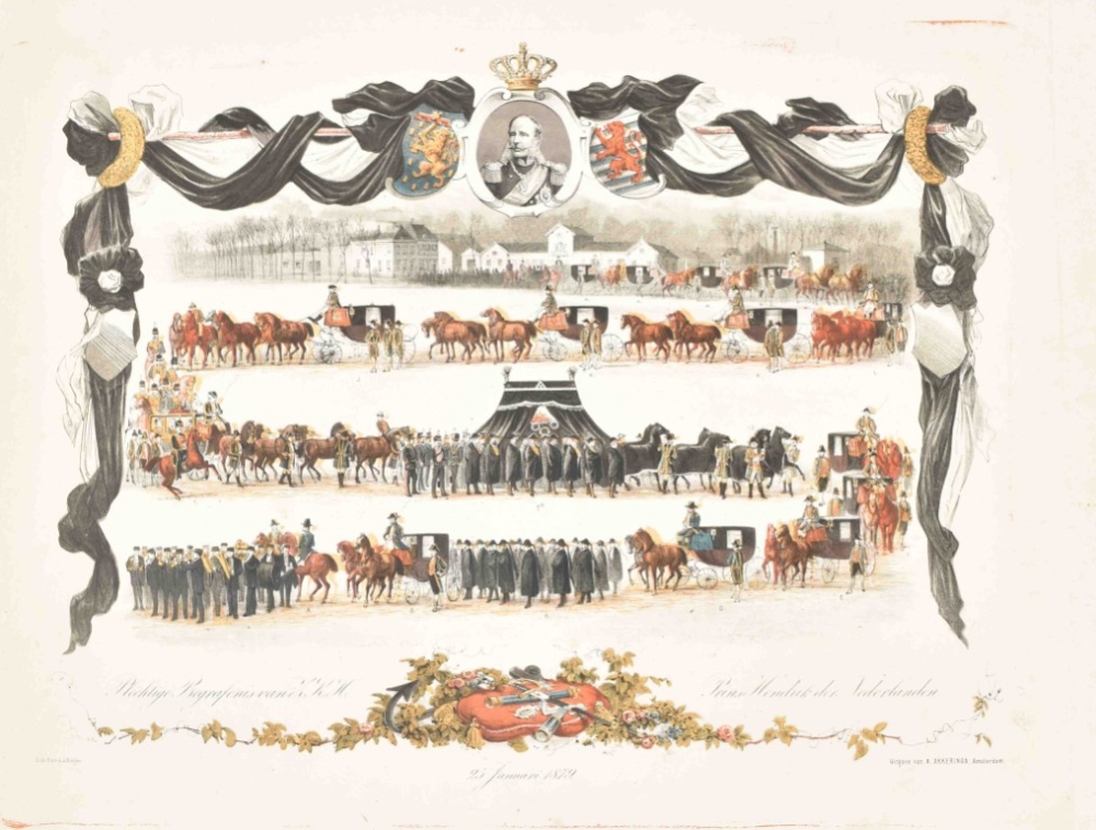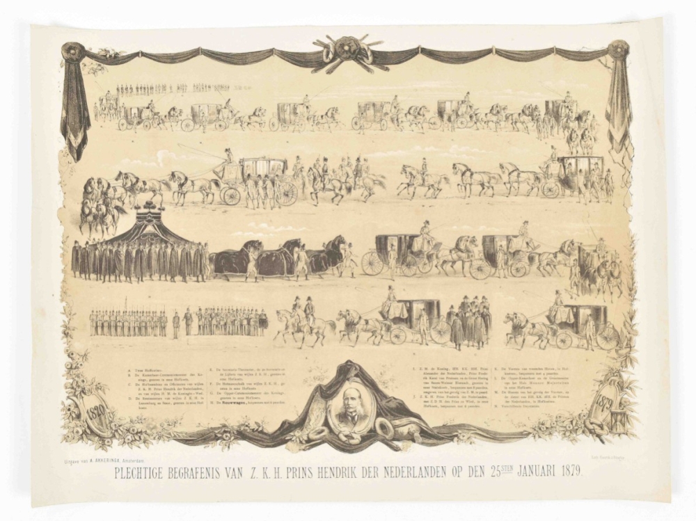 25 januari 1879. Amst., A. Akkeringa, 1879. Lithogr. by Emrik & Binger. Col. lithogr., 65.5 x 73 cm. Sl. frayed/torn along edges. (2) Plechtige begrafenis van Z.K.H. Prins Hendrik der Nederlanden op den 25sten januari 1879. Amst., A. Akkeringa, 1879. Lithogr. by Emrik & Binger. Lithogr. in grey tones, 54 x 40.5 cm. (3) 1849-1974. Lijf en goet al te samen, Heb ick u niet verschoont, Het Vaderlandt ghetrouwe, Blijf ik tot in den doot. Tiel, D. Mijs, 1874. Lithogr. by Emrik & Binger. Col. lithogr. honouring William III of the Netherlands, 54 x 43 cm. Edges sl. frayed, central fold. -and 2 more.