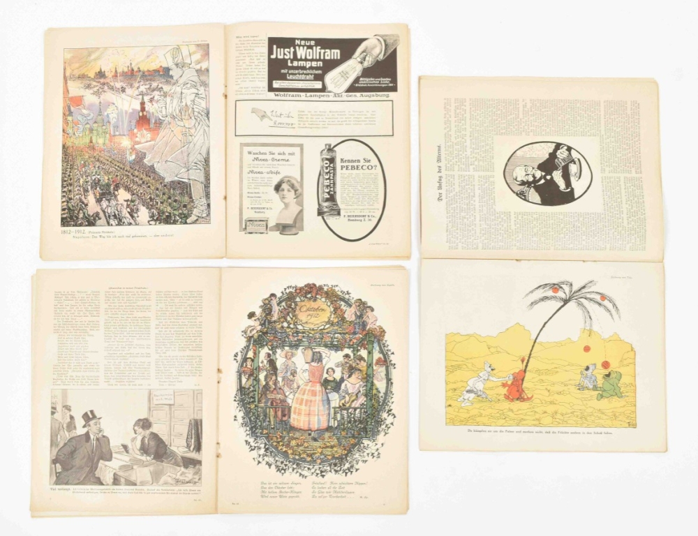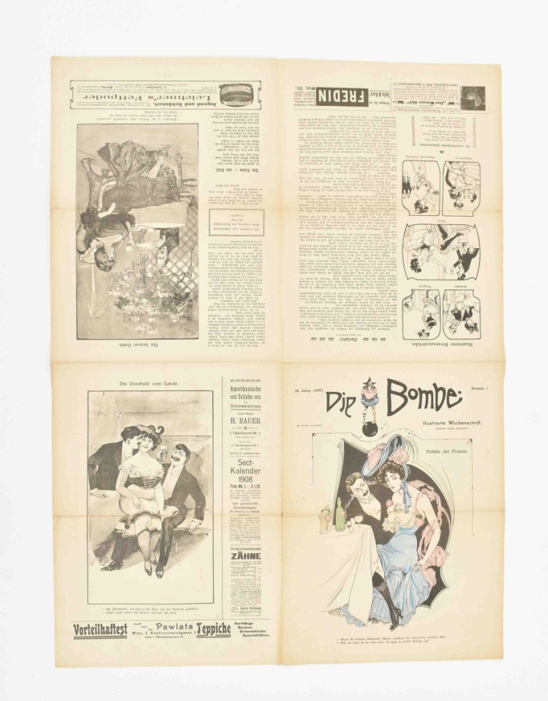38. Jahrg. (1908). Nummer 1-5. Ed. Josef Geyer. Printed in Vienna by H. Pollak for Ignaz Goldblatt 5 vols., all 8 p. and w. mostly anonymous ills., numerous adverts, folio. All w. folds and unopened. Rare. (6-11) Satyr. Three prospectuses and Jahrg. 3, No. 10-12. Berlin, Verlag des Satyr, n.d. (ca. 1900), the prospectuses 2-4 p., the numbers w. continuous pagination 145-188 p., ills. after E. Rosenstant, Otto Lacemann, P. Haase a.o. The extremely rare prospectuses (and the numbers probably too, with stamp Verlag des Satyr on frontwr.) were sent to booktraders, these to P. Out in Koog aan de Zaan (the prospectuses with letterpress ticket).
