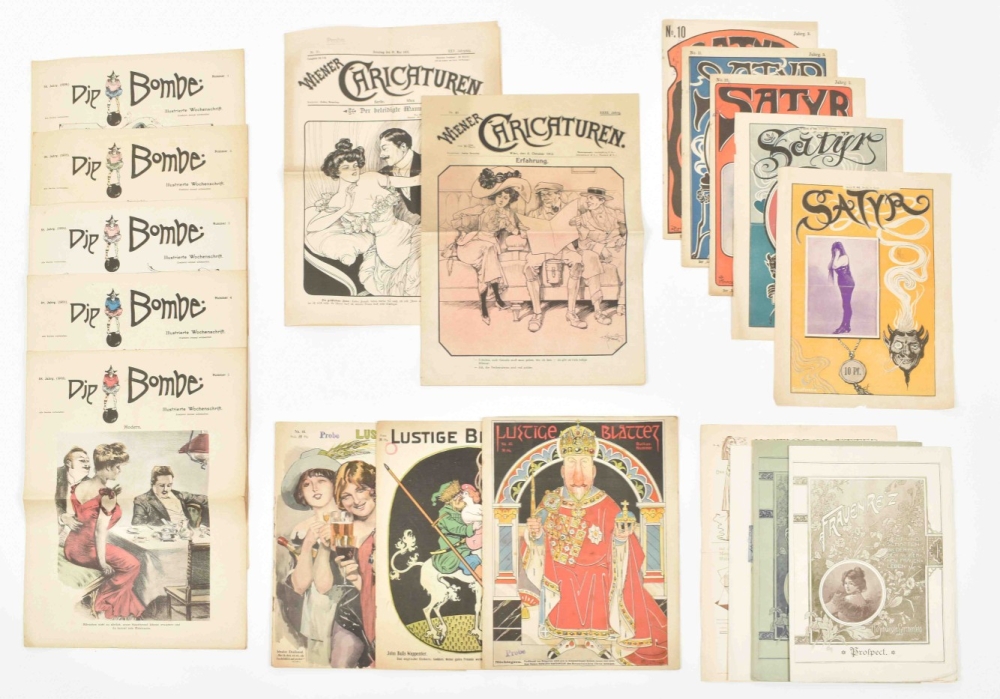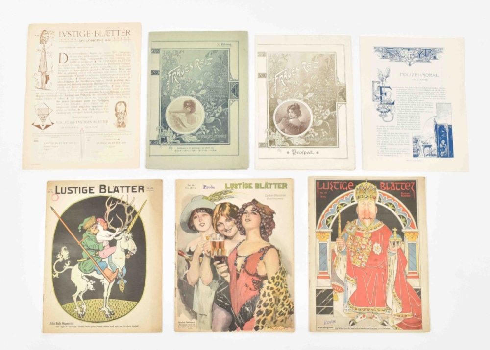 (12-13) A. v. Schweger-Lerchenfeld. Frauenreiz. Licht und Schattenbilder aus dem modernen Frauenleben. Prospectus and proof of the "I. Lieferung". Vienna, printed by Fr. Jasper for H. Hartleben, n.d. (ca. 1900), (8) resp. (14),24 p., plates and ills. after Erwin Pendl a.o. -and 6 others: 3 proof copies and 1 prospectus of Lustige Blätter, and 2 proof copies of Wiener Caricaturen. (total 18)