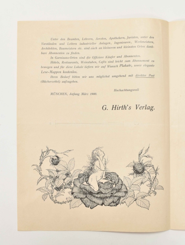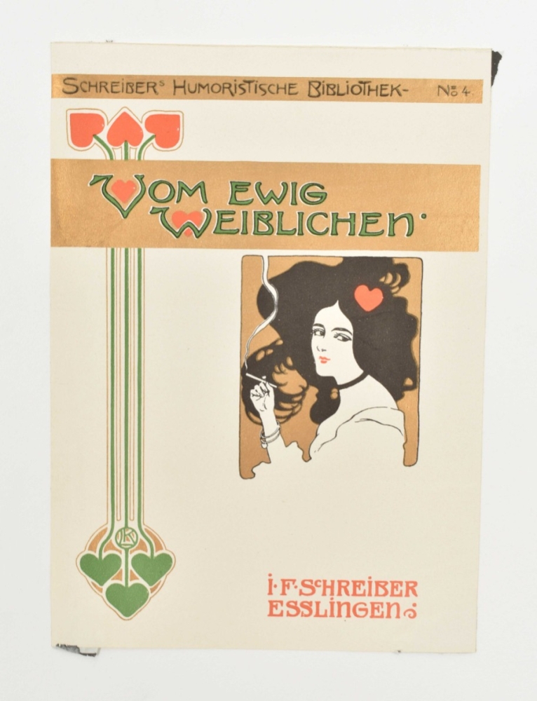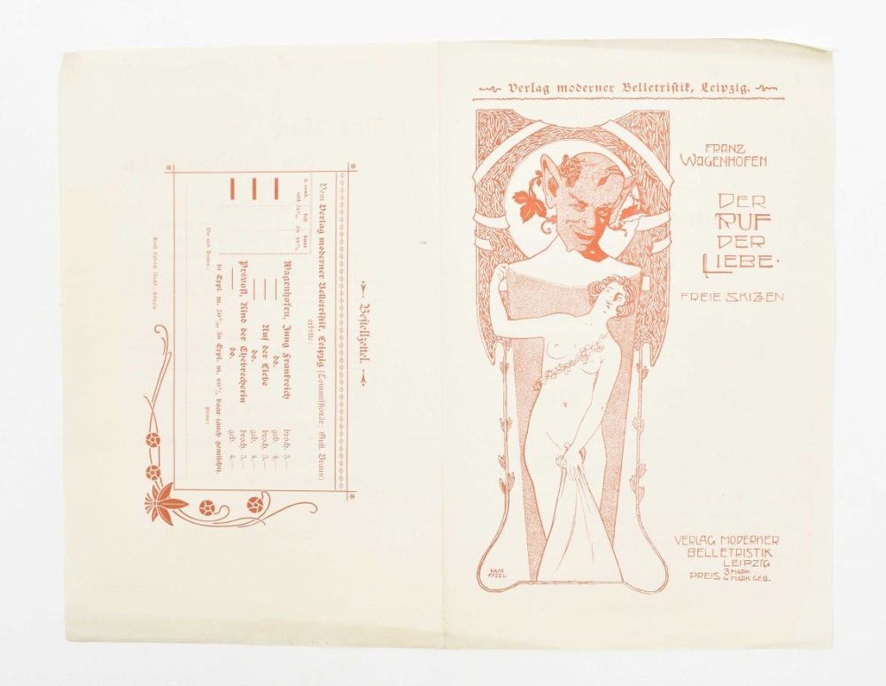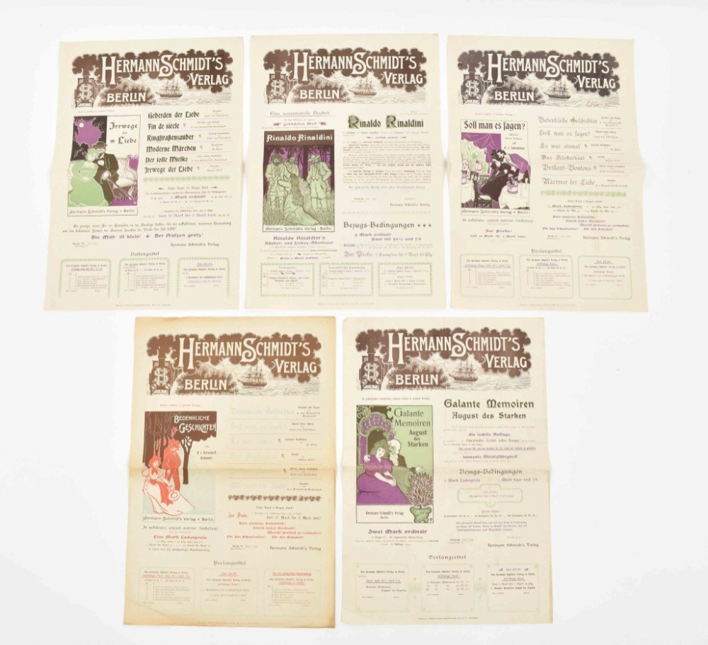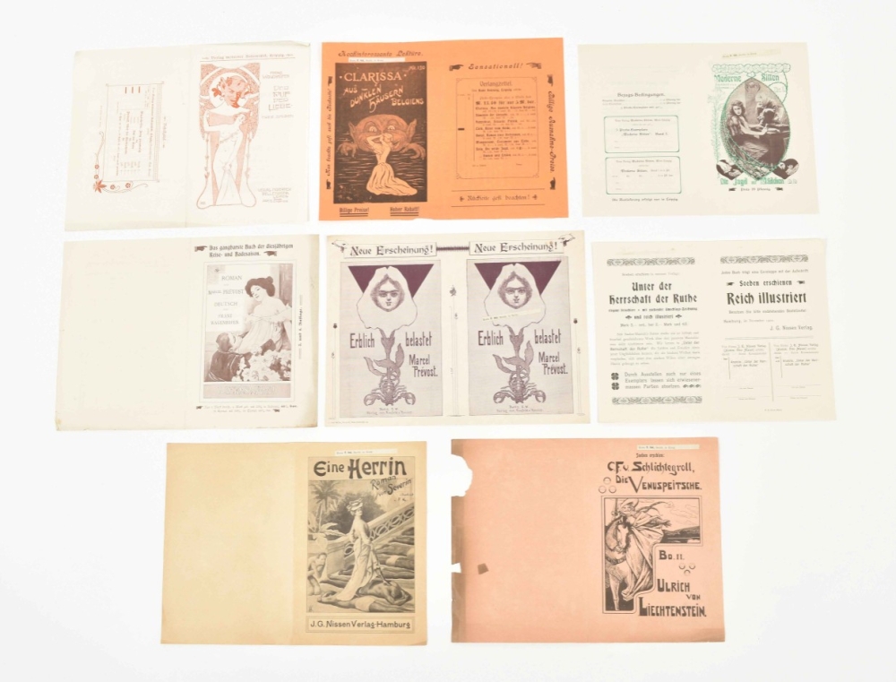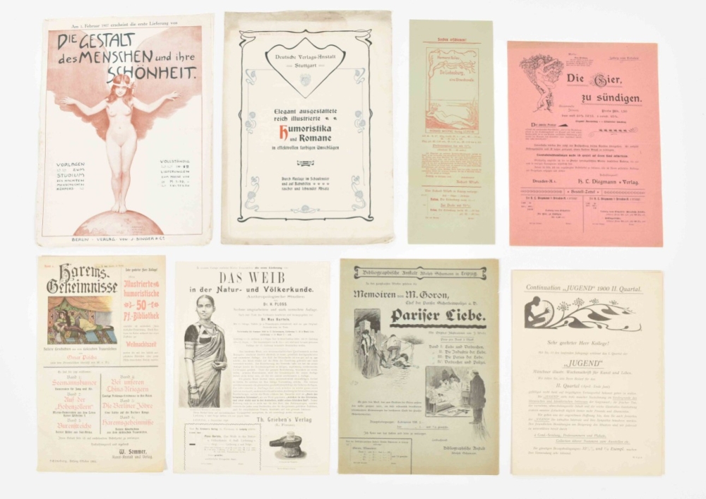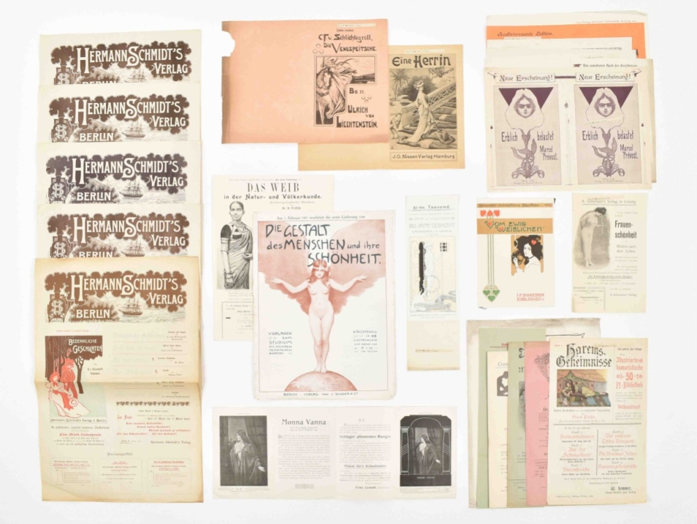 Comprises prospectuses for titles such as: Harems-Geheimnisse. Heitere Geschichten aus dem Türkischen von Omar Pascha (Schöneberg, W. Sommer), Memoiren von M. Goron, Chef der Pariser Sicherheitspolizei a. D. Pariser Liebe (Leipsic, A. Schumann), Die Gier zu sündigen. Gesammelte Skizzen (Dresden, H.L. Diegmann), Ernst von Wolzogen. Das dritte Geschlecht. Mit Buchschmuck von W. Caspari (Berlin, R. Eckstein Nachf. (H. Krüger)), Modere Sitten Nr. 1. Die Jagd auf Mädchen (Vienna/ Leipsic, Verlag Moderne Sitten), Die Gestalt des Menschen und ihre Schönheit. Vorlagen zum Studium des nackten menschlichen Körpers (Berlin, J. Singer & Co) and incl. 5 unif. prospectuses by Hermann Schmidt's Verlag in Berlin. (total 25)