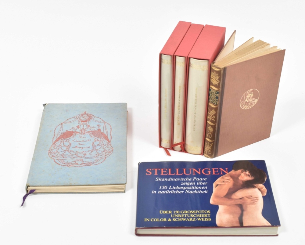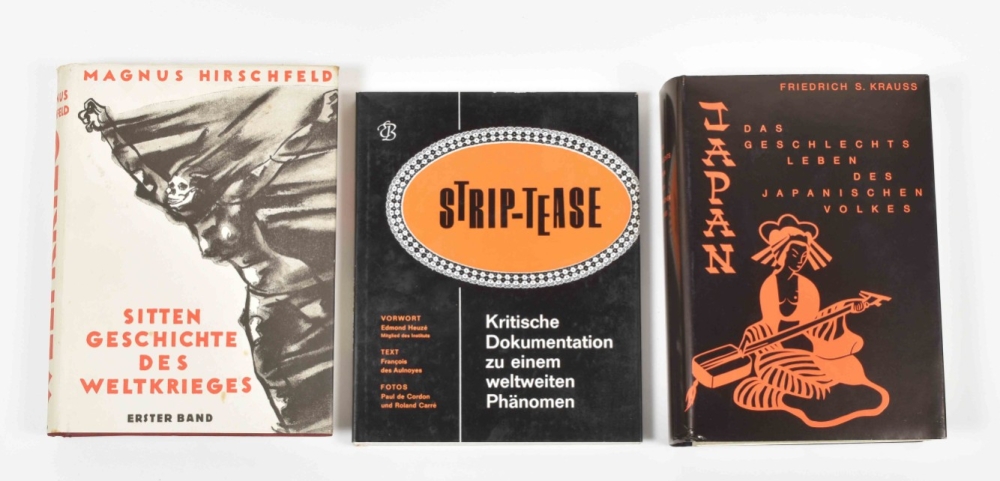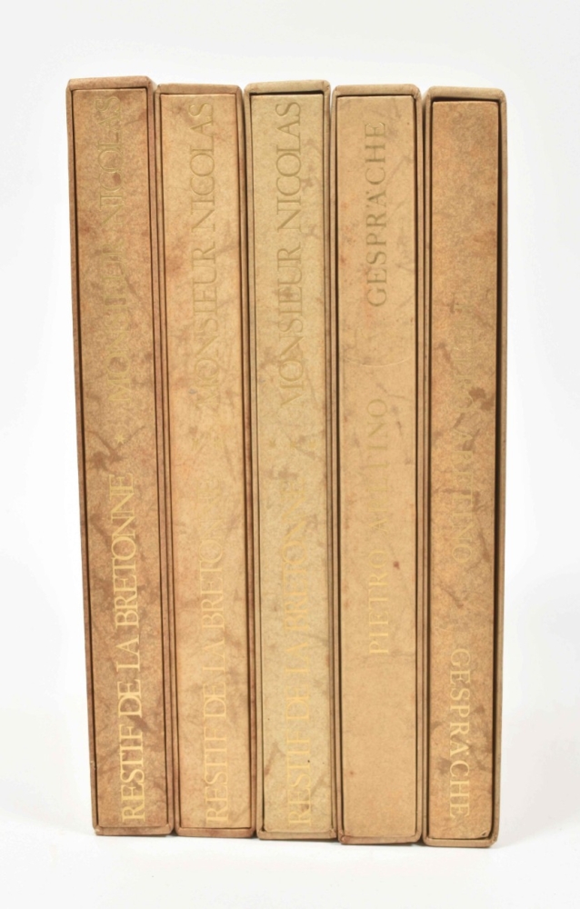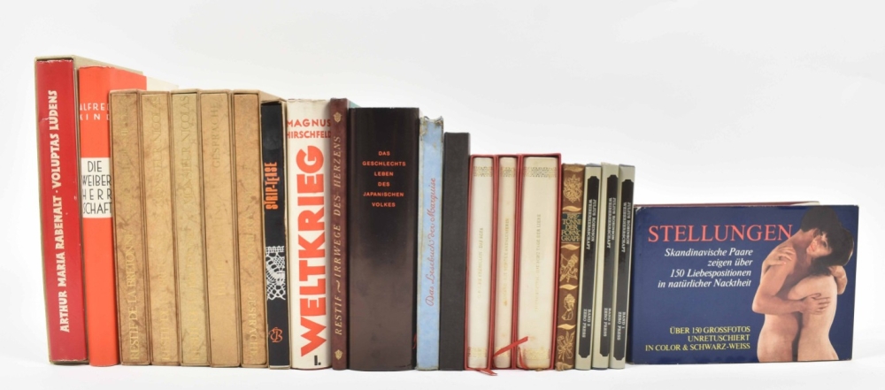 (1) A. Kind. Die Weiberherrschaft. Vienna/ Leipzig, Verlag für Kulturforschung, 1931. 1 vol. Hc. w. orig. ill. dust-jacket. Good condition. (2) 3 Restif de la Bretonne publ.: an ill. ed. of Monsieur Nicolas, Irrwege des Herzens and Der pornograph. (3) 3 works from the Bibliothek der erotischen Weltliteratur. -and 14 more.