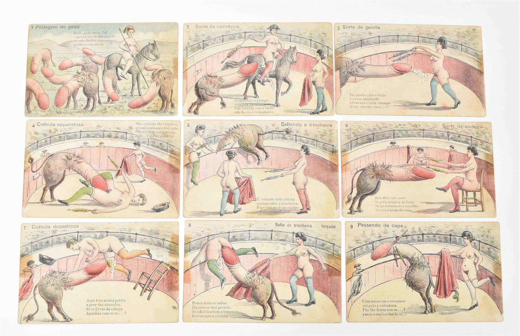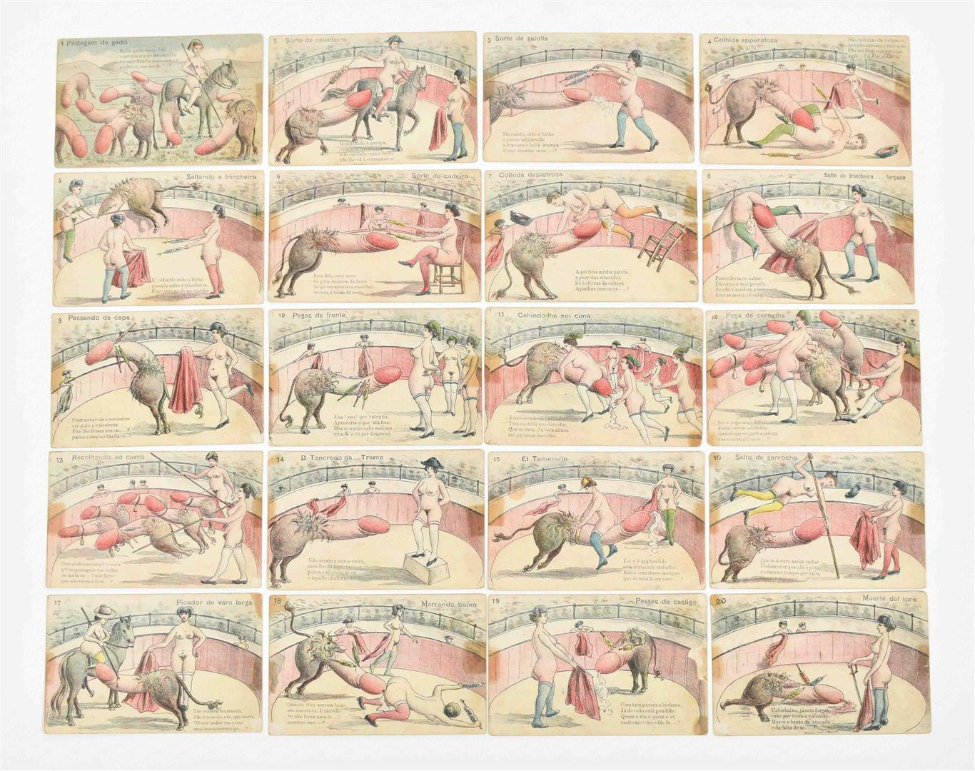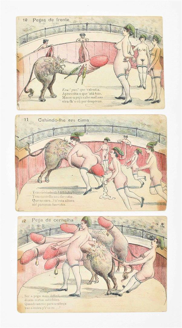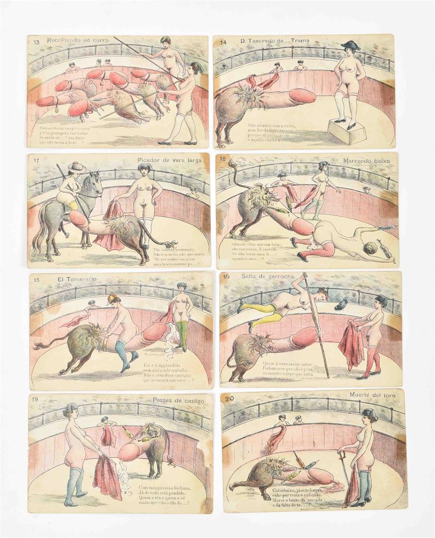 1920. Complete set. Coloured illustrated series of two women clad in stockings, shoes and hatgear fighting a penis-shaped bull. Uncirculated. Extremely rare.