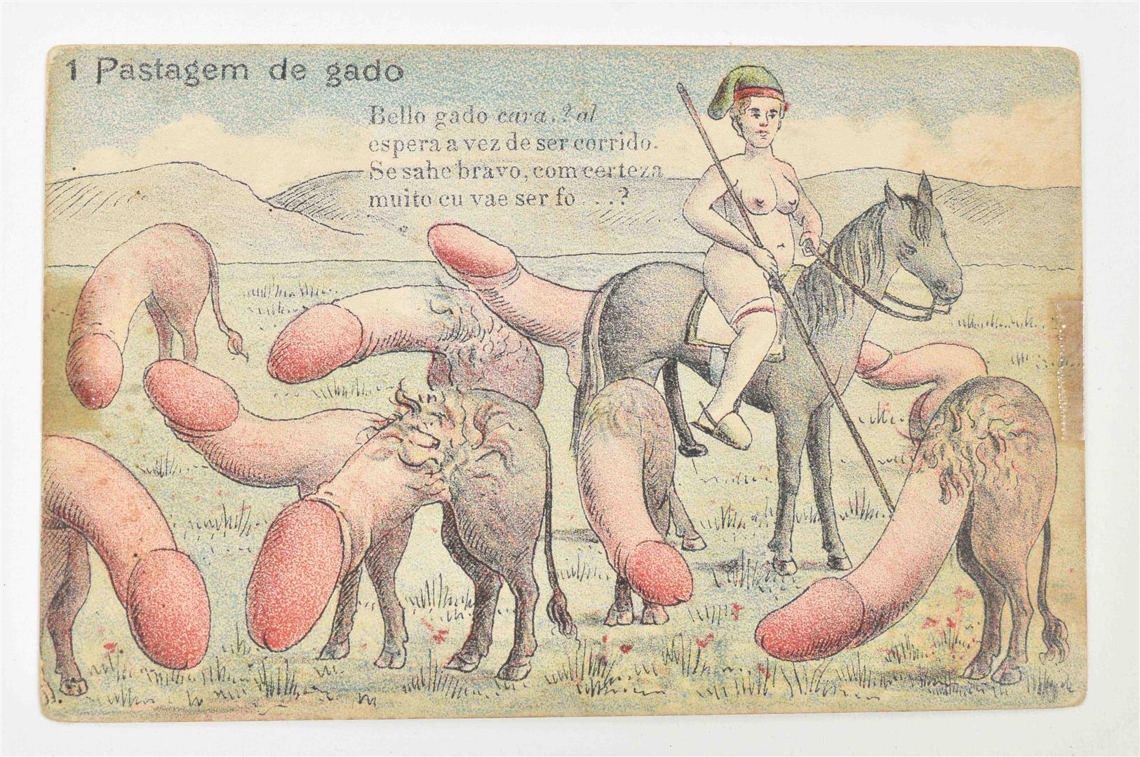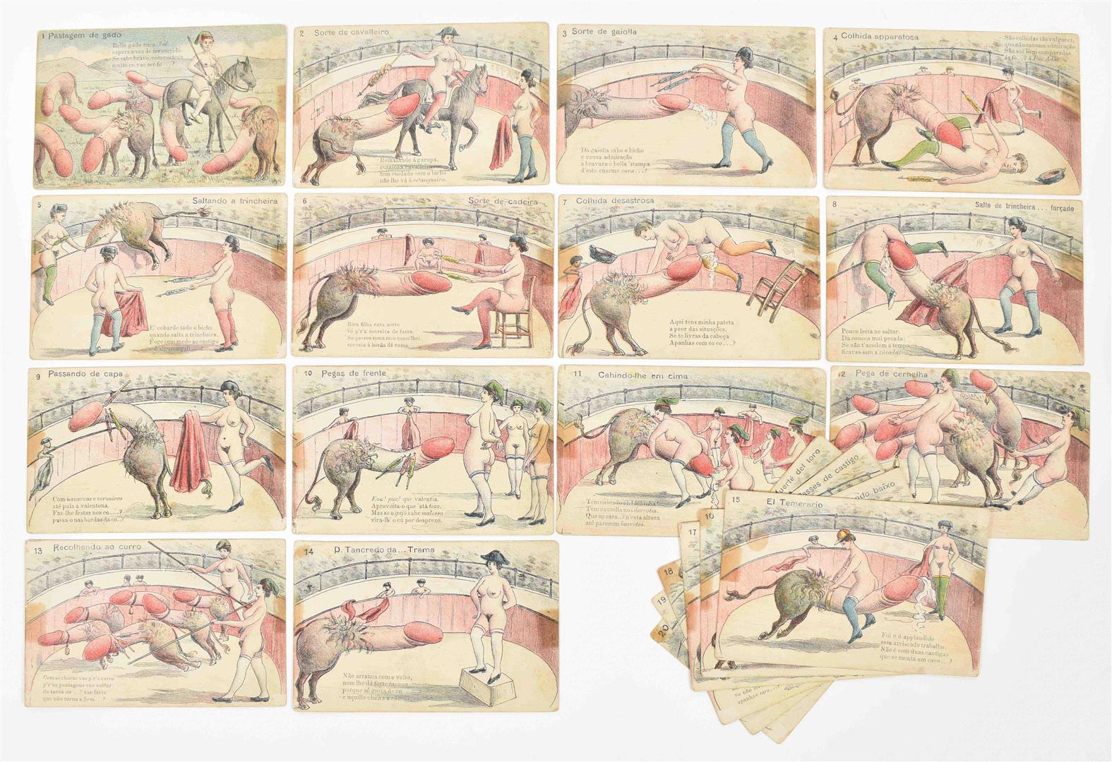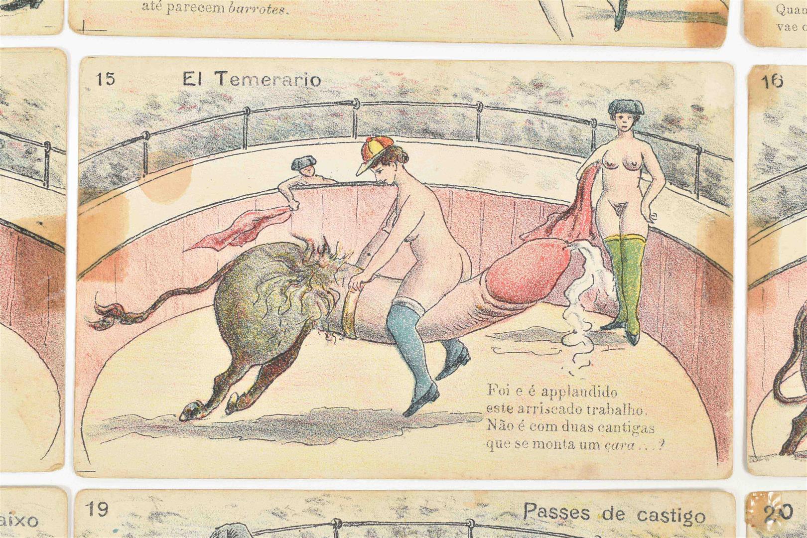 1920. Complete set. Coloured illustrated series of two women clad in stockings, shoes and hatgear fighting a penis-shaped bull. Uncirculated. Extremely rare.