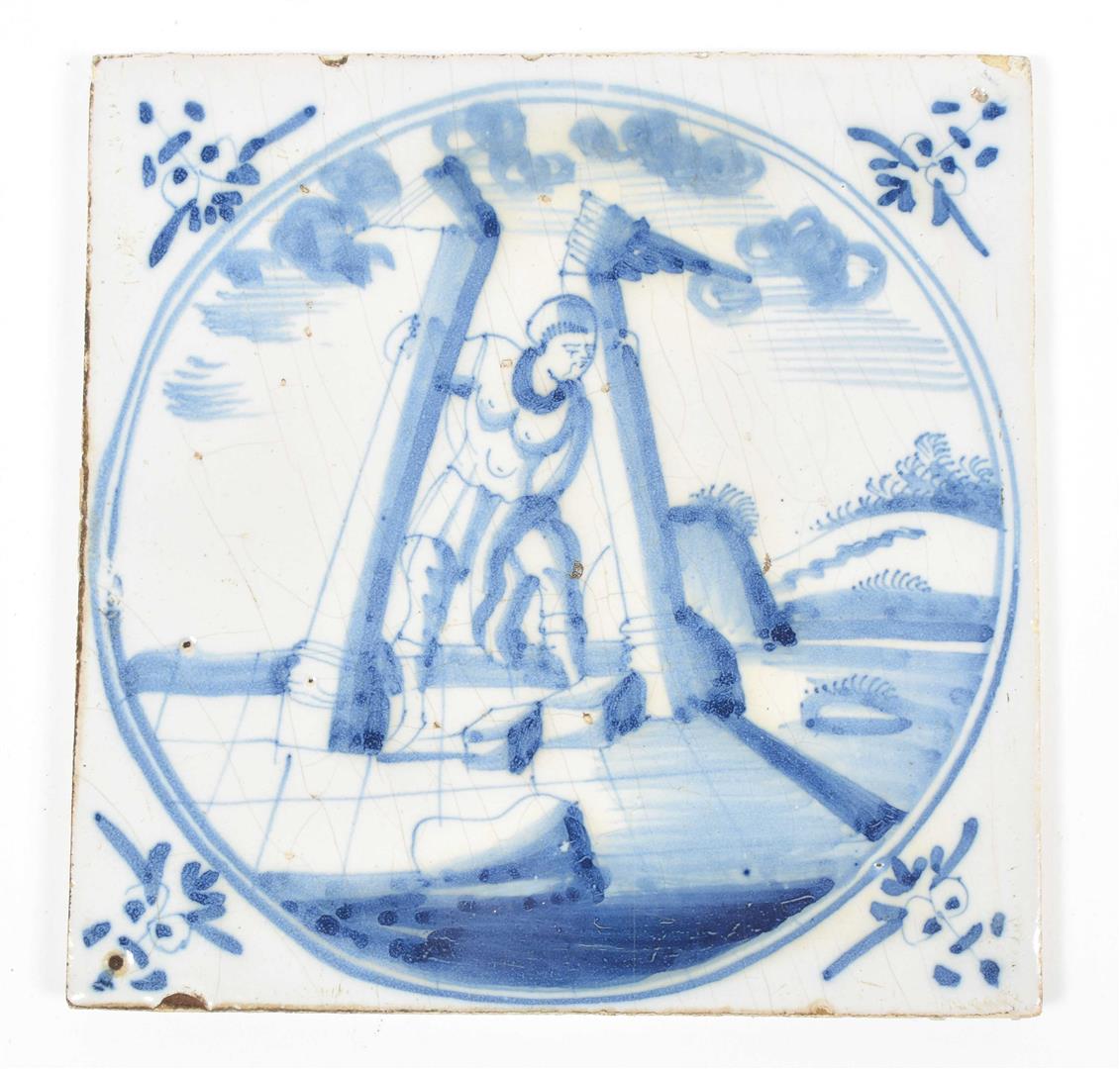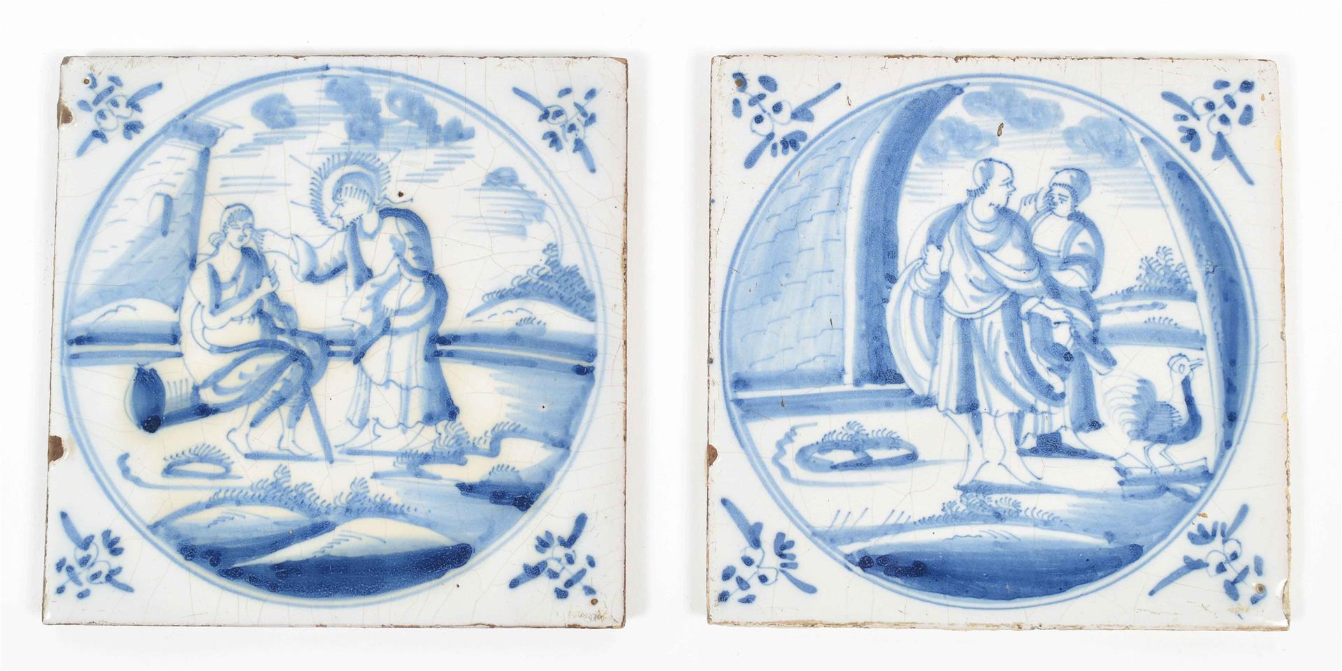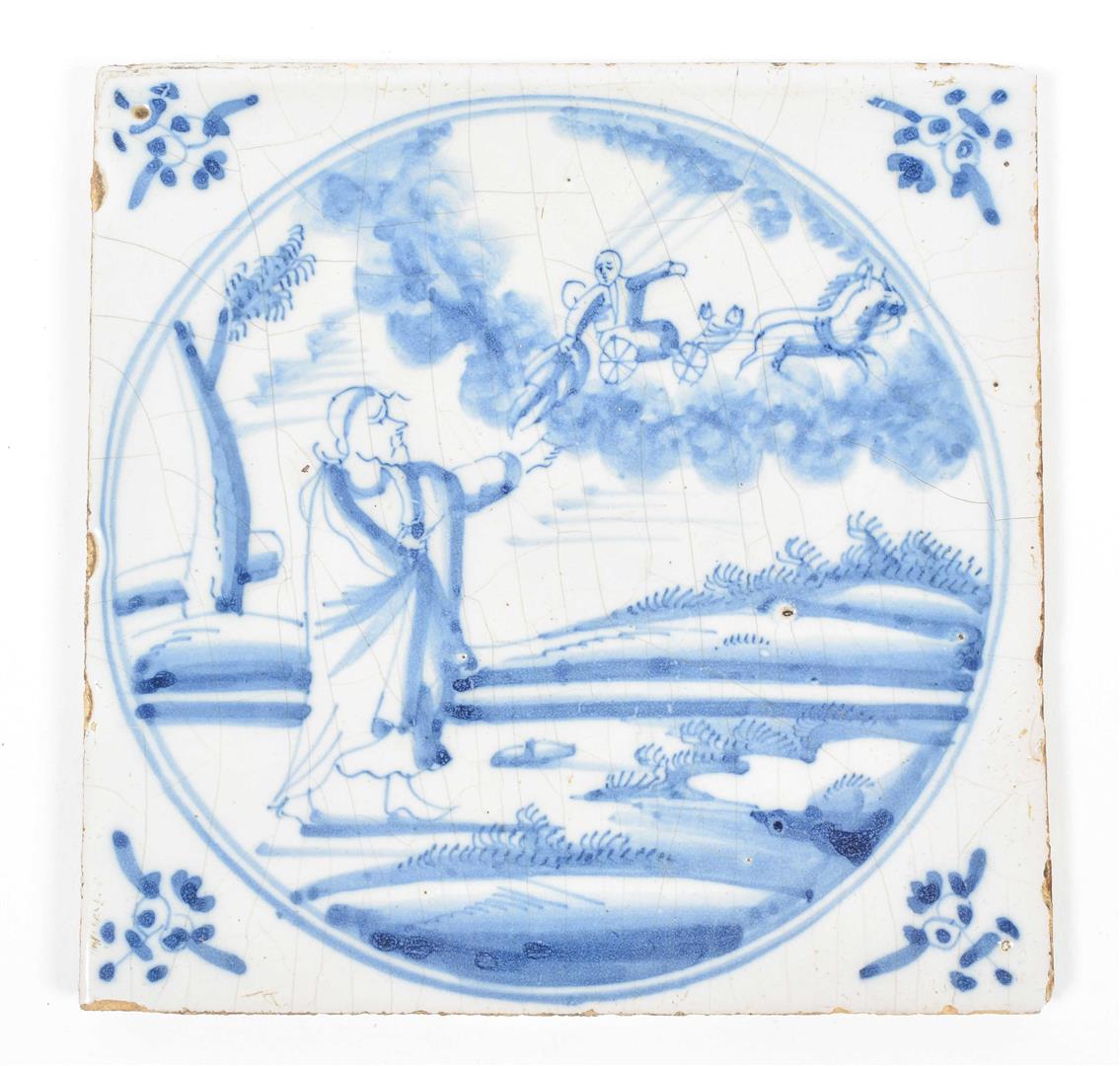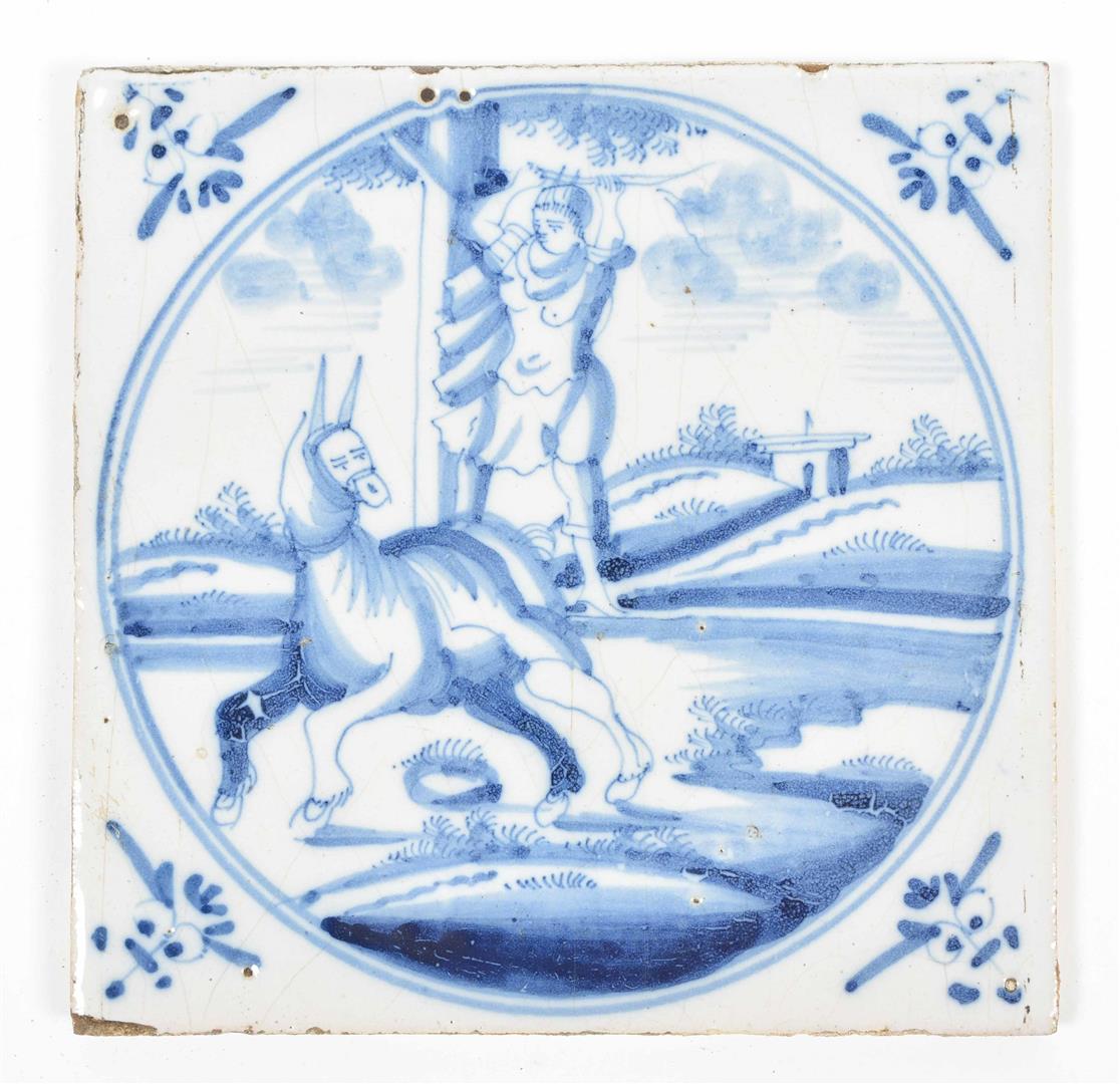 18th cent. 13 x 13 cm. Ceramic with blue and white tin glaze. Depictions of a.o. Elijah's chariot, Jacob and Esau and Jesus restoring a blind man's sight. Corner oxbow motif.