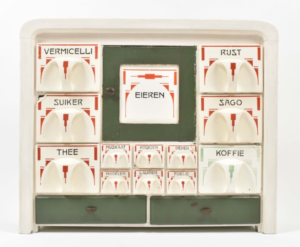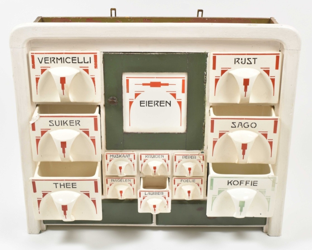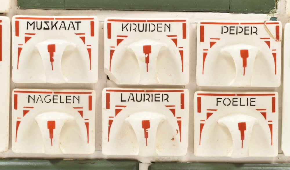 Early 20th cent. spice cabinet, Société Céramique Maastricht, containing 'Vermicelli, Eieren, Rijst, Sago, Koffie, Suiker, Thee, Muskaat, Kruiden, Peper, Nagelen, Laurier, Foelie'.