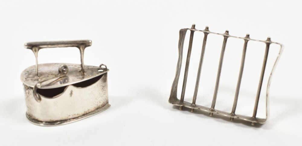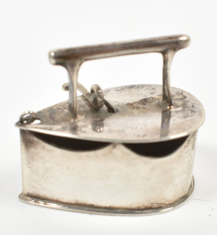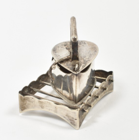 A miniature iron (approx. 3 x 2 x 2.5 cm) w. trivet (approx. 3.5 x 2.5 x 1 cm). Both marked w. Dutch sword. No master mark.