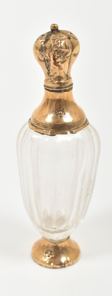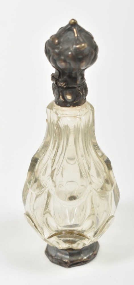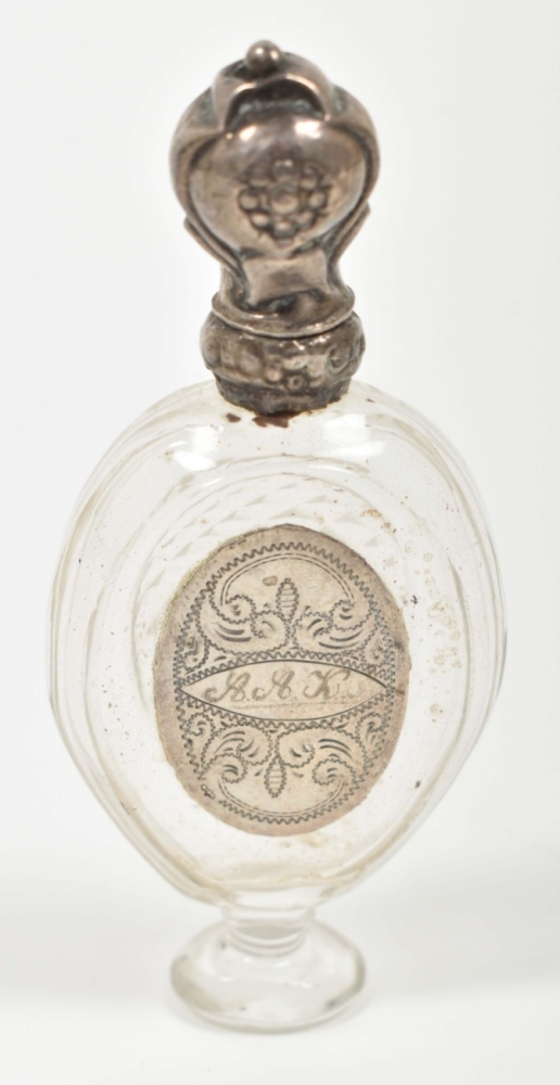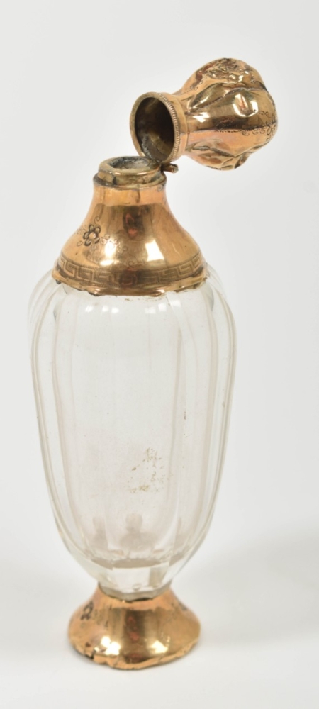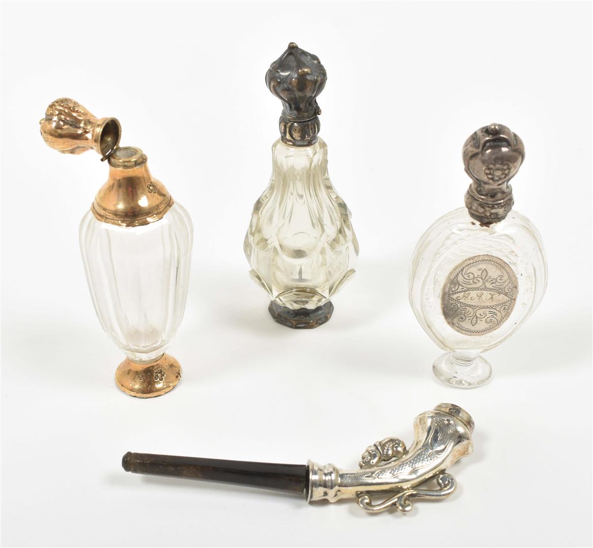 Collection of 3 bottles, 2 w. silver stand and neck and lid, 1 w. 14 karat stand and lid. All approx. 11 cm tall.