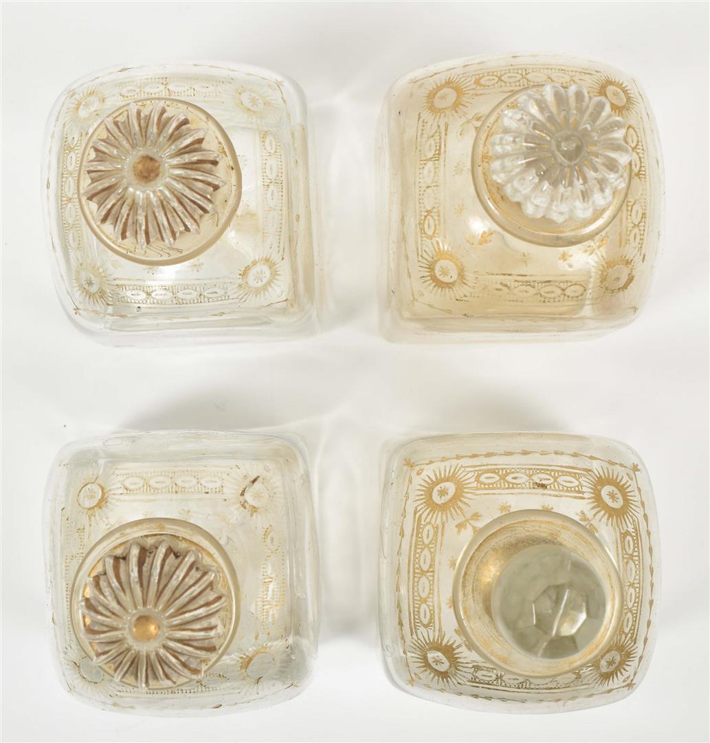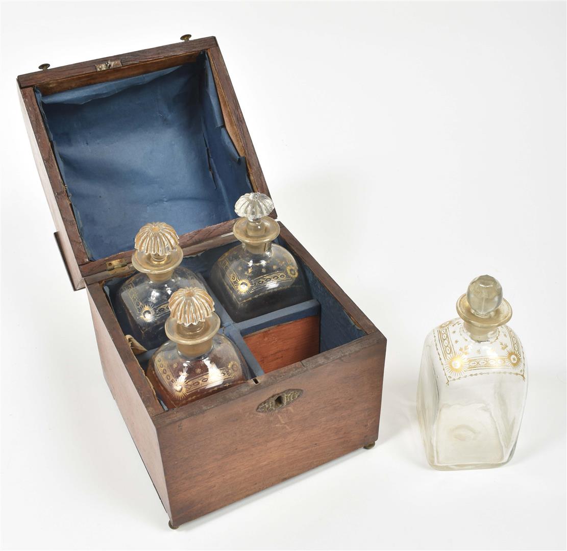 Wooden miniature desk liquor box w. 4 glass gilt dec. bottles. Approx. 18 x 18 x 23 cm.