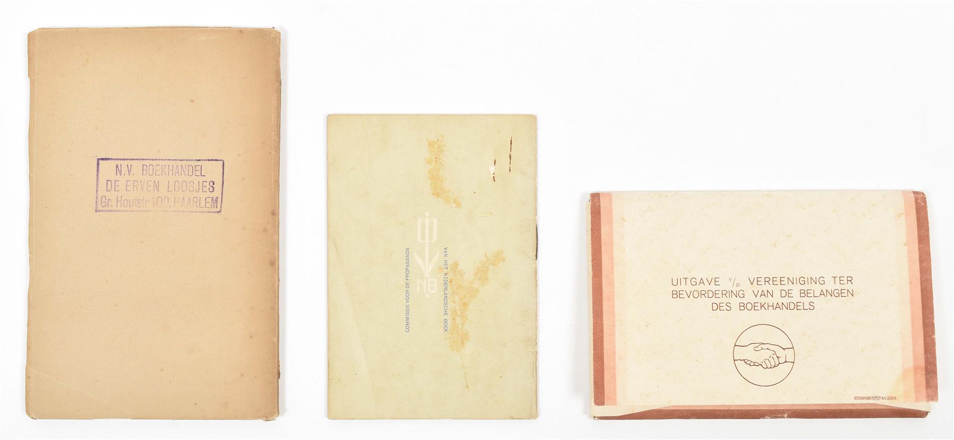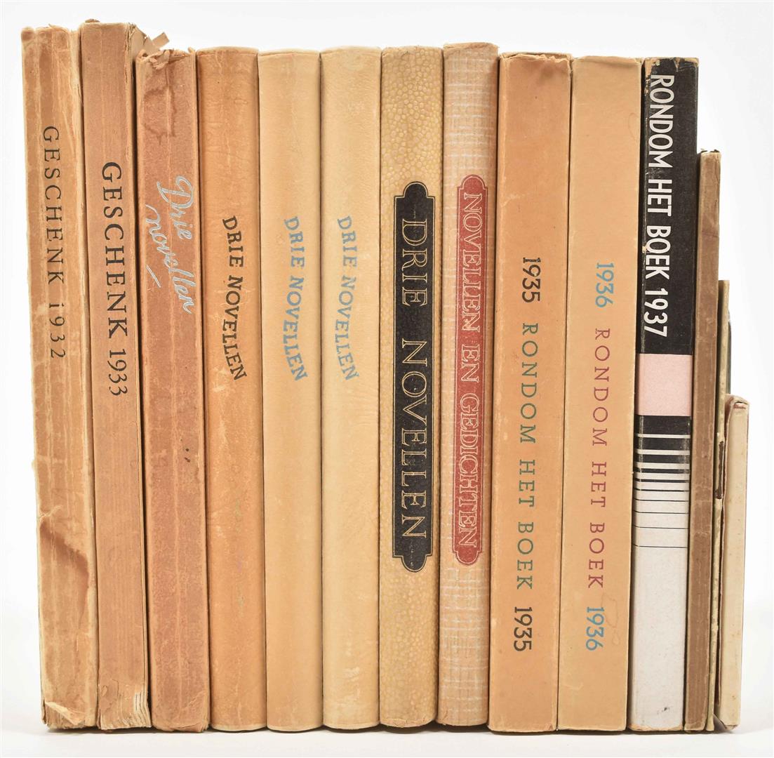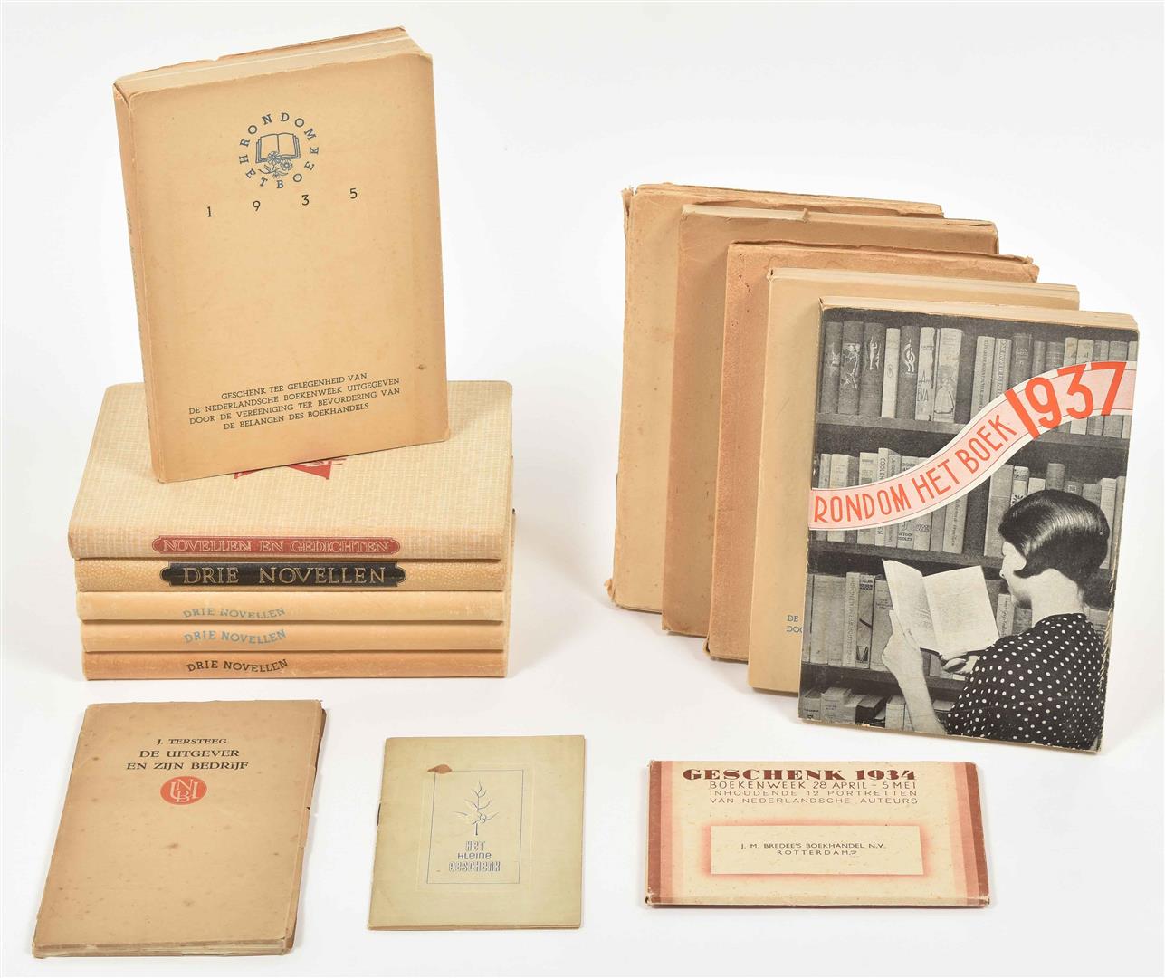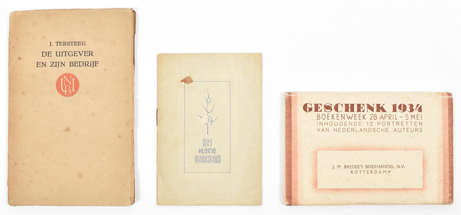 (1) J. Tersteeg. De uitgever en zijn bedrijf. Amst., Nederlandsche uitgeversbond, 1930. 70 p. Sc. Foxing. (2) Geschenk 1934. Boekenweek 28 April-5 mei. Inhoudende 12 portretten van Nederlandsche auteurs. Rott., J.M. Bredee's Boekhandel. Orig. envelope. 16 total portraits (some duplicates), complete w. 12 (different) portraits incl. a.o.: Diet Kramer, Leo Ott, Antoon Coolen, and Johan Fabricius. (3) Het kleine geschenk 1946. 32 p. Sc. -and 11 others, for the years 1932-3; 1935-41 (3 variants 1939).