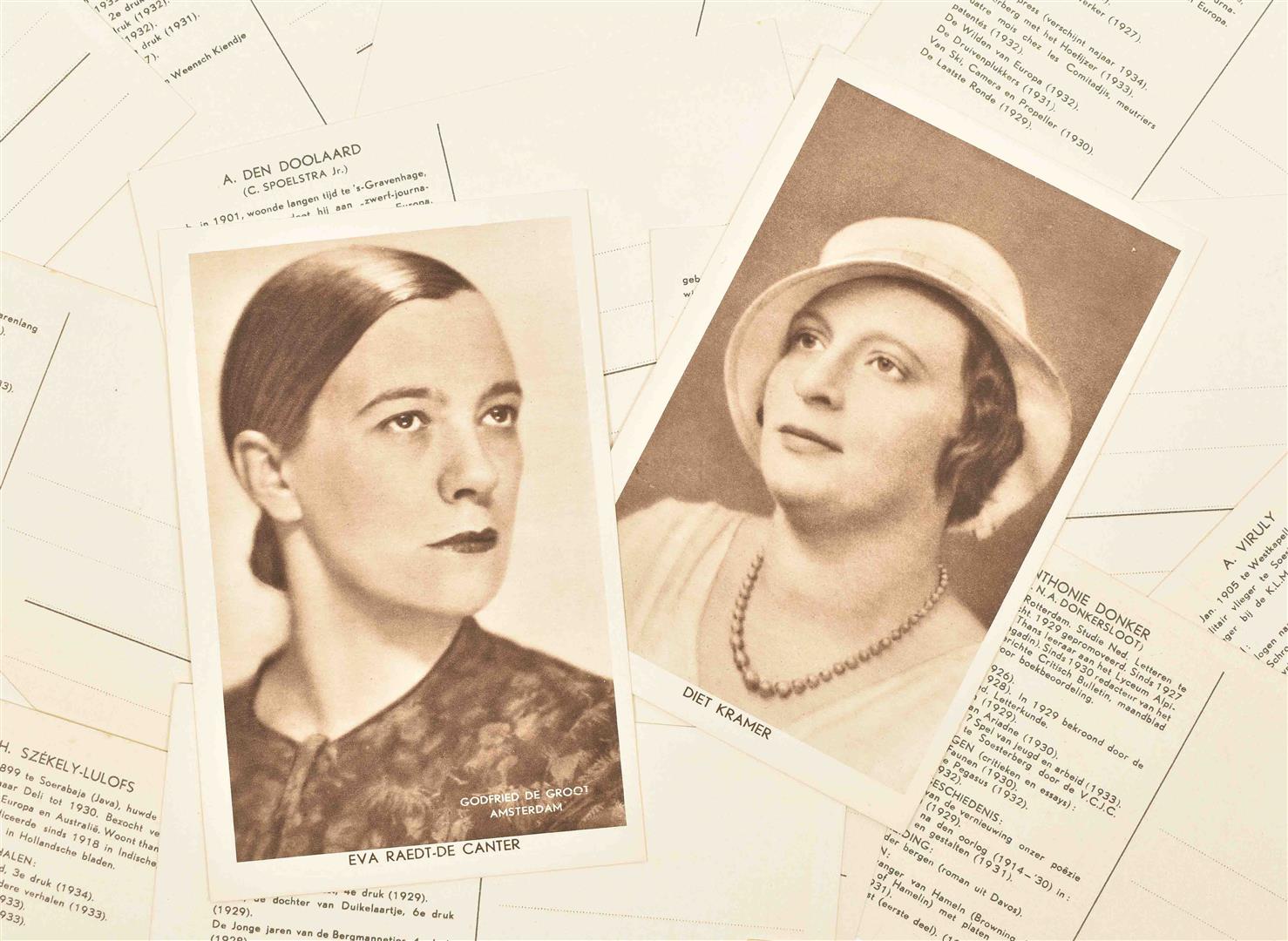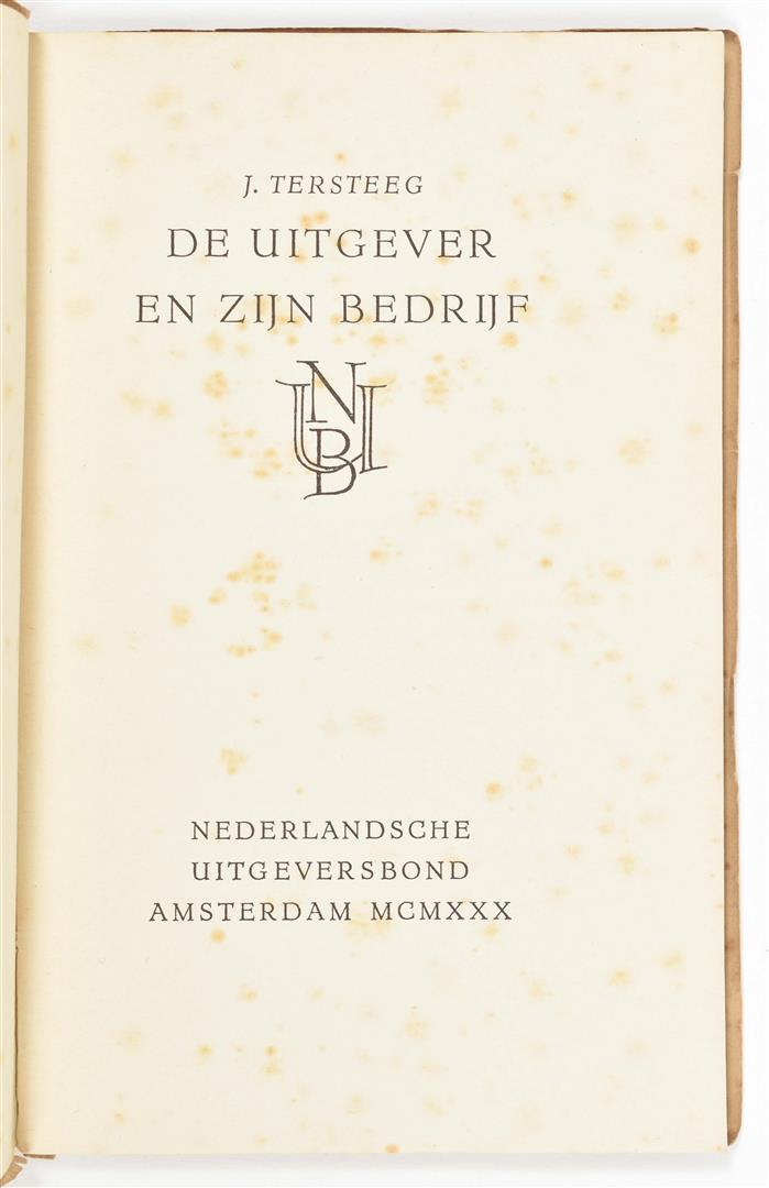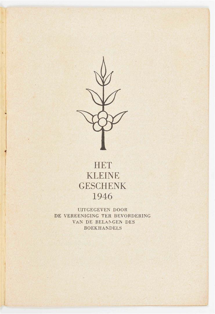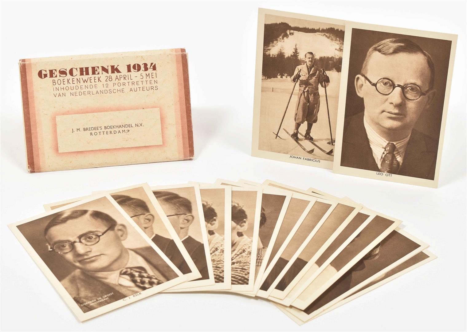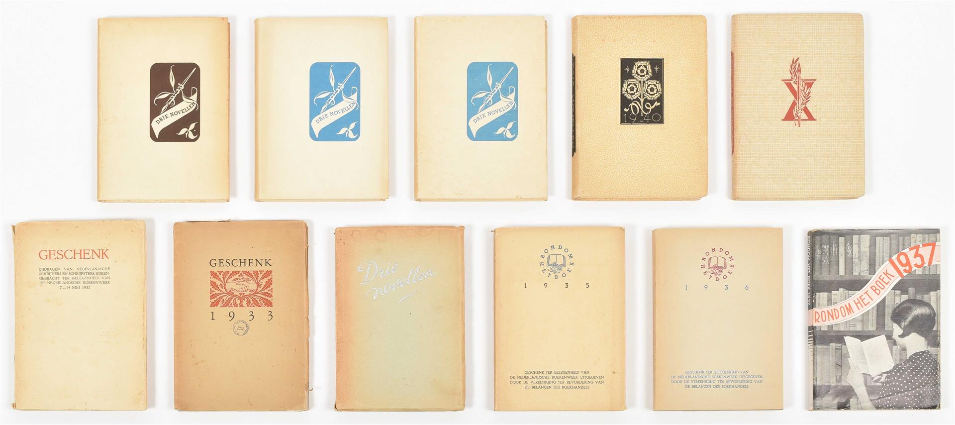 (1) J. Tersteeg. De uitgever en zijn bedrijf. Amst., Nederlandsche uitgeversbond, 1930. 70 p. Sc. Foxing. (2) Geschenk 1934. Boekenweek 28 April-5 mei. Inhoudende 12 portretten van Nederlandsche auteurs. Rott., J.M. Bredee's Boekhandel. Orig. envelope. 16 total portraits (some duplicates), complete w. 12 (different) portraits incl. a.o.: Diet Kramer, Leo Ott, Antoon Coolen, and Johan Fabricius. (3) Het kleine geschenk 1946. 32 p. Sc. -and 11 others, for the years 1932-3; 1935-41 (3 variants 1939).