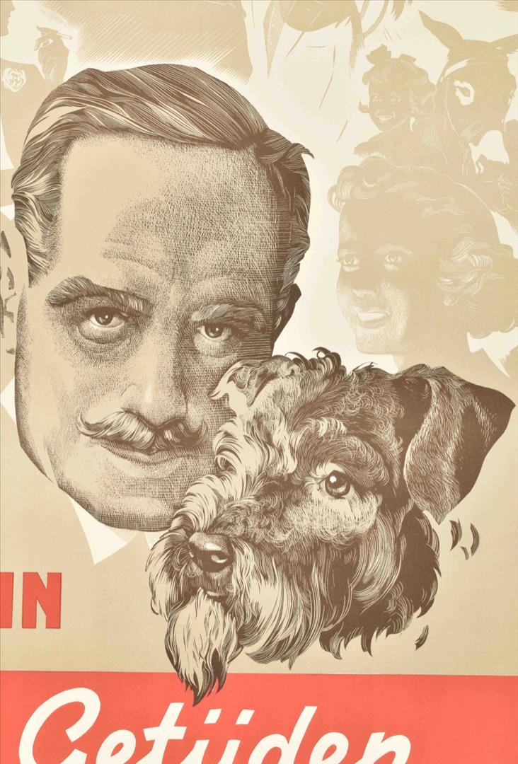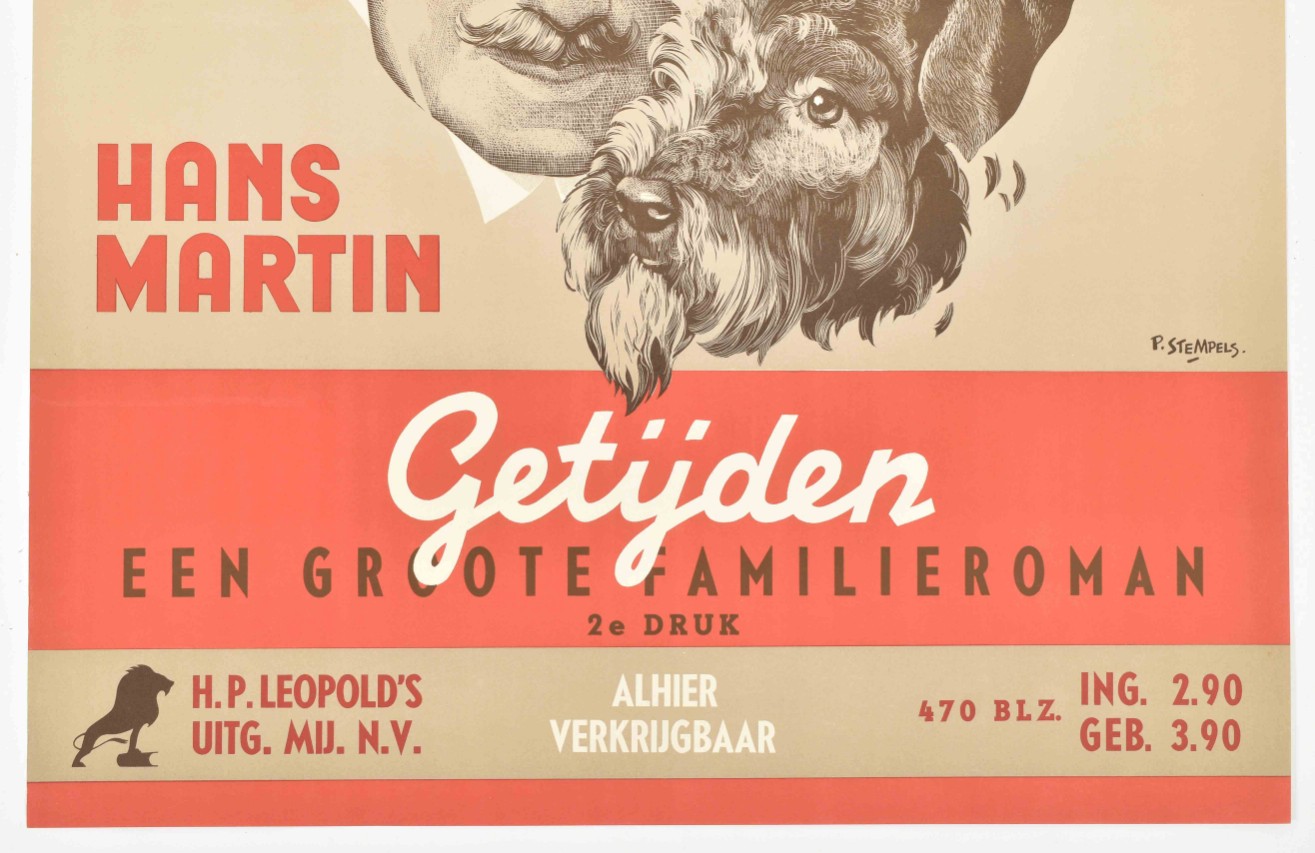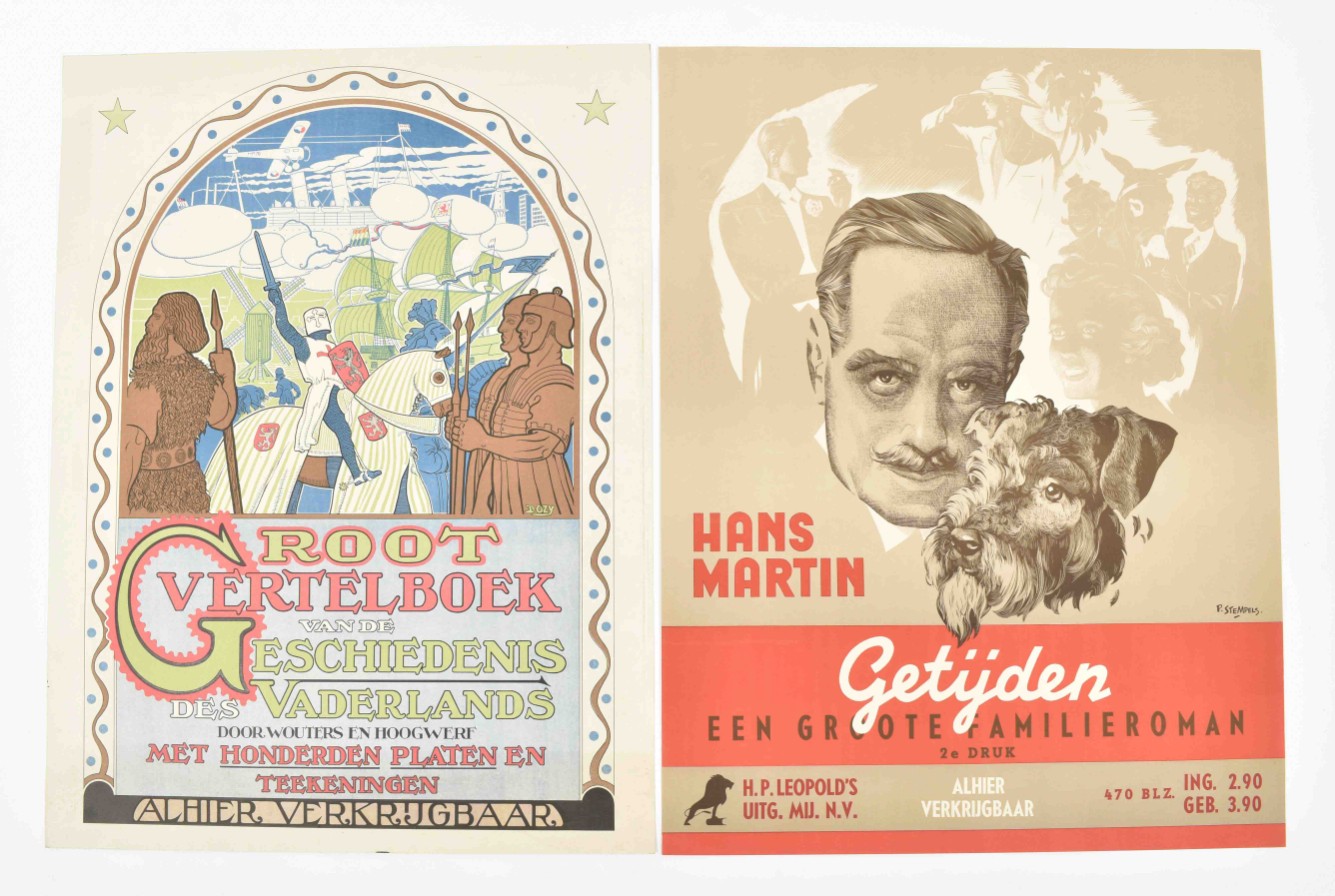Sl. dust soiled, minor crease in top blank margin. (2) Piet Stempels (first half 20th cent.). "Hans Martin. Getijden. Een grote familieroman. 2e Druk. Alhier verkrijgbaar." N.pl., H.P. Leopold's Uitg. Mij., n.d. (ca. 1939). Lithogr. poster printed in red, grey and black, signed "P. Stempels" in the image. 65 x 50 cm. Fine copy. (total 2)