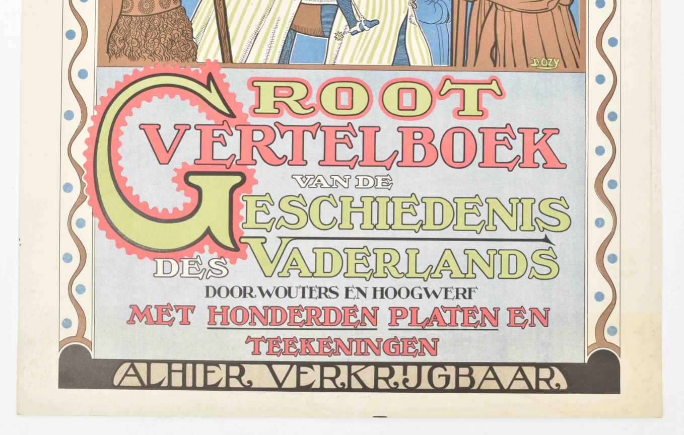 van de geschiedenis des vaderlands. Door (D.) Wouters en (J.) Hoogwerf. Met honderd platen en teekeningen. Alhier verkrijgbaar." Printed for Noordhoff in Groningen, ca. 1928. Col. lithogr. poster on stiff paper, signed "Dozy" in the image. 65 x 49 cm.