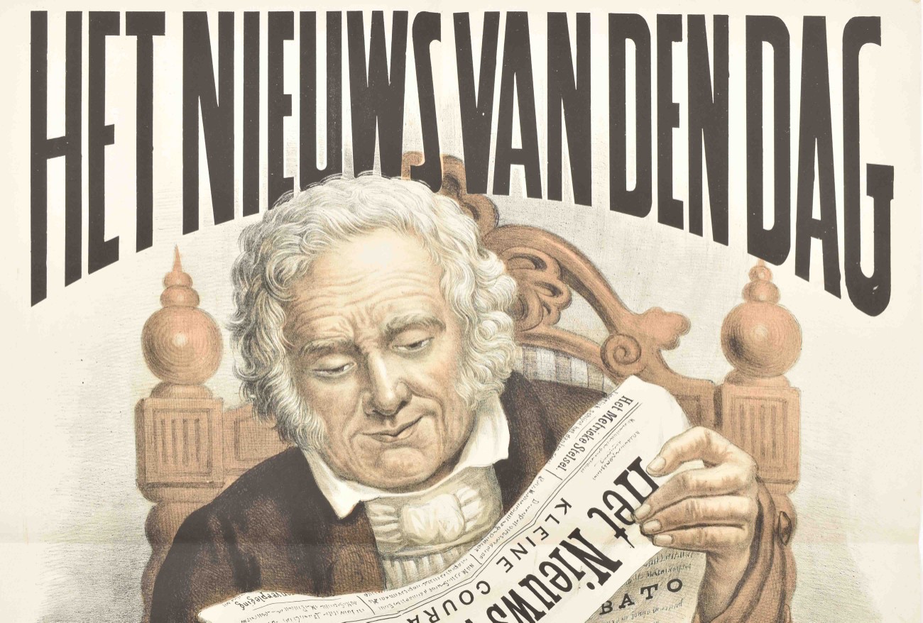 Voor 15 cent per week ontvangt men dit dagblad dadelijk na de uitgave in eigendom. Men abonneert zich aan het Bureel te Amsterdam, Warmoesstraat no. 606 en verder bij alle boekhandelaren in Nederland." Haarlem, Emrik & Binger for Algemeene Stoomdrukkerij van Gebroeders Binger in Amst., n.d. (ca. 1875). Lithogr. poster printed in brown and black. 70 x 60 cm.