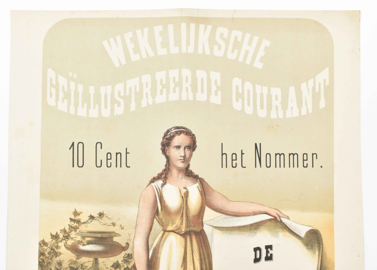 Folded, a few imperfections, but a very good copy for such a fragile, large sheet. (2) "De Hollandsche Illustratie. Wekelijksche Geïllustreerde Courant. 10 Cent het Nommer. (On attached letterpress sheet): Bij Abonnement voor den compleeten Jaargang van 52 nommers is de prijs slechts f 3,90." Ibid., idem, ca. 1885. Col. lithogr. poster. 64 x 48 cm (total height incl. attached sheet 76.5 cm). Folded, sl. foxed, 2 sm. marginal tears. (total 2)