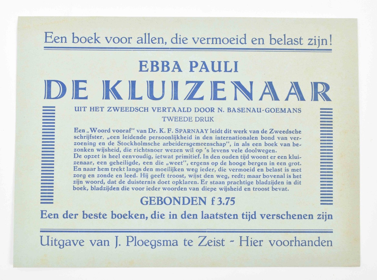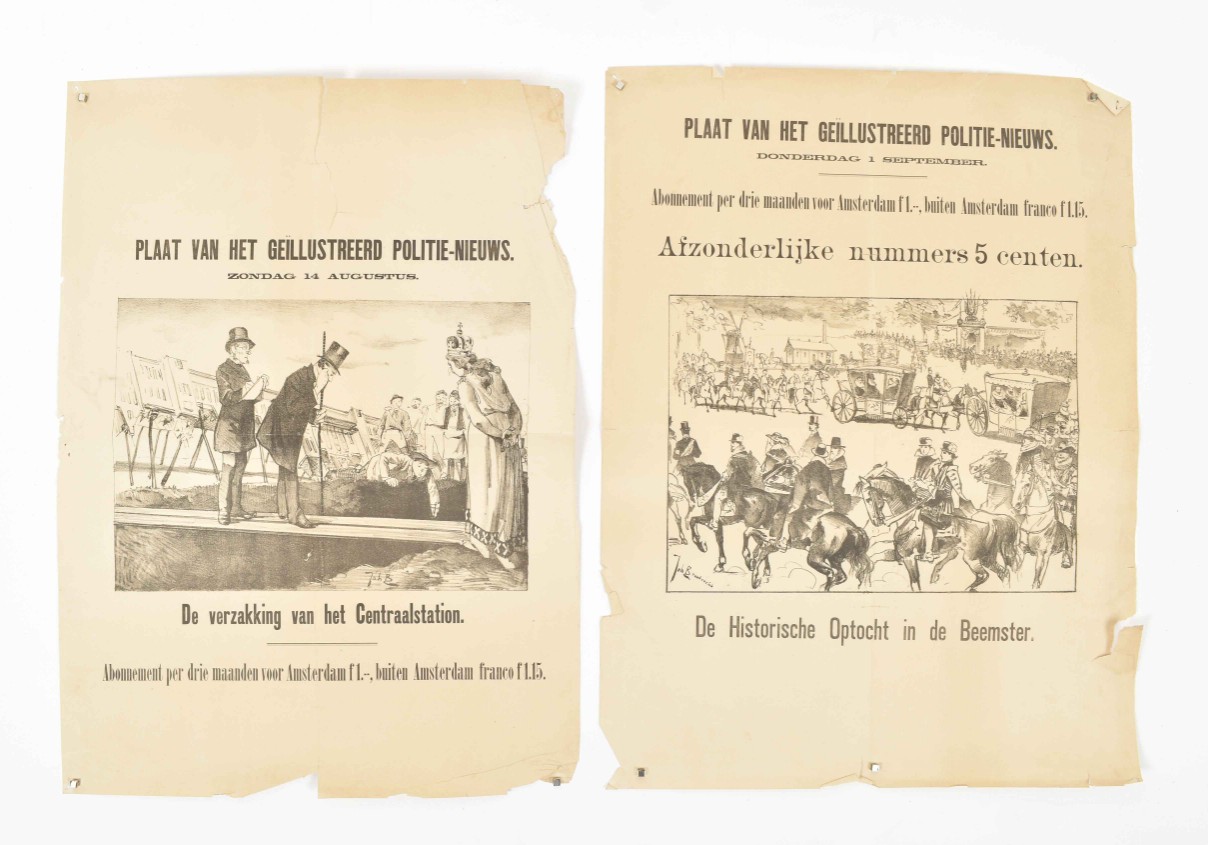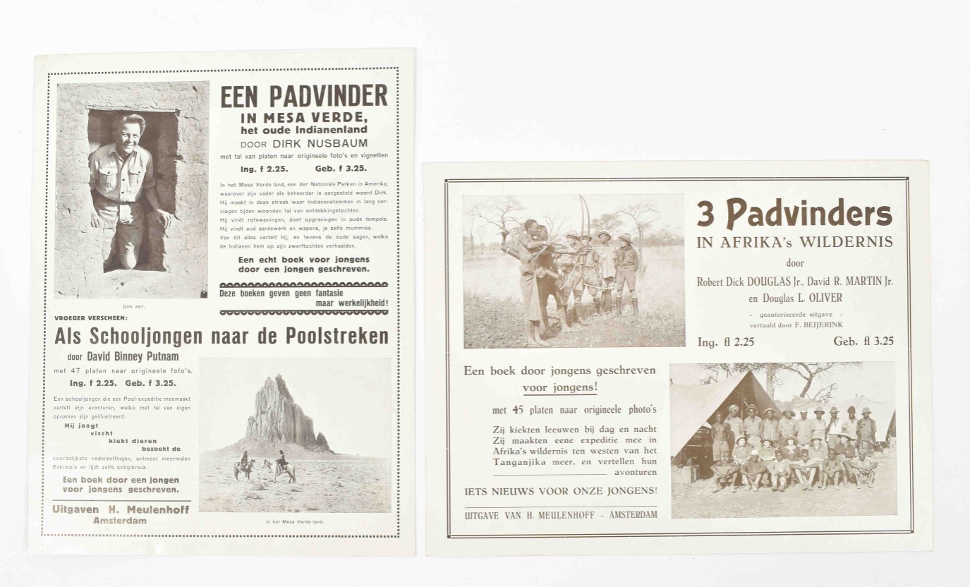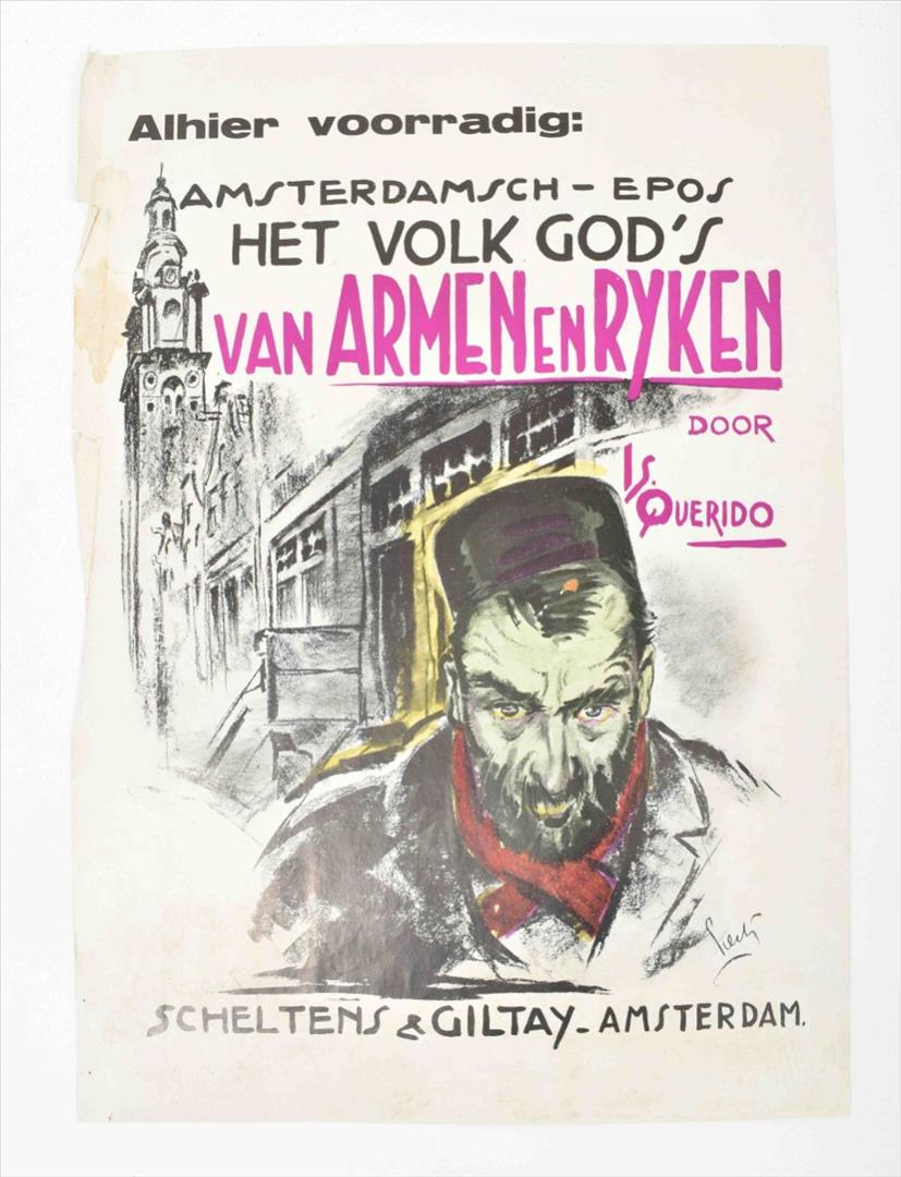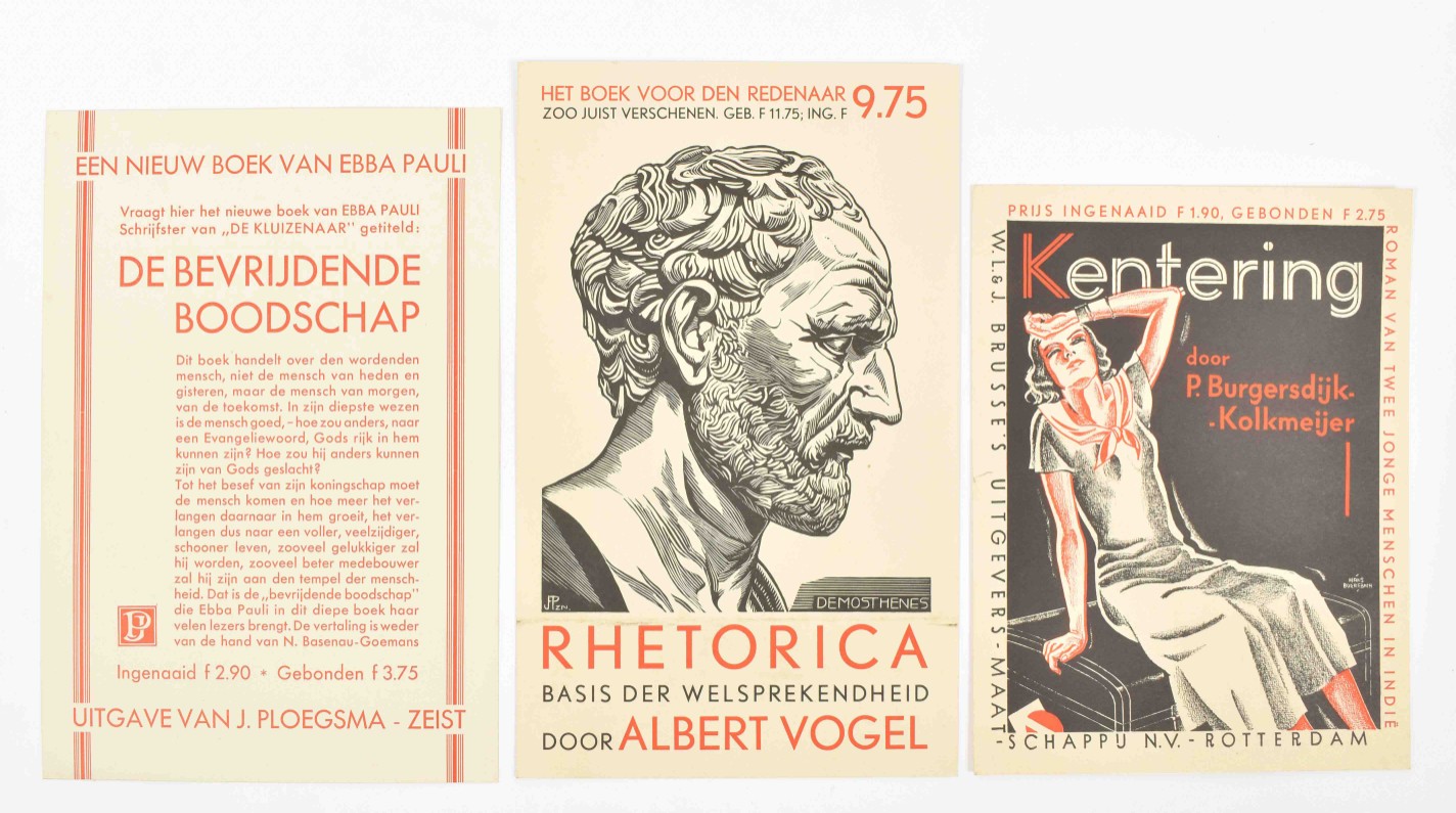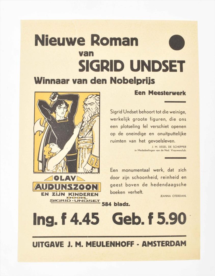 Middle fold. (2) "Alhier voorradig: Amsterdamsch-epos Het volk God's. Van Armen en Rijken door Is. Querido." Amst., Scheltens & Giltay, n.d. (1931). Col. offset poster w. large ills. by Pieck (Adri Pieck?). 55 x 39.5 cm. Left margin stained and w. folds/ sm. tears. (3) "Nieuwe roman van Sigrid Undset. Winnaar van den Nobelprijs. Een meesterwerk. Olav Audunszoon en zijne kinderen. (...) 584 bladz. Ing. f. 4.45 Geb. f. 5.90." Amst., J.M. Meulenhoff, n.d. (1931). Letterpress poster w. tinted woodcut ills. by M.D. Lapthorn. 40 x 30 cm. Sm. tear in top margin. -and 8 others, incl. prospectuses for Kentering by P. Burgersdijk-Kolkmeijer (1931), Rhetorics, basis der welsprekendheid by Albert Vogel (1931), 2 works by Ebba Pauli and 2 posters titled "Plaat van het Geïllustreerd Politienieuws" incorp. lithogr. ills. by Johan Braakensiek. (total 11)