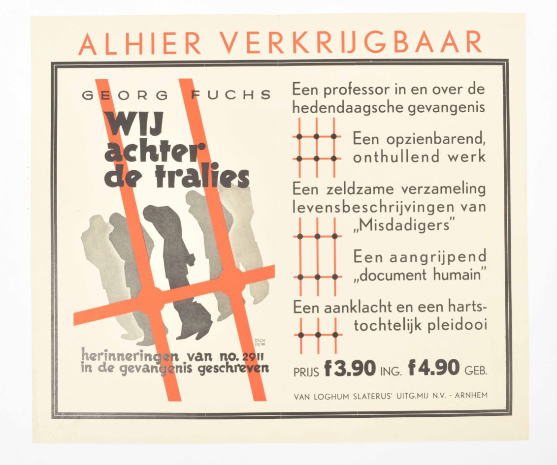 Wij achter de tralies. Herinneringen van no. 2911 in de gevangenis geschreven. Prijs f. 3.90 ing. f 4.90 geb." Arnhem, Van Loghum Slaterus, n.d. (1931). Letterpress poster w. ills. (frontwr.?) by Dick Dew. 32 x 37 cm.