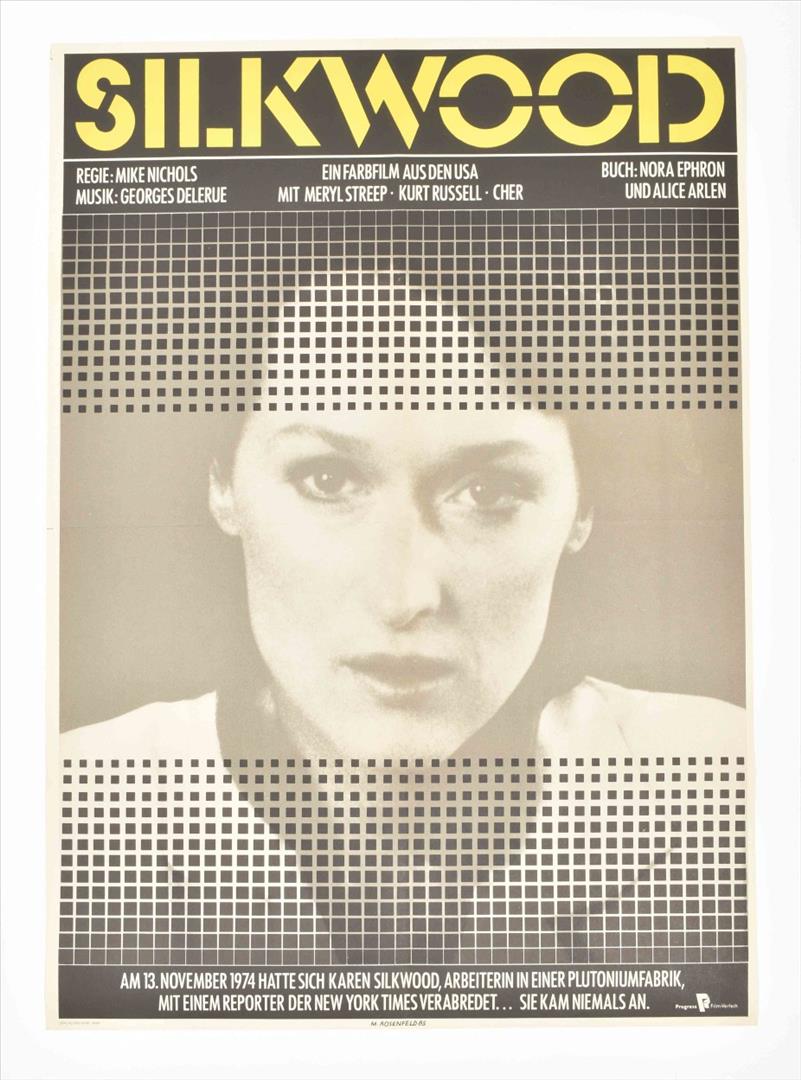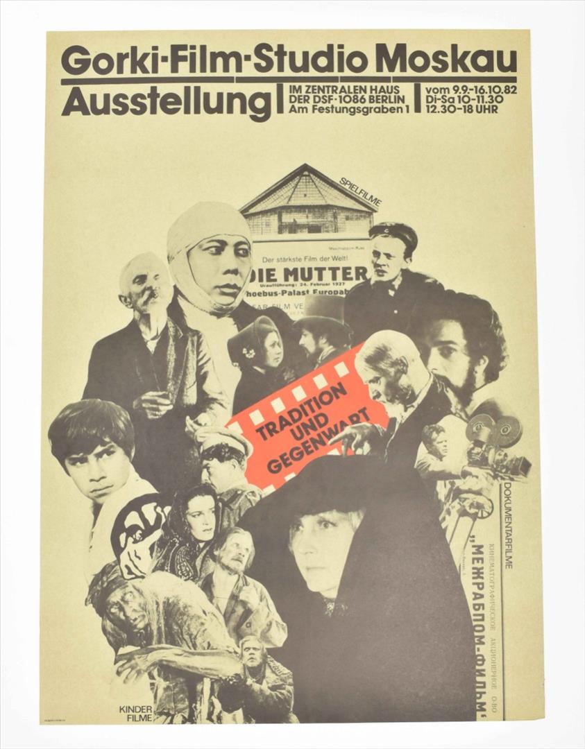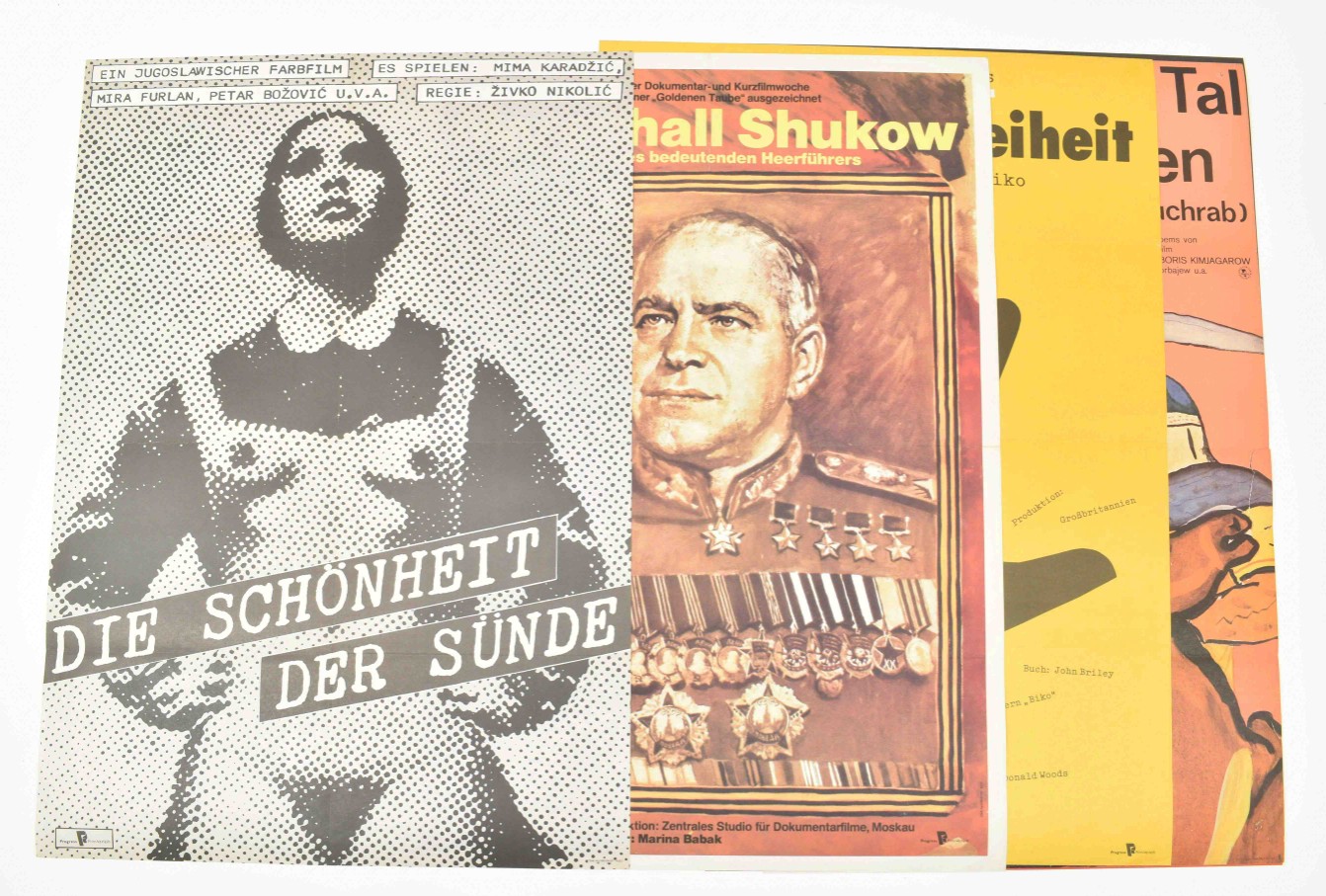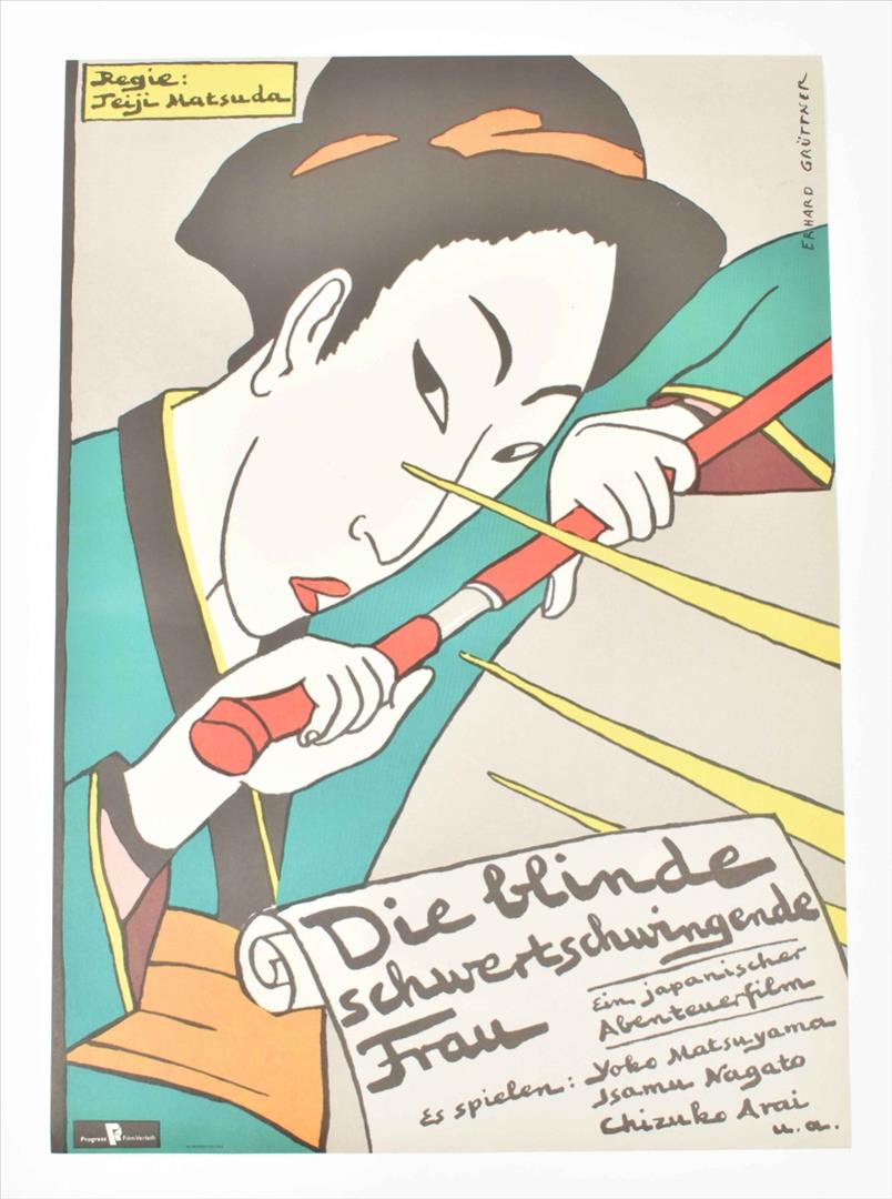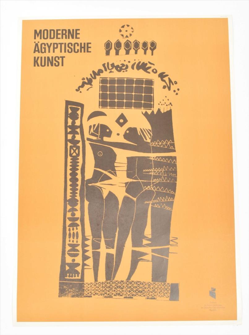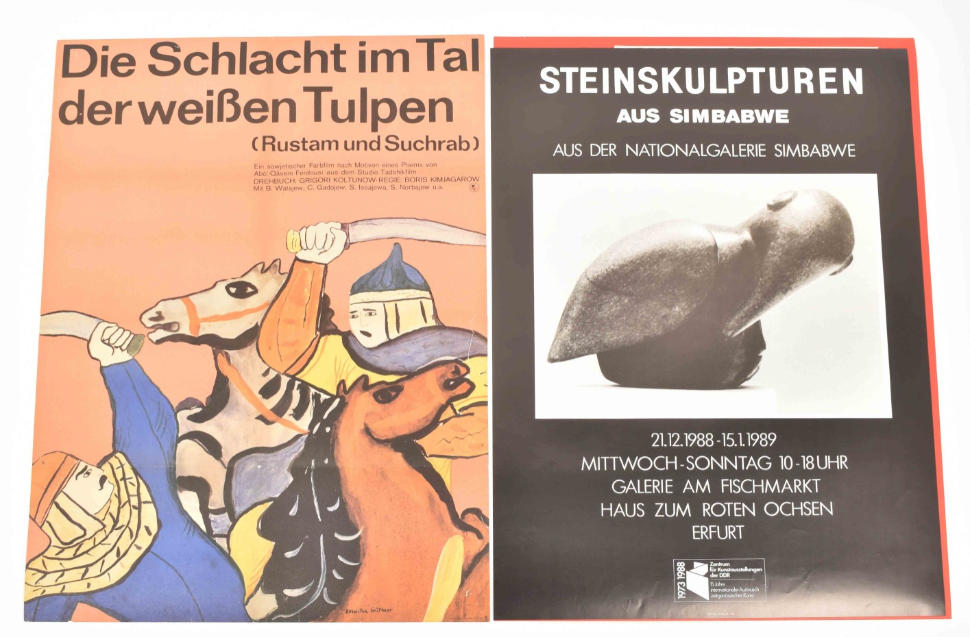 (2) Moderne Ägyptische Kunst. Zentrum für Kunstausstellungen der Deutschen Demokratischen Republik, ca. 1980. Silkscreen. 81.5 x 57.5 cm. (3) Gorki Film Studio Moskau Ausstellung. Tradition und Gegenwart. Berlin, 1982. 81.5 x 57.5 cm. (4) Silkwood. Ein Farbfilm aus den USA mit Meryl Streep. Des. by M. Rosenfeld. Berlin, Film-Verleih, 1985. Offset, 81.5 x 57.5 cm. (5) Die blinde schwertschwingende Frau. Des. by Erhard Grüttner. Berlin, Film-Verleih, 1986. Silkscreen. 81.5 x 57.5 cm. -and 7 other art exhibition and movie posters. (total 12)