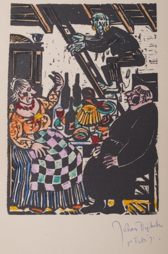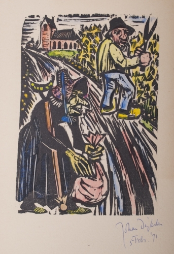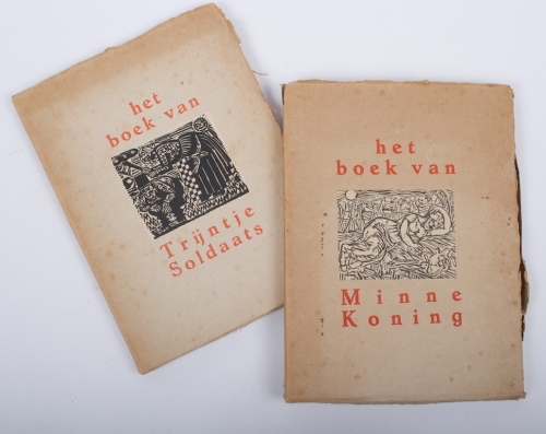 Groninger Volksvertellingen door Mevrouw E.J. Huizenga-Onnekes. First and second vols. With prints and initials cut in wood by Johan Dijkstra. Groningen, P. Noordhoff. Both copies have a coloured in page - and more recent (1971) signature by Dijkstra.