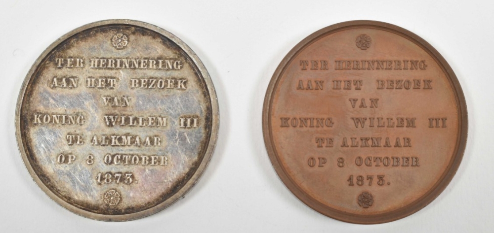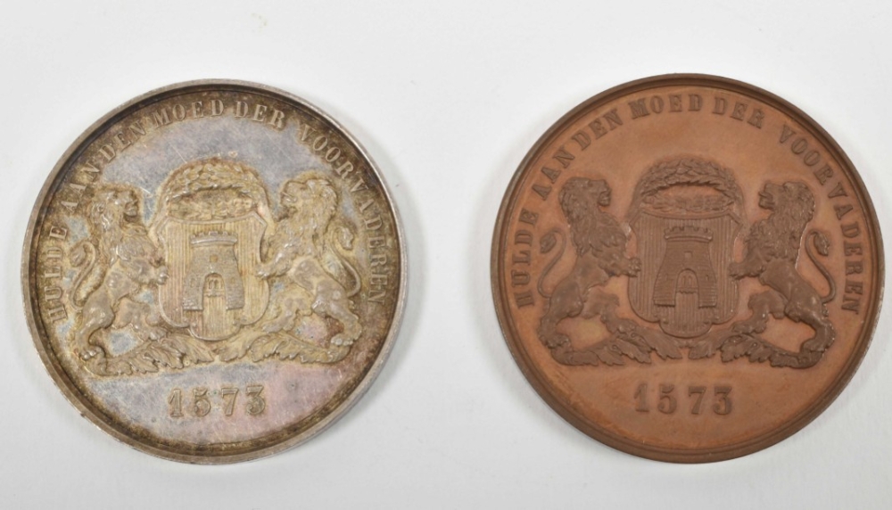 2 commemorative medals, 1 bronze, 1 silver. For the occasion of the 3rd centenary of the liberation of the city. Front w. 7 lines of text, reverse with coat of arms of Alkmaar and 2 lions as shield holders. Both approx. 35 mm. Rare in silver.