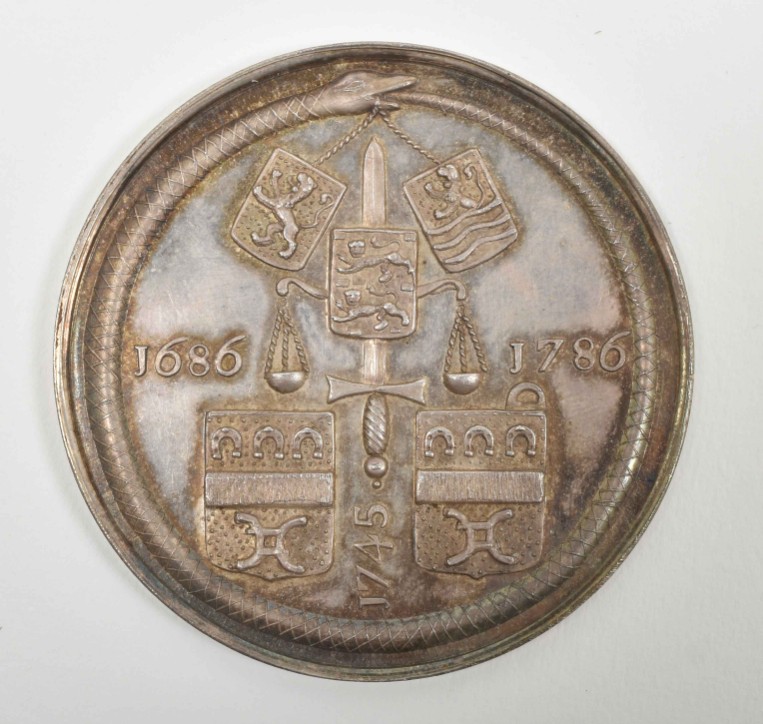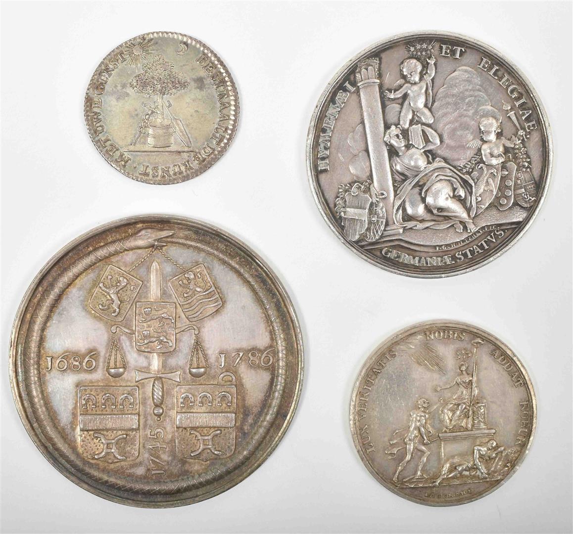 (1) "Anton and Wigbold Slicher gedurende 100 jaar Raadsheren bij de Hoven van Holland, Zeeland en West-Friesland". 1786. Silver. 53 mm. (2) Front: Pillar w. figures and 4 coats of arms. Reverse: ships at sea, figure and VOC flag. J.G. Holtzhey, 1768. Silver. 44 mm. (3) "Bestraalt de kunst met uwe gunst". On the entry of William V and queen Wilhelmina in Amsterdam, May 30 1768. Silver. 27 mm. -and 1 more.