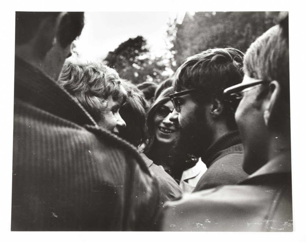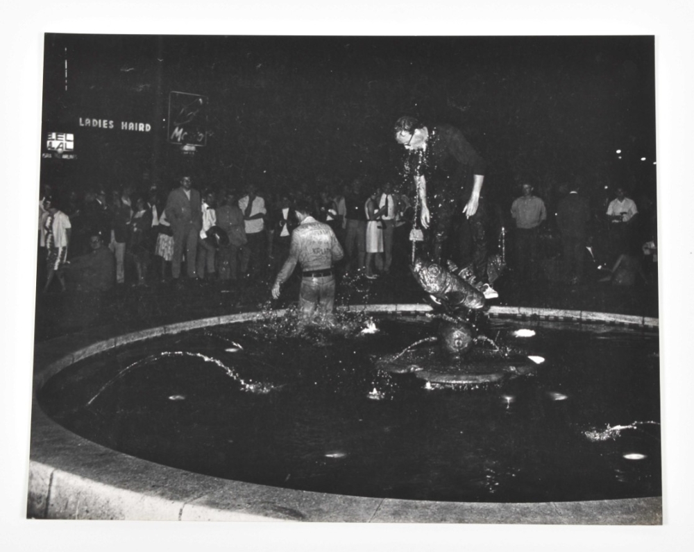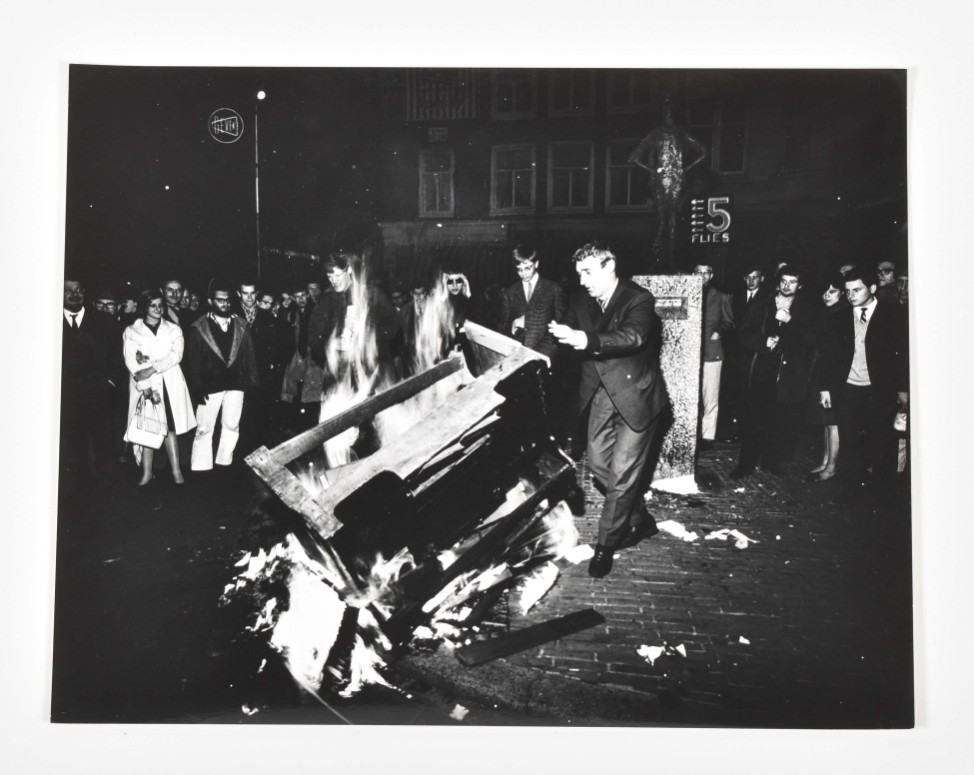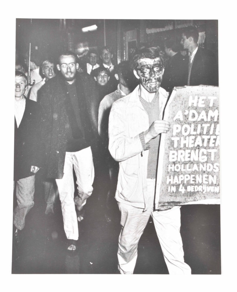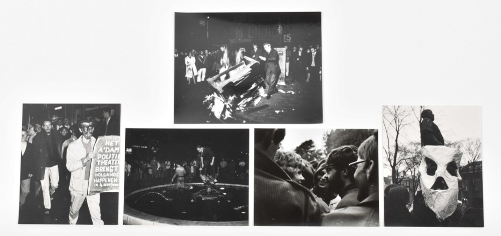 1965. 1 photo of people burning a crate, another of a person w. a painted face holding a sign. Vintage silver gelatine prints, one 20 x 25 cm, the other 23 x 30. Both w. stamp Cor Jaring verso. Added: 1 photo of a provo protest in front of the American Hotel on Leidseplein, 1966, of protestors playing in the fountain. Vintage silver gelatine print, 20 x 25 cm, stamp Cor Jaring verso. -and 2 other photos of provo protests by Jaring.