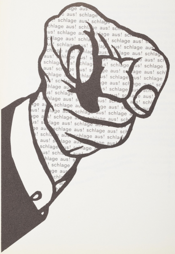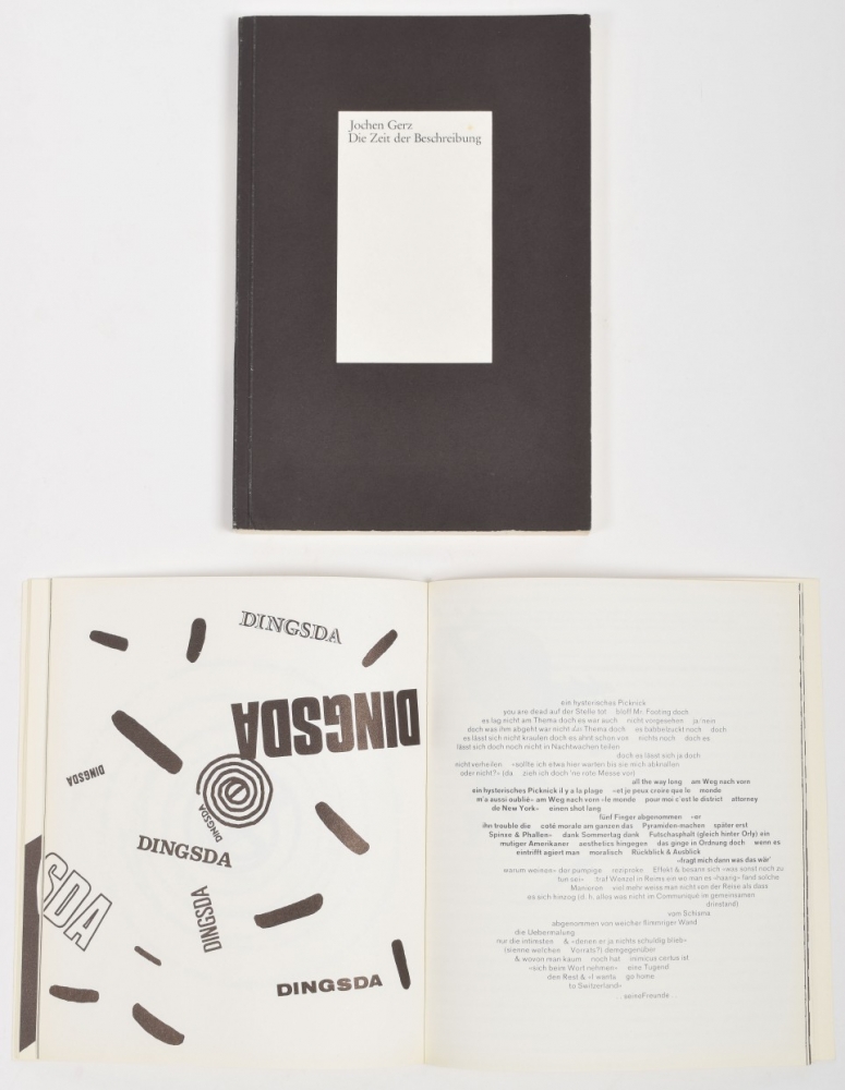 Four publications by Jochen Gerz. Includes Footing, featuring concrete poetry in b/w with glassine sheet inserts. Released by Anabas Verlag in 1969. 80 pp.