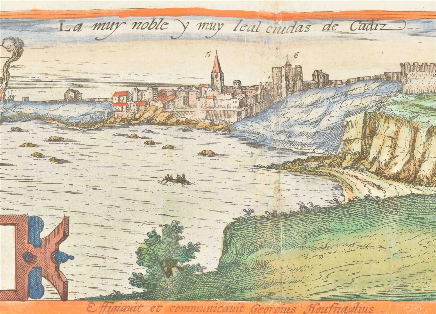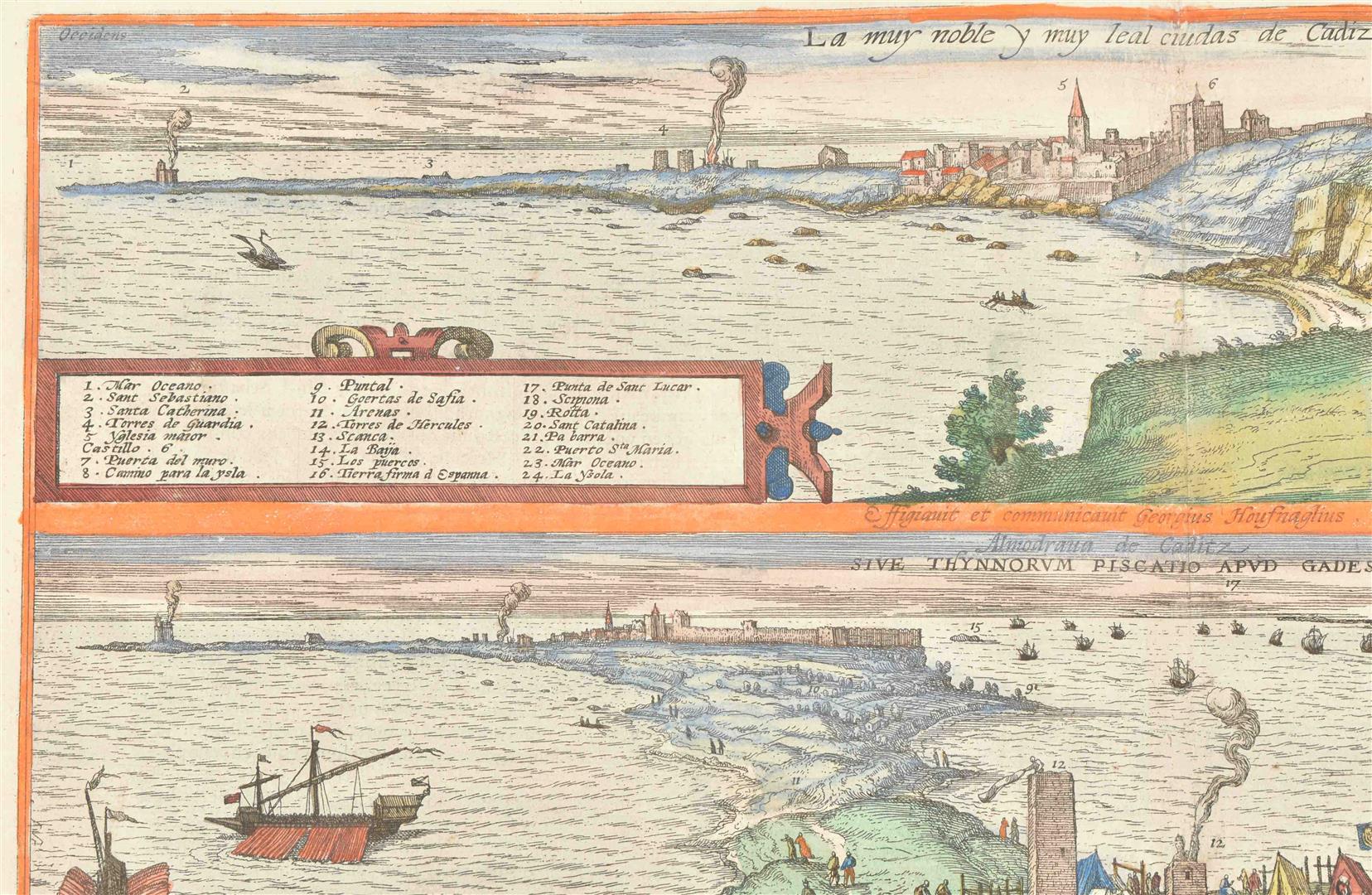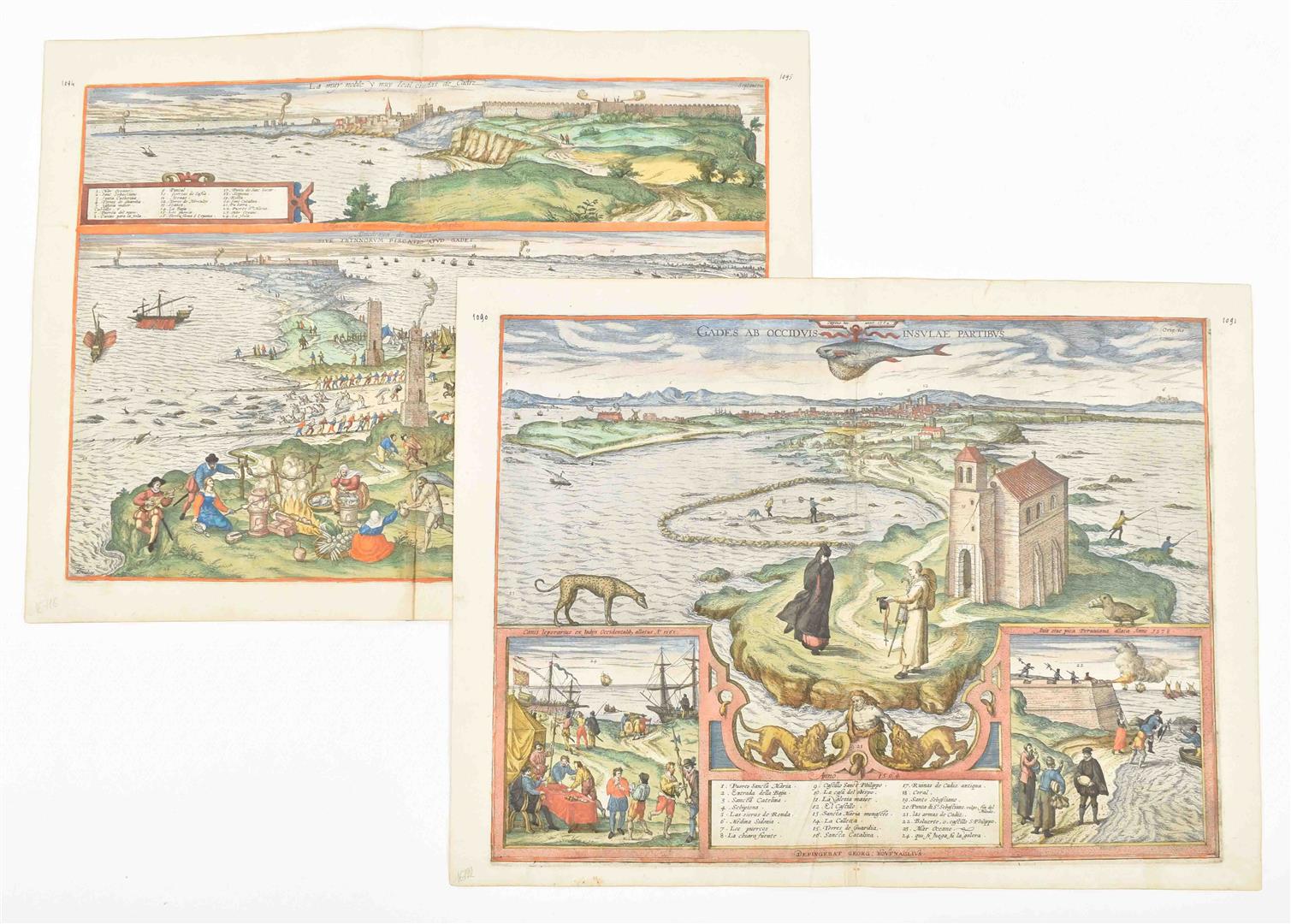Handcol. etched view of Cadiz after a painting by Joris Hoefnagel, 37 x 49 cm, w. large inset historical scenes in lower corners, dated "Captus hic anno 1564" in the plate at the top, "Depingebat Georg. Houfnaglius" in the plate in lower margin, from a French language ed. of Braun & Hogenberg, ca. 1600. V.d. Krogt IV, 711. -and a similar leaf w. 2 handcol. views of Cadiz, from the same copy of the same work.