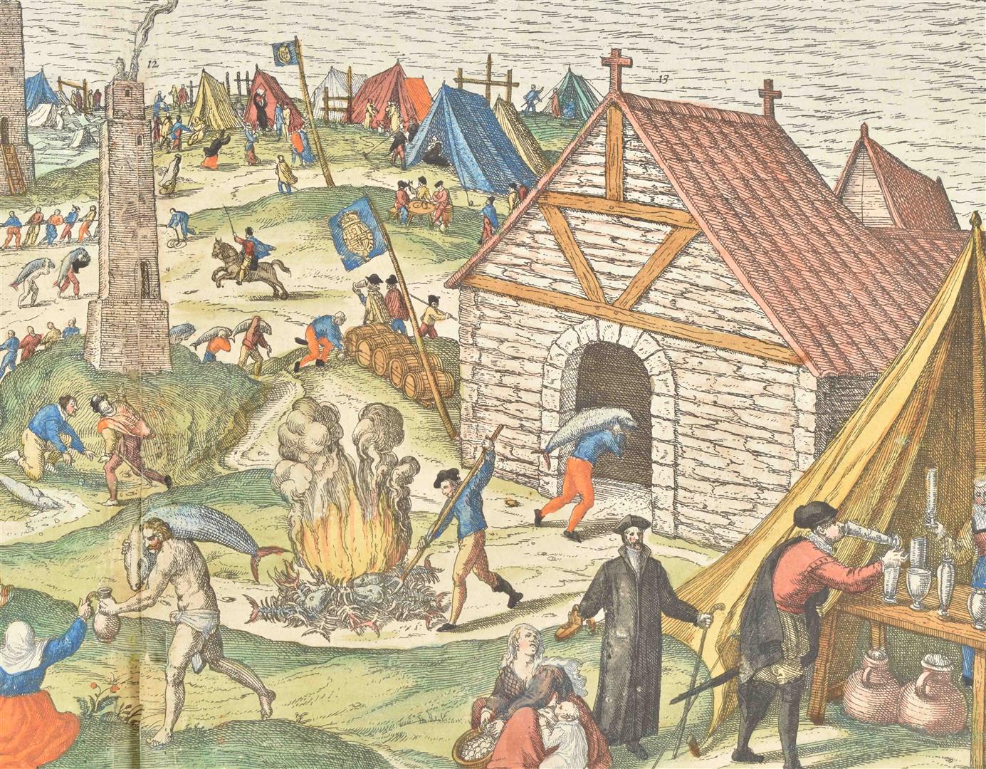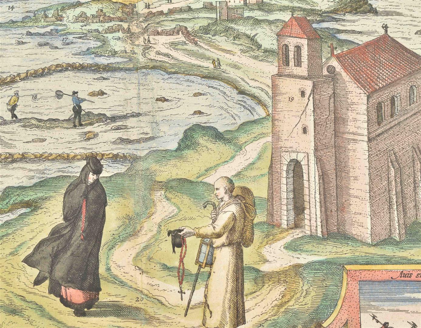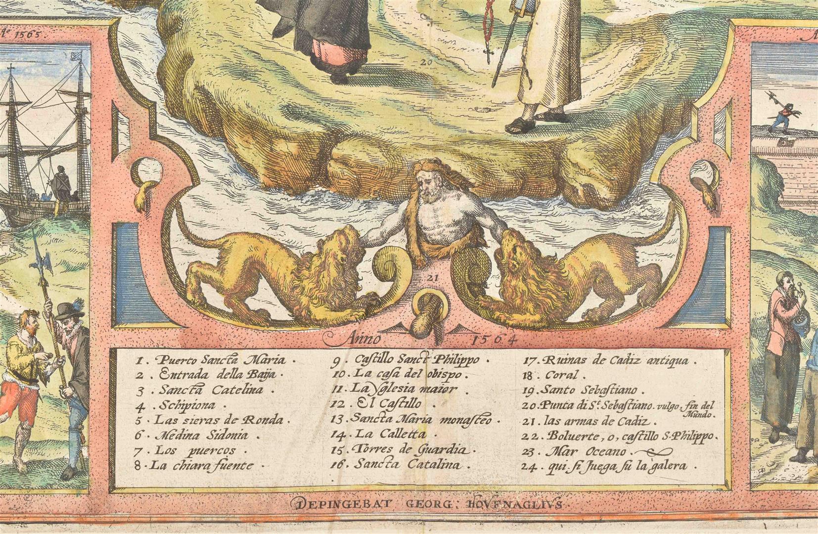 Handcol. etched view of Cadiz after a painting by Joris Hoefnagel, 37 x 49 cm, w. large inset historical scenes in lower corners, dated "Captus hic anno 1564" in the plate at the top, "Depingebat Georg. Houfnaglius" in the plate in lower margin, from a French language ed. of Braun & Hogenberg, ca. 1600. V.d. Krogt IV, 711. -and a similar leaf w. 2 handcol. views of Cadiz, from the same copy of the same work.