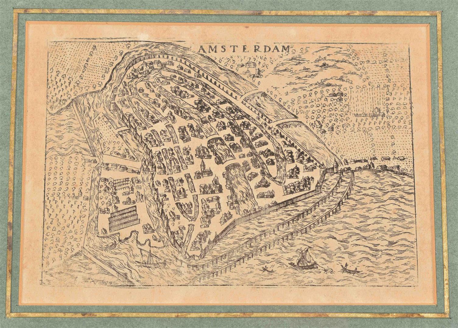 W. ships on the IJ; in the foreground is Neptune on a shell drawn by 2 seahorses and a mythological figure nursing 2 children next to a deer and a cow. Copper engr., ca. 1723. 14 x 17 cm. Added: Sm. bird's-eye plan of Amst. Copper engr., 18th cent. 9.5 x 13.5 cm.