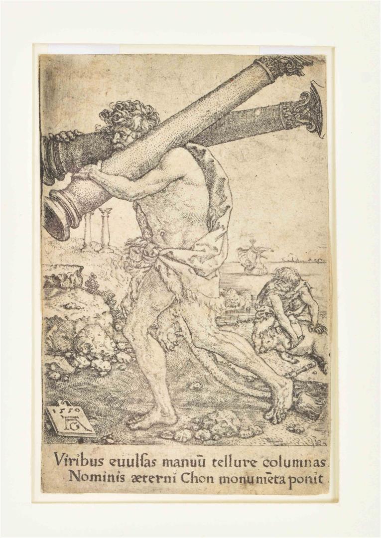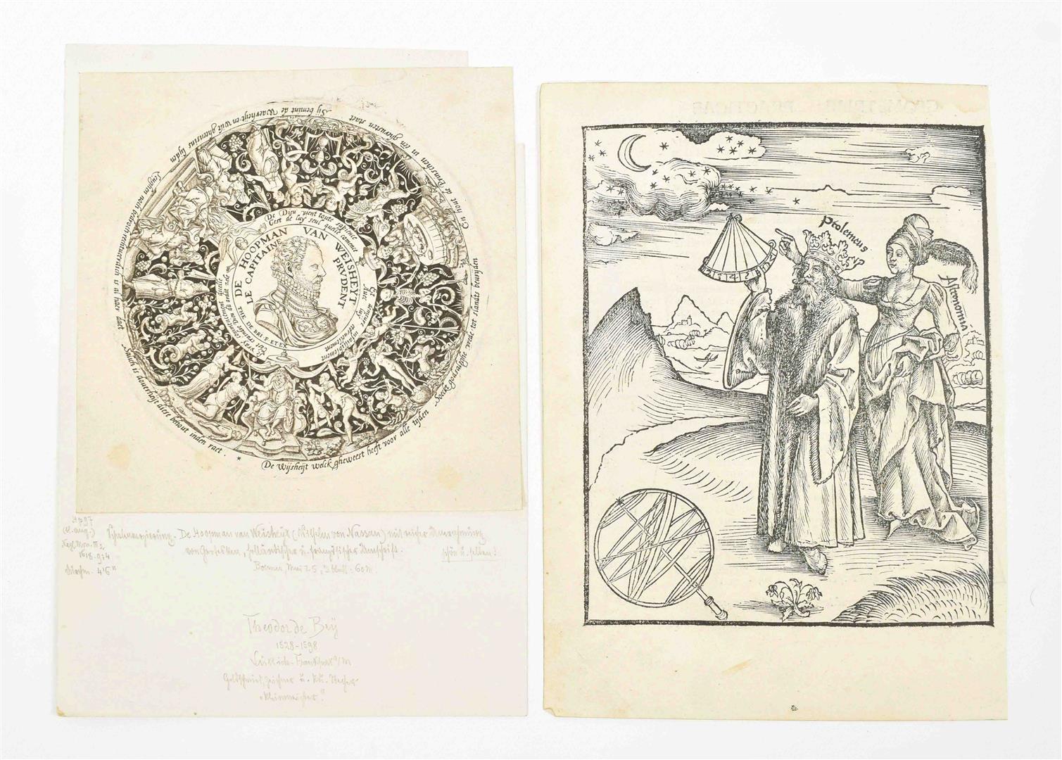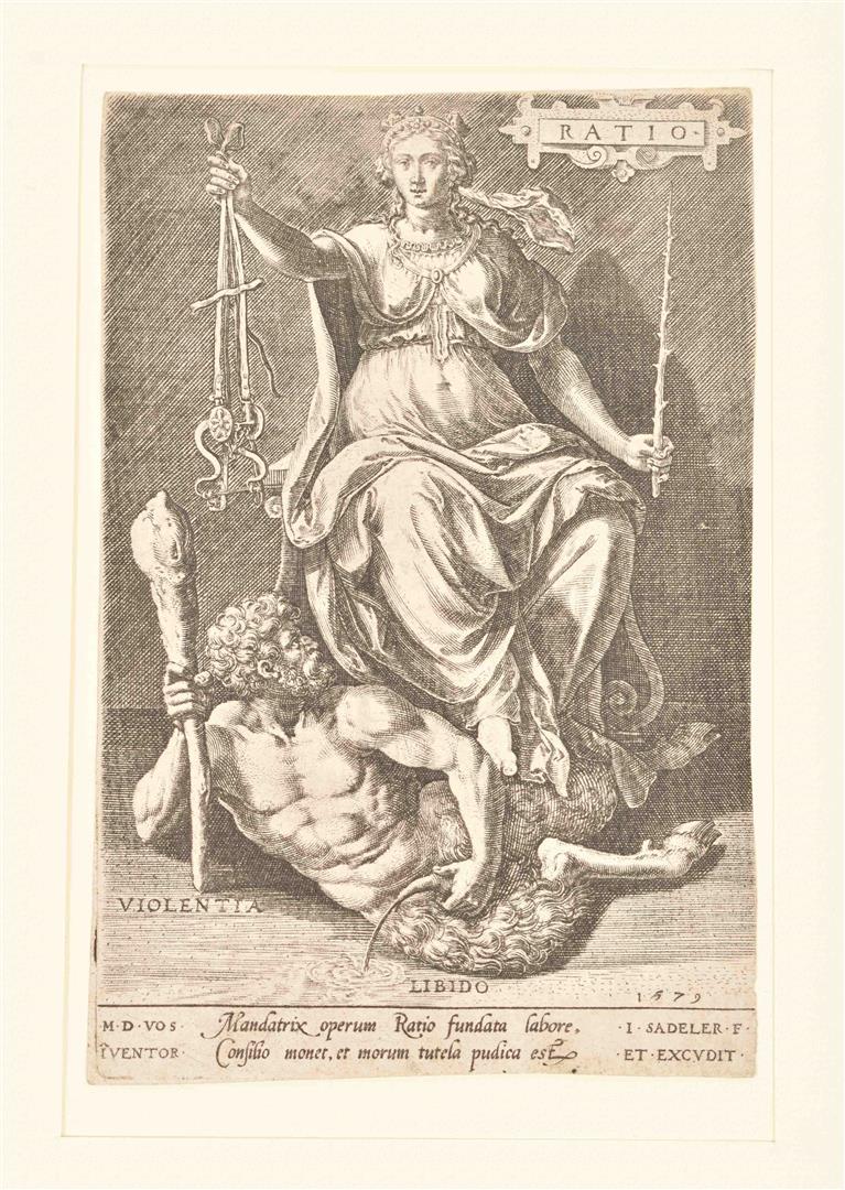 Le capitaine prudent." Circular engr., diameter 11.5 cm, w. central portrait in profile of Willem I van Oranje, surrounded by ornamental scenes w. captions in verse in Dutch and French, ca. 1577-78, mounted at left corners. A good impression on paper w. unidentified watermark. A few foxed spots, neatly repaired tear in upper margin and minor other imperfections. Hollstein 178. The engraving is a pendant of "De hoopman van narheit. Le capitaine des follie", depicting the duke Alva. (2) Johann Sadeler I (1550-1600). 'Ratio conquering Violentia'. Engr. after Maerten de Vos, 13.5 x 8 cm, dated 1579 in the plate, from a series of 9 prints depicting virtues conquering vices, under passepartout. A good impression, trimmed on/ near de plate mark. Hollstein 540. -and 2 others.