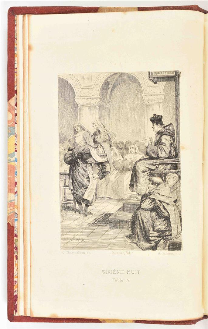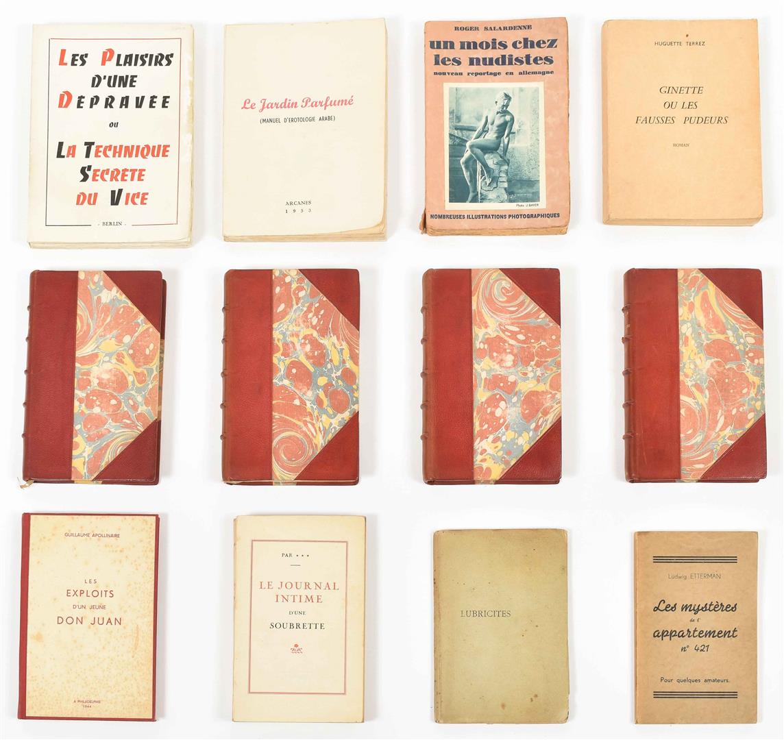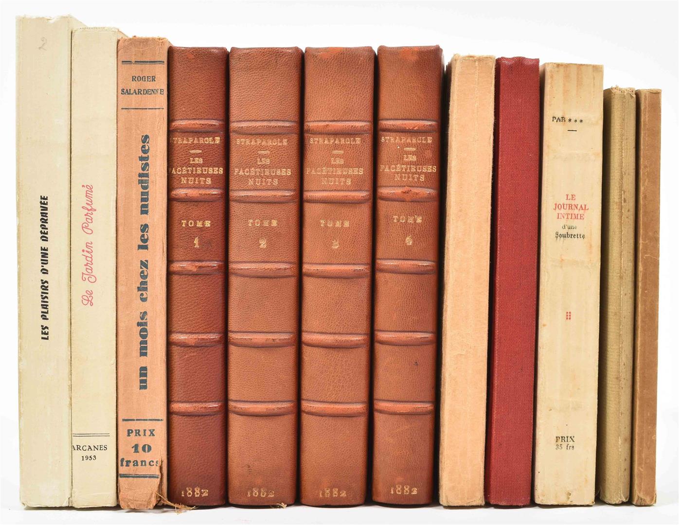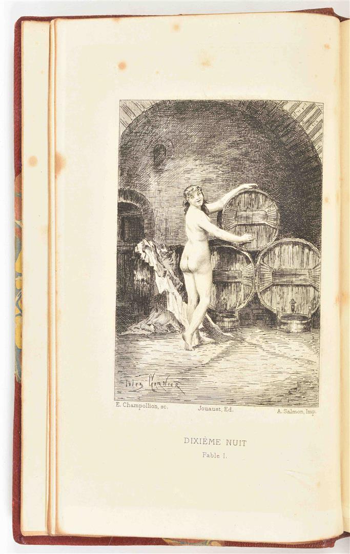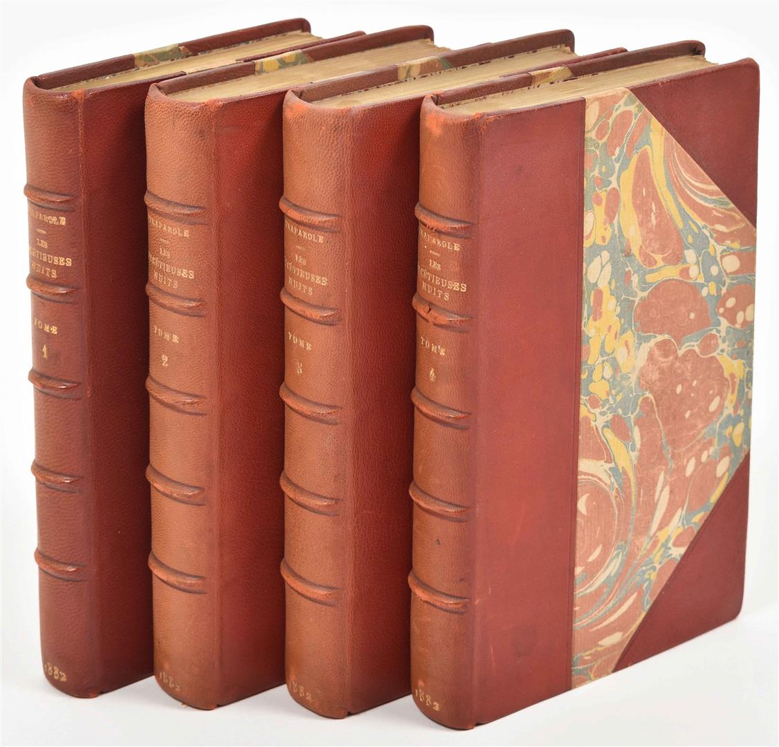 Paris, Jouaust, 1882. 4 vols. Small 8vo. Unif. half red leather w. gilt title on ribbed spine, marbled paper boards. With full-p. engr. plates, untrimmed. All vols. w. ex libris upper pastedown, some writing on upper flylvs. Occas. foxing, but overall good set. -and 8 other erotic publ. in French.