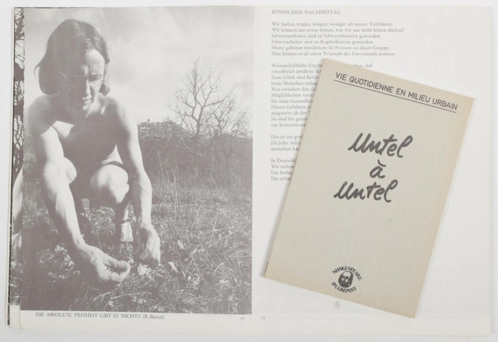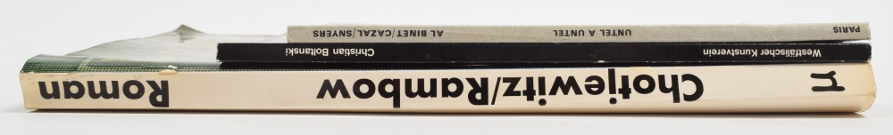 + Untel a Untel, Vie quotidienne en milieu urbain la ville 365 jours par an. Paris, Shakespeare and Company, 1977. + Gunter Rambow and Peter O. Choitjewitz, Roman. Darmstadt, Joseph Melzer, 1968. Artists' book with nude pictures of Choitjewitz mixed with photographs of used and worn shoes. Some aging, but mostly fine copies.