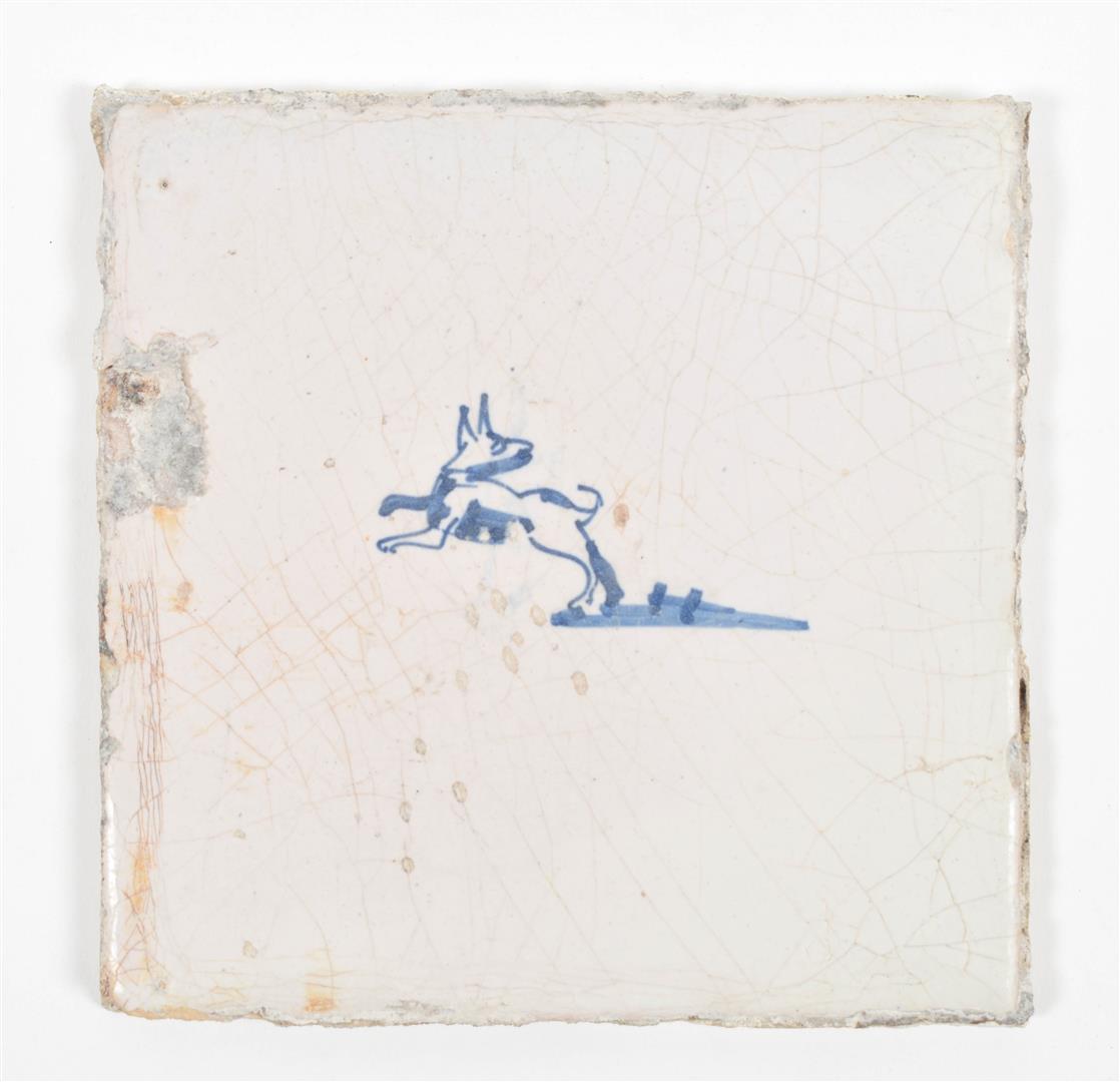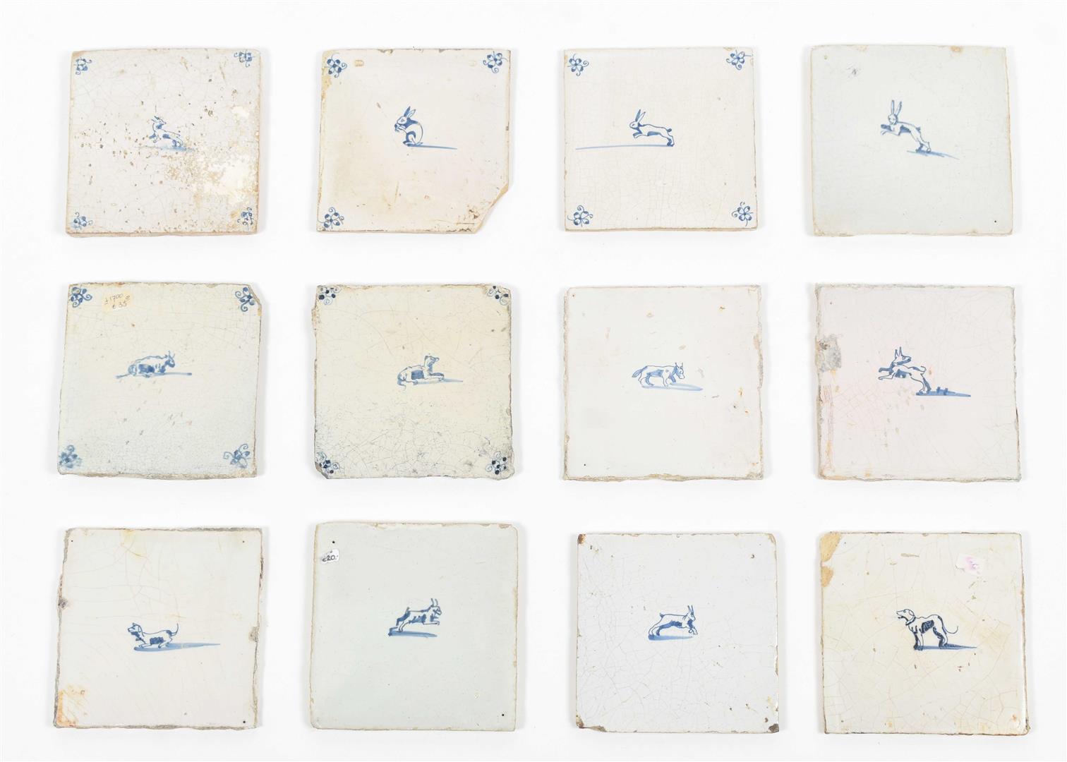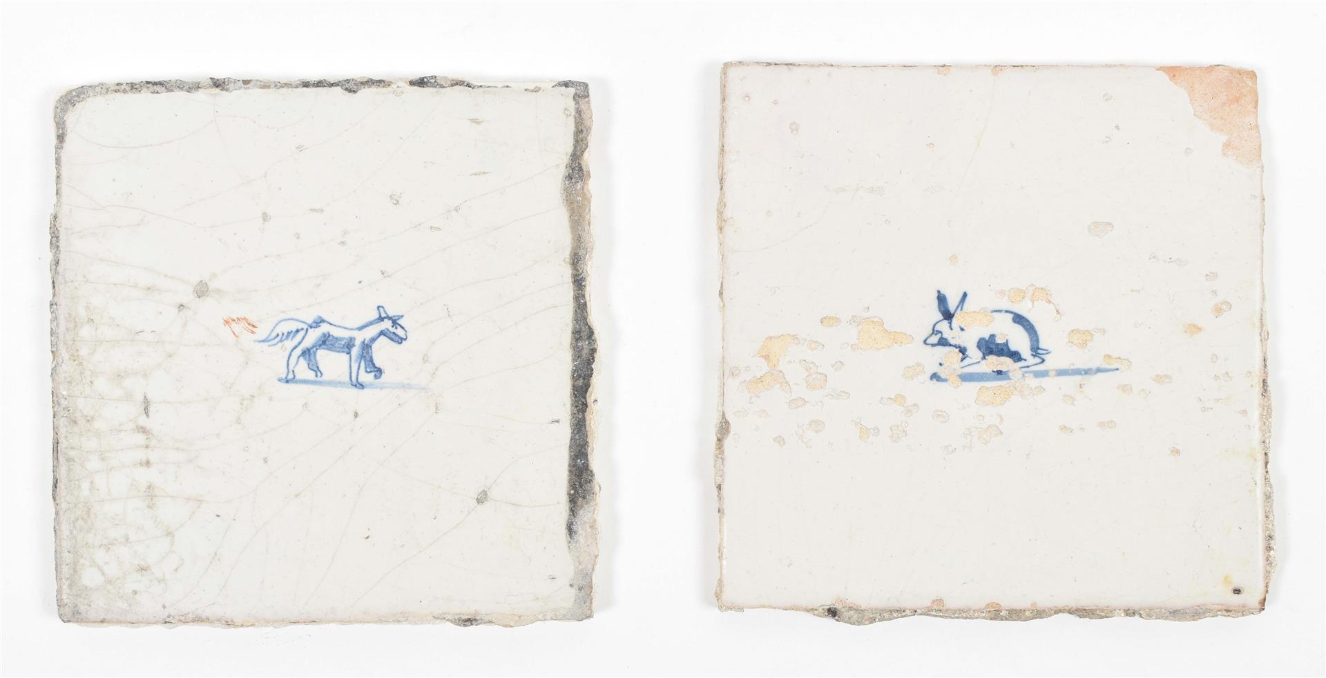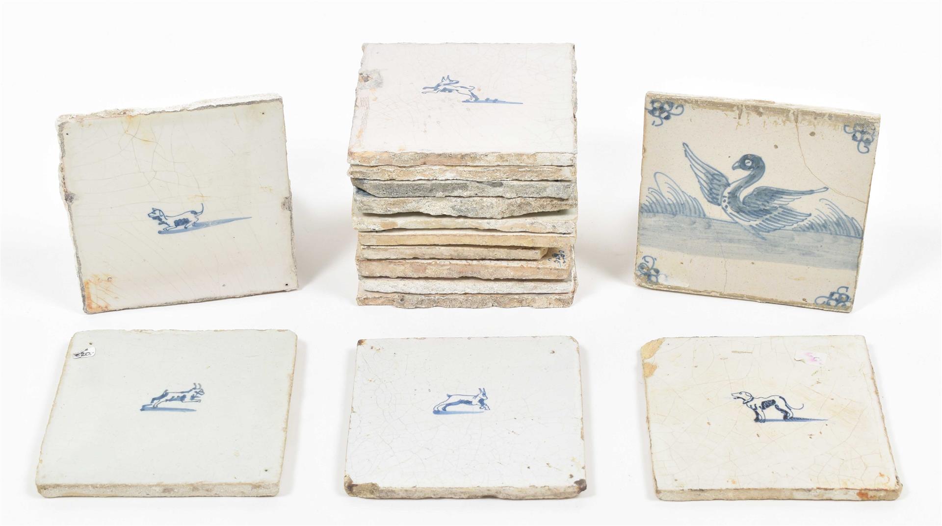 Mid to late 17th century (some ca. 1700). All approx. 13 x 13 cm. Ceramic, blue and white tin glaze. All w. central animal figure depicting a.o. a swan, dogs and rabbit. 6 w. spider corner motif, all others without a corner motif.