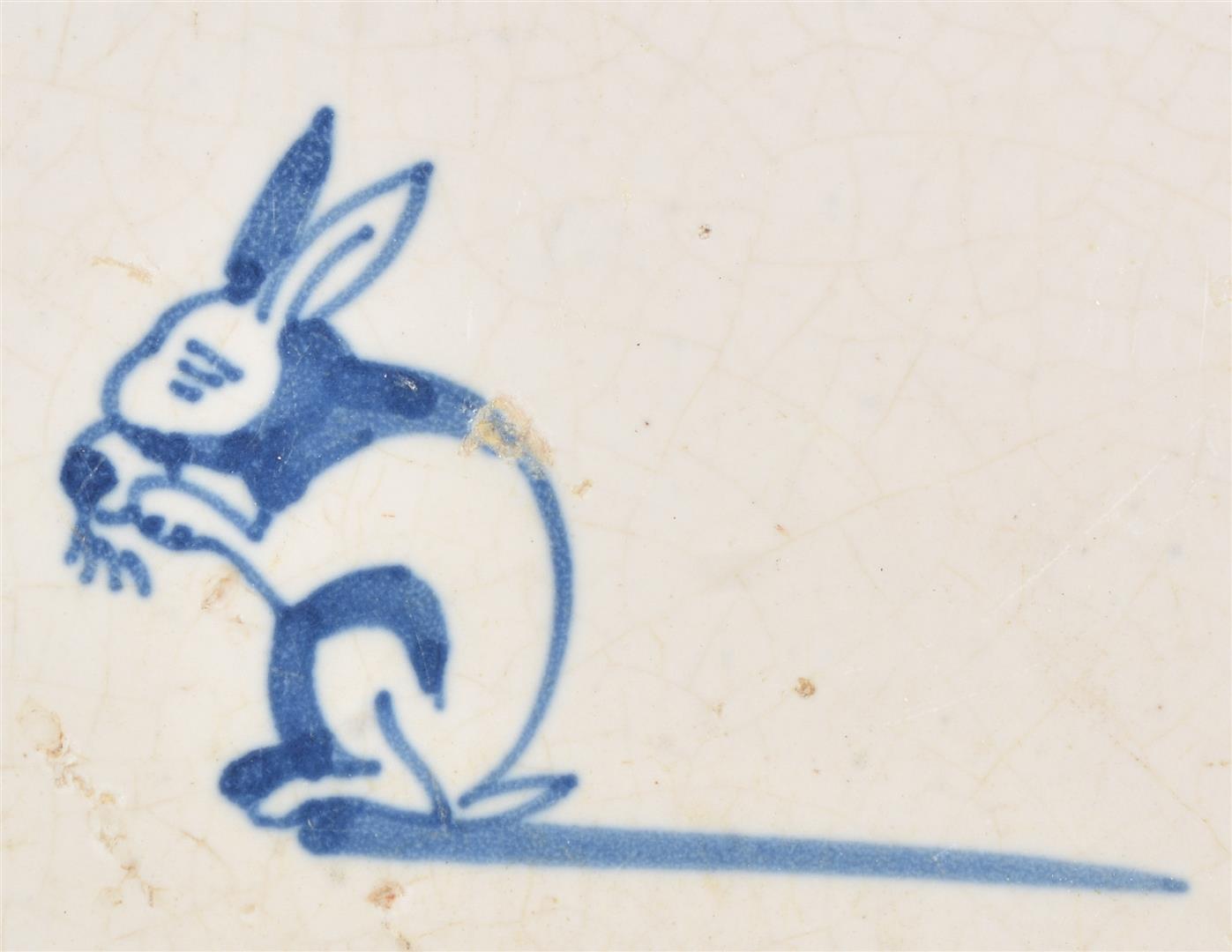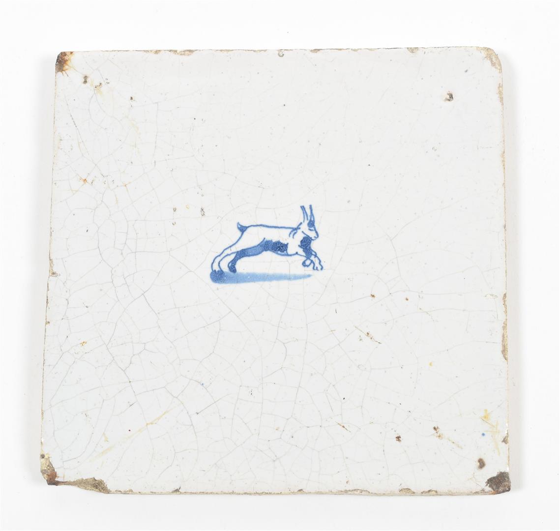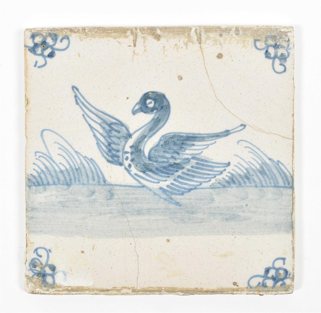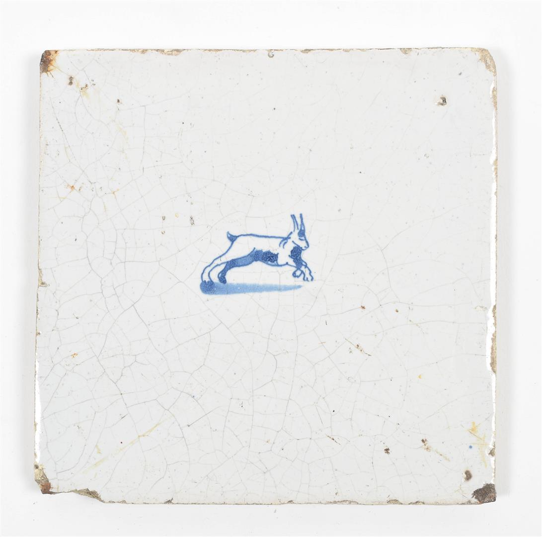 Mid to late 17th century (some ca. 1700). All approx. 13 x 13 cm. Ceramic, blue and white tin glaze. All w. central animal figure depicting a.o. a swan, dogs and rabbit. 6 w. spider corner motif, all others without a corner motif.
