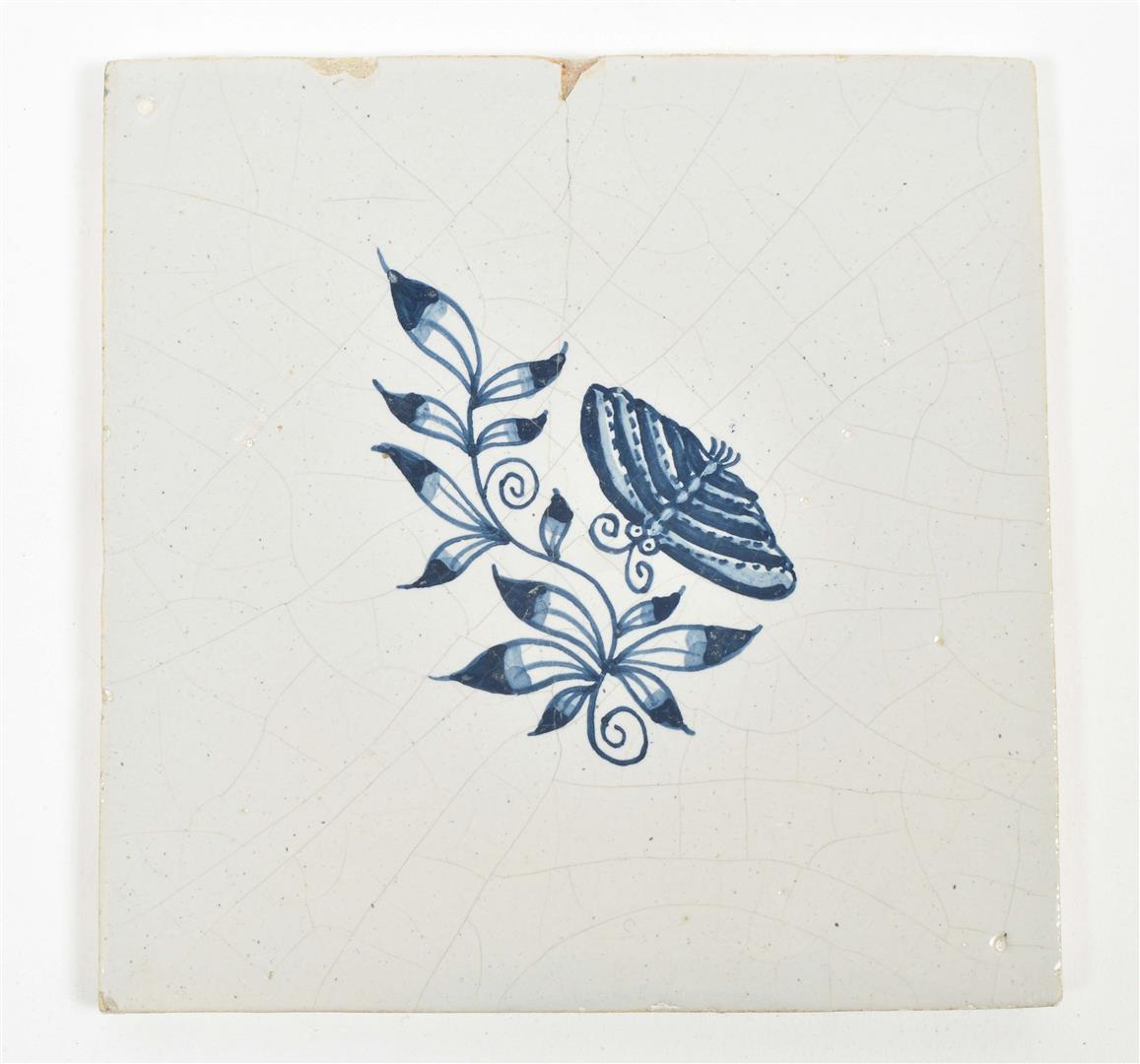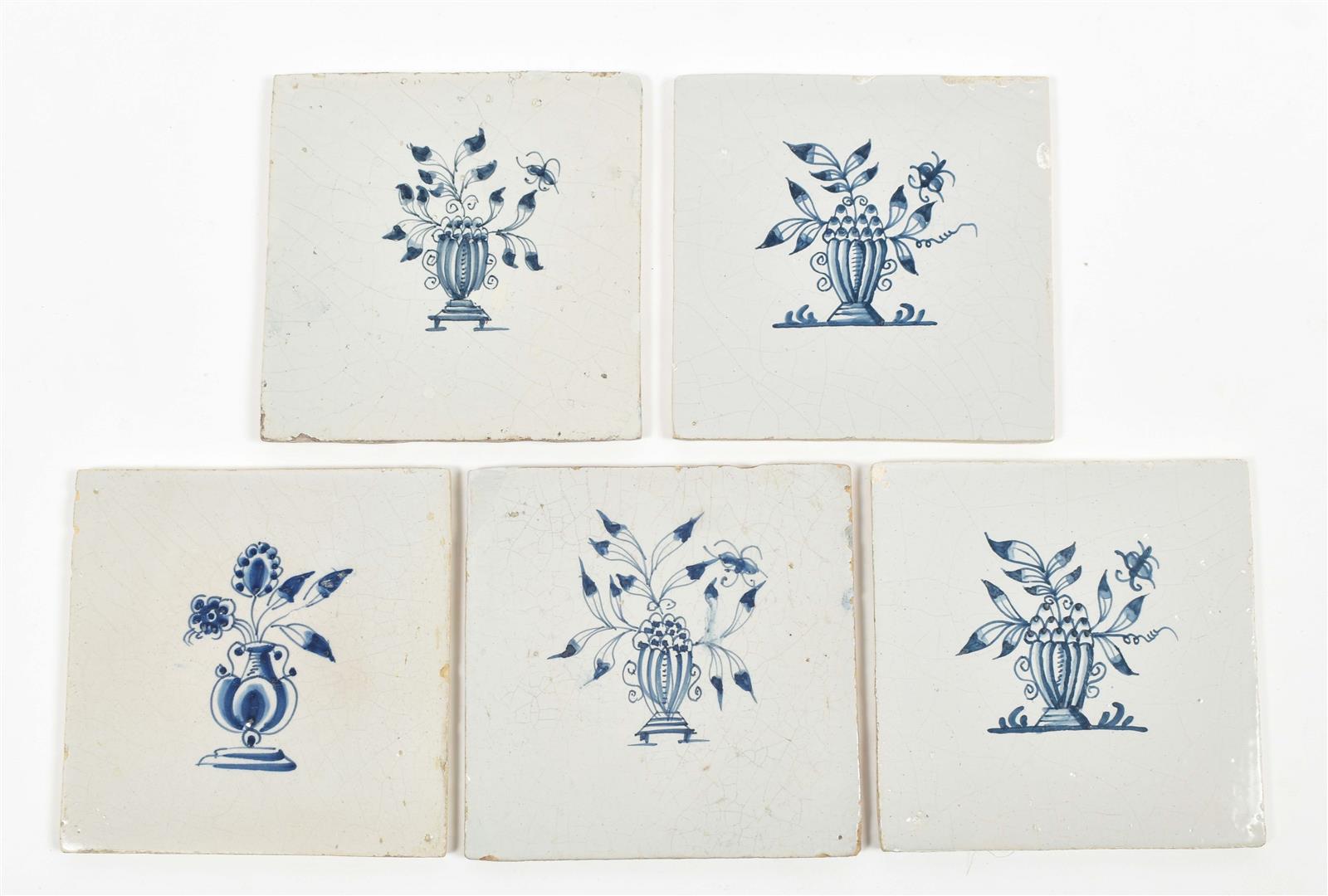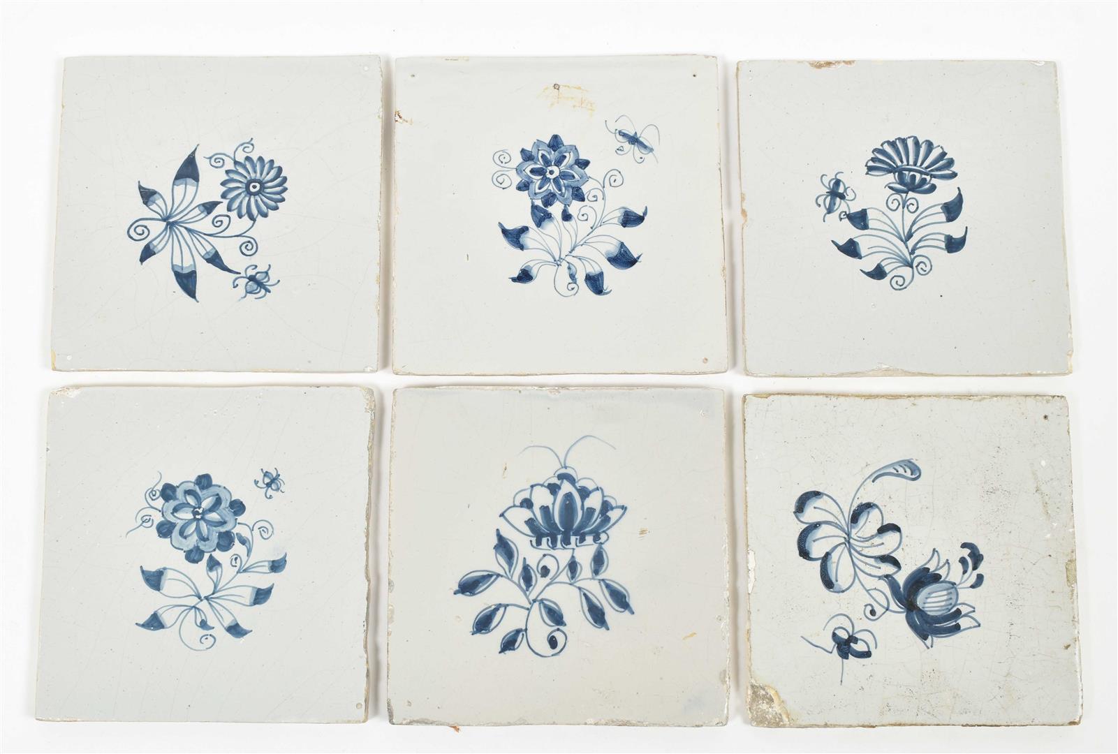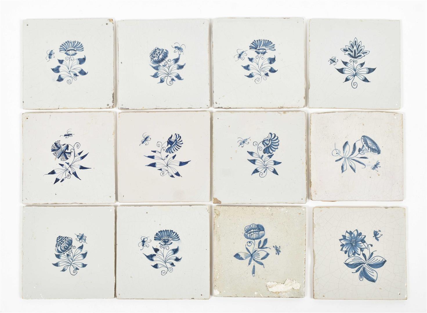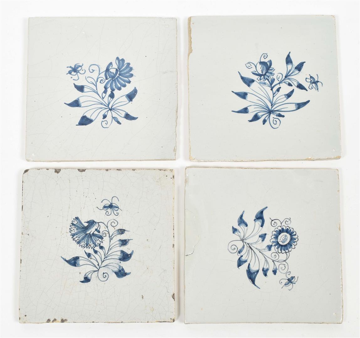 Late 18th cent. All approx. 13 x 13 cm. Ceramic, blue and white tin glaze. Finely decorated w. flowers, some in vases, some w. butterfly/ insect. No corner motif.
