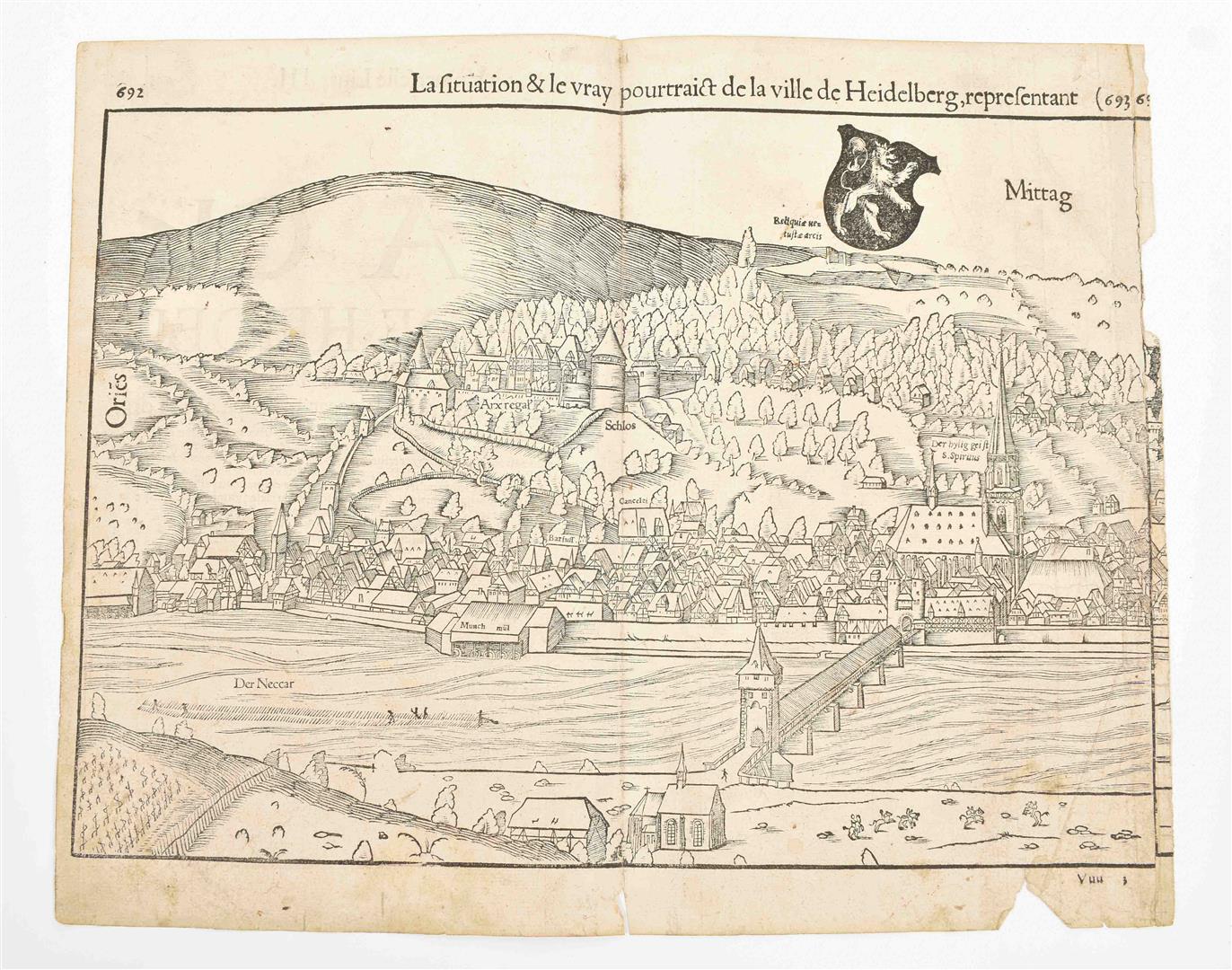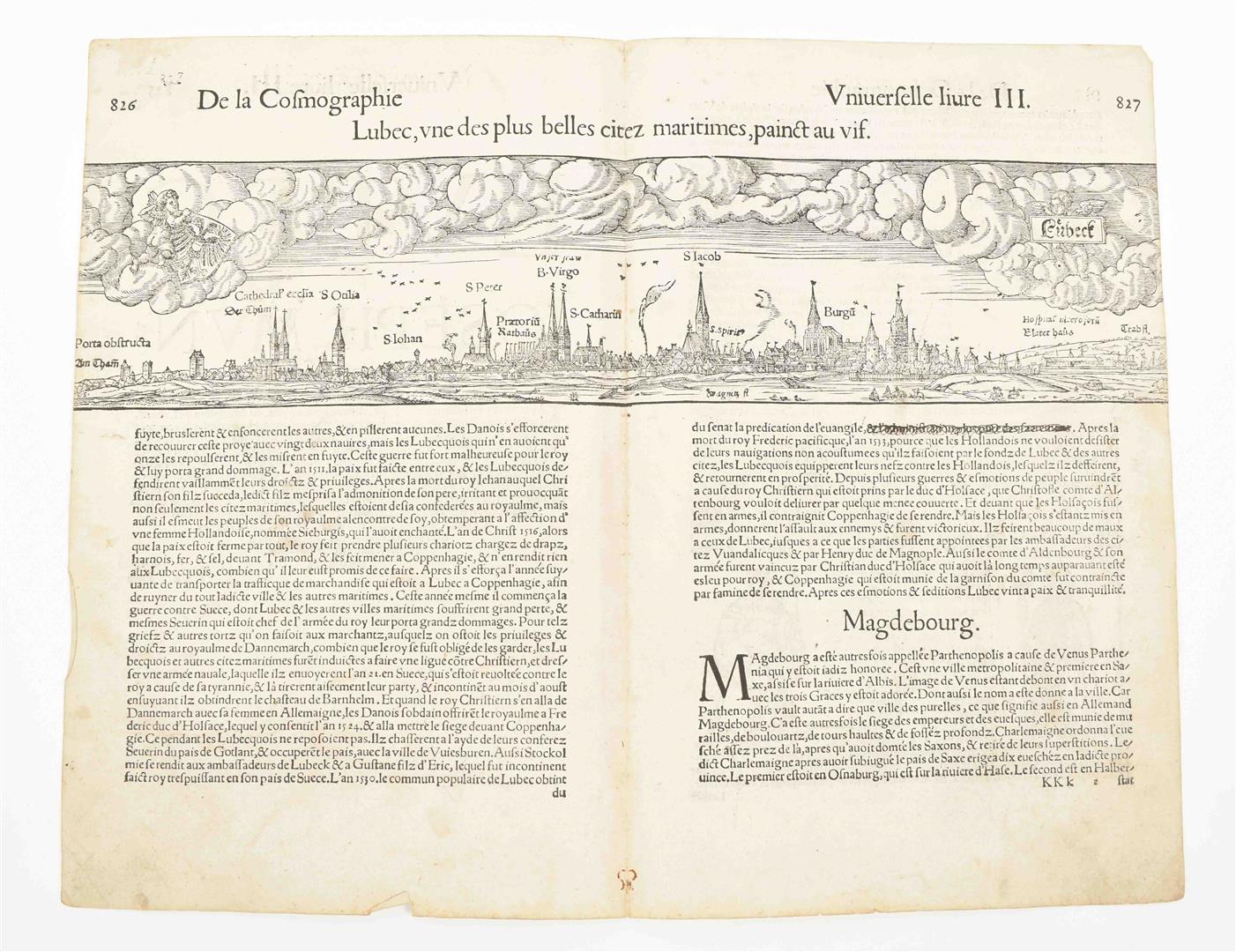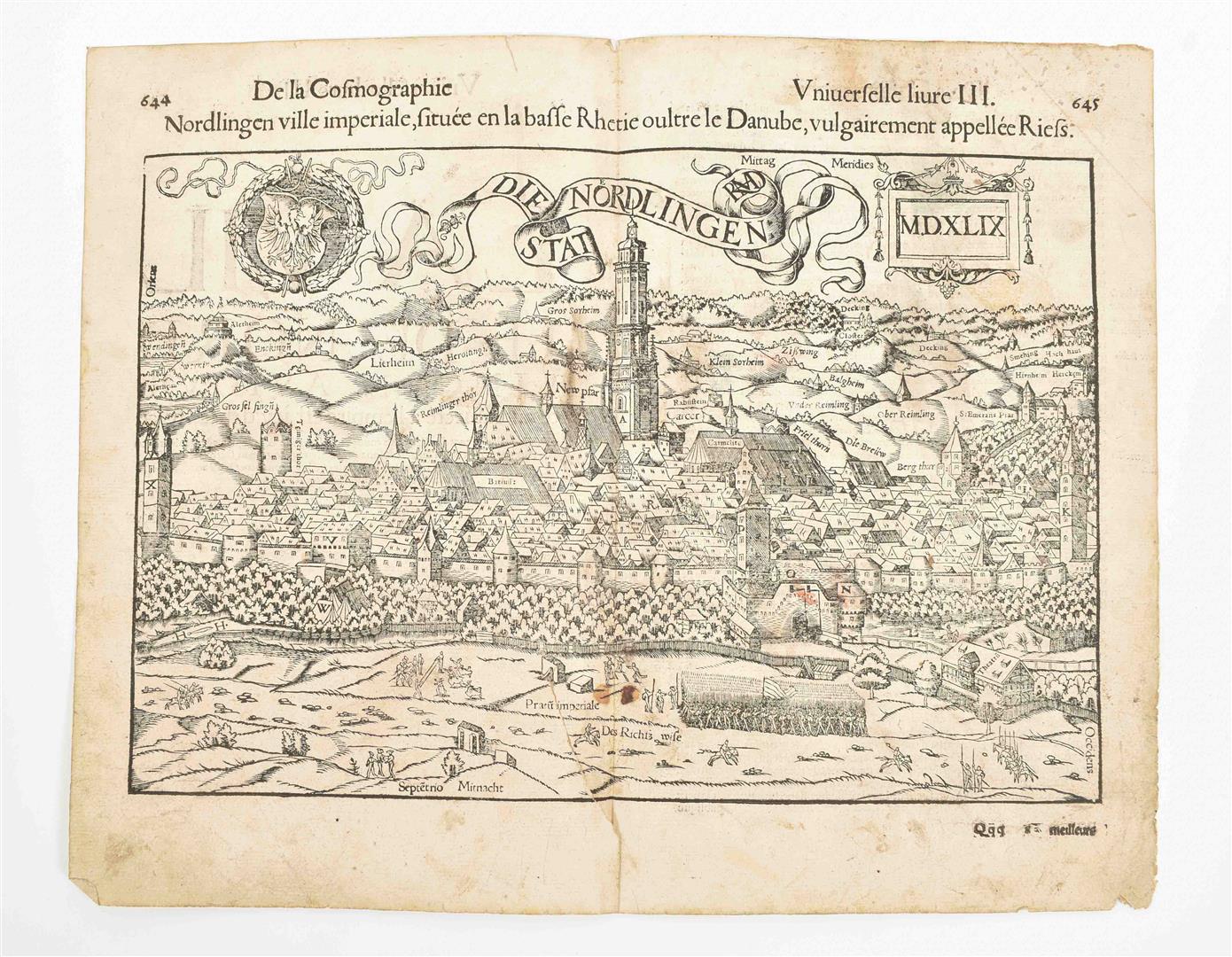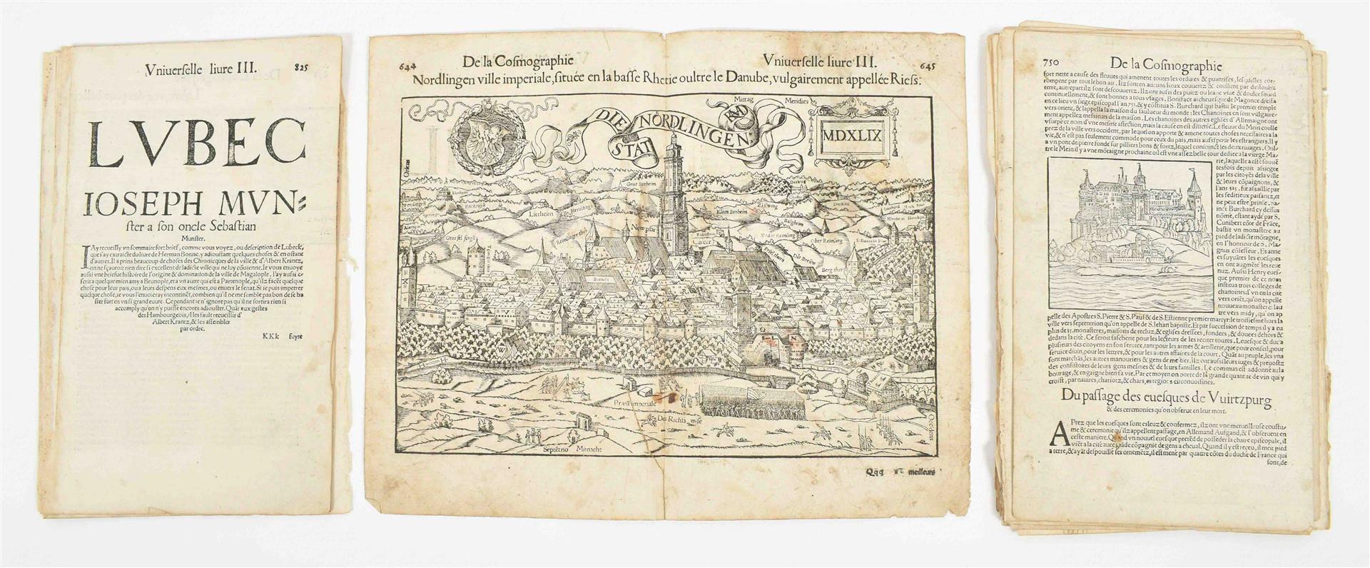 (Paris, Sonnius, 1575). 32 loose sm. folio lvs., all but a few from the 3rd book/ chapter of the work, w. a total of 54 woodcut views, plans, maps, ills. and coats of arms in var. sizes. Comprises a.o. a nice double-p. profile of Nordlingen (dated 1549 in the block), a double-p. bird's-eye plan of Würzburg, a half-p. plan of "Cuire ou Choures", a half-p. bird's-eye plan of Cagliari (Sardinia) and double-p. narrow profiles of Lünebourg and Lübeck.