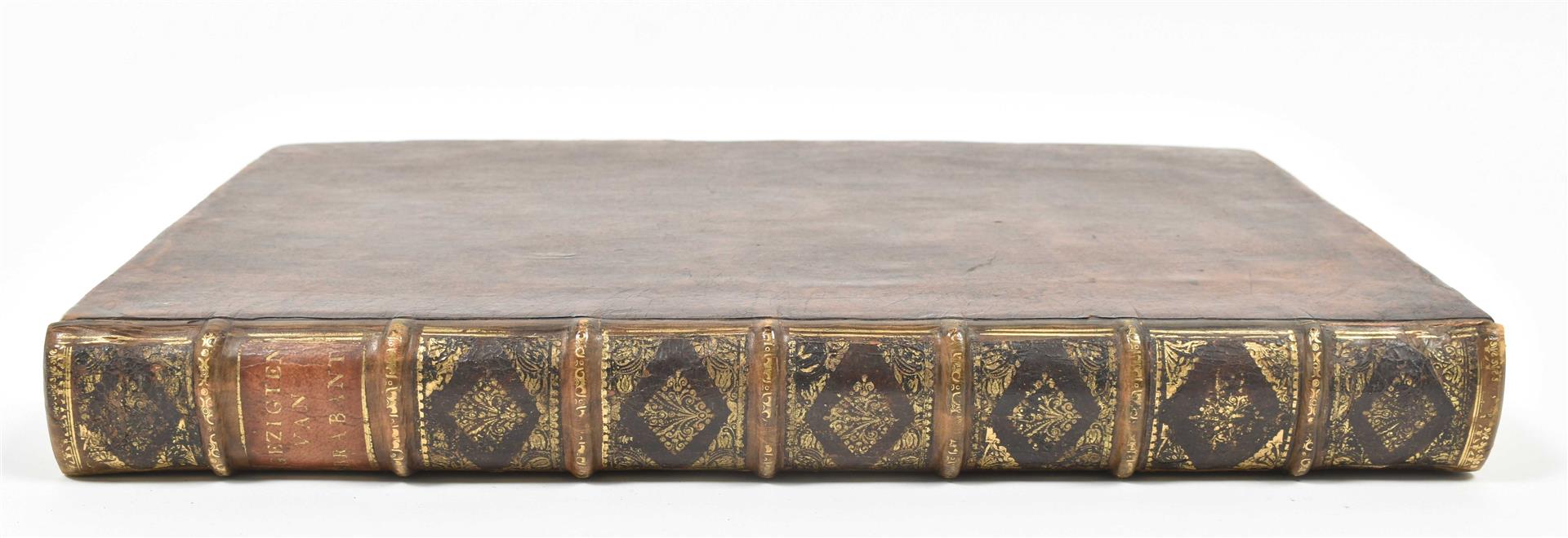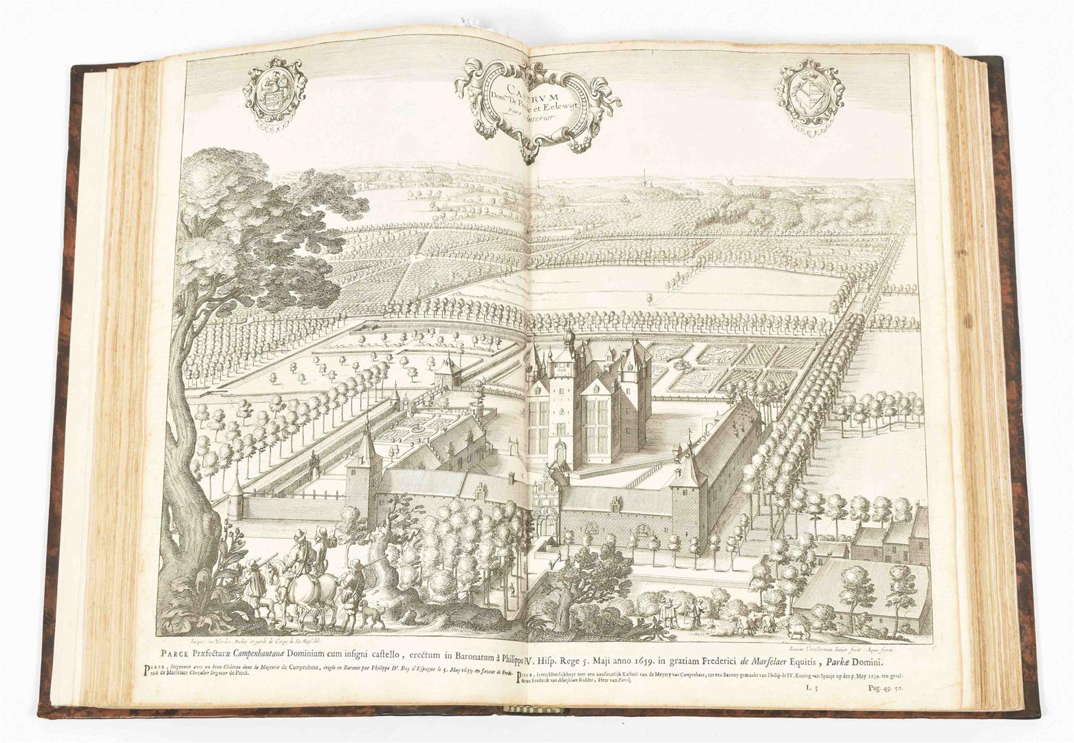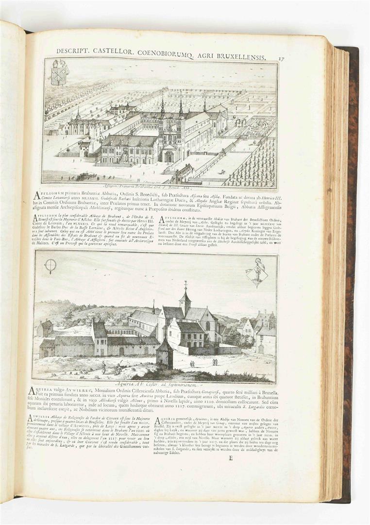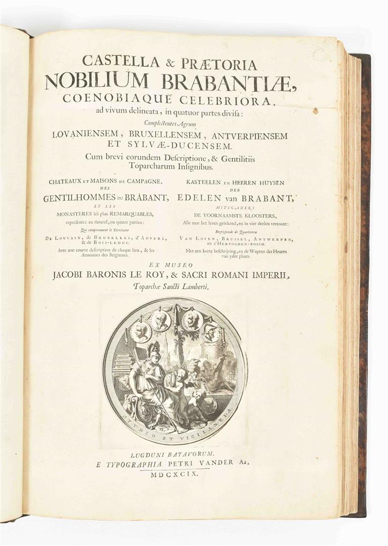 Coenobiaque Celebriora ad vivum delineata (...). Leiden, P. vander Aa, 1699. 4 parts in 1 vol. In Latin, French, and Dutch, engr. title-p., title-p. engr., engr. dedication, 6 double-p./ fold. maps/ plans, num. (double-p./ full-p.) in-text engr. views of castles. Contemp. calf w. gilt dec. on ribbed spine. Folio. Bound w.: Ibid. L'Erection de toutes les terres, seigneuries & familles titrees du Brabant. Ibid., idem, 1699. Engr. dedication, 7 in-text engr. views, incl. rare map.