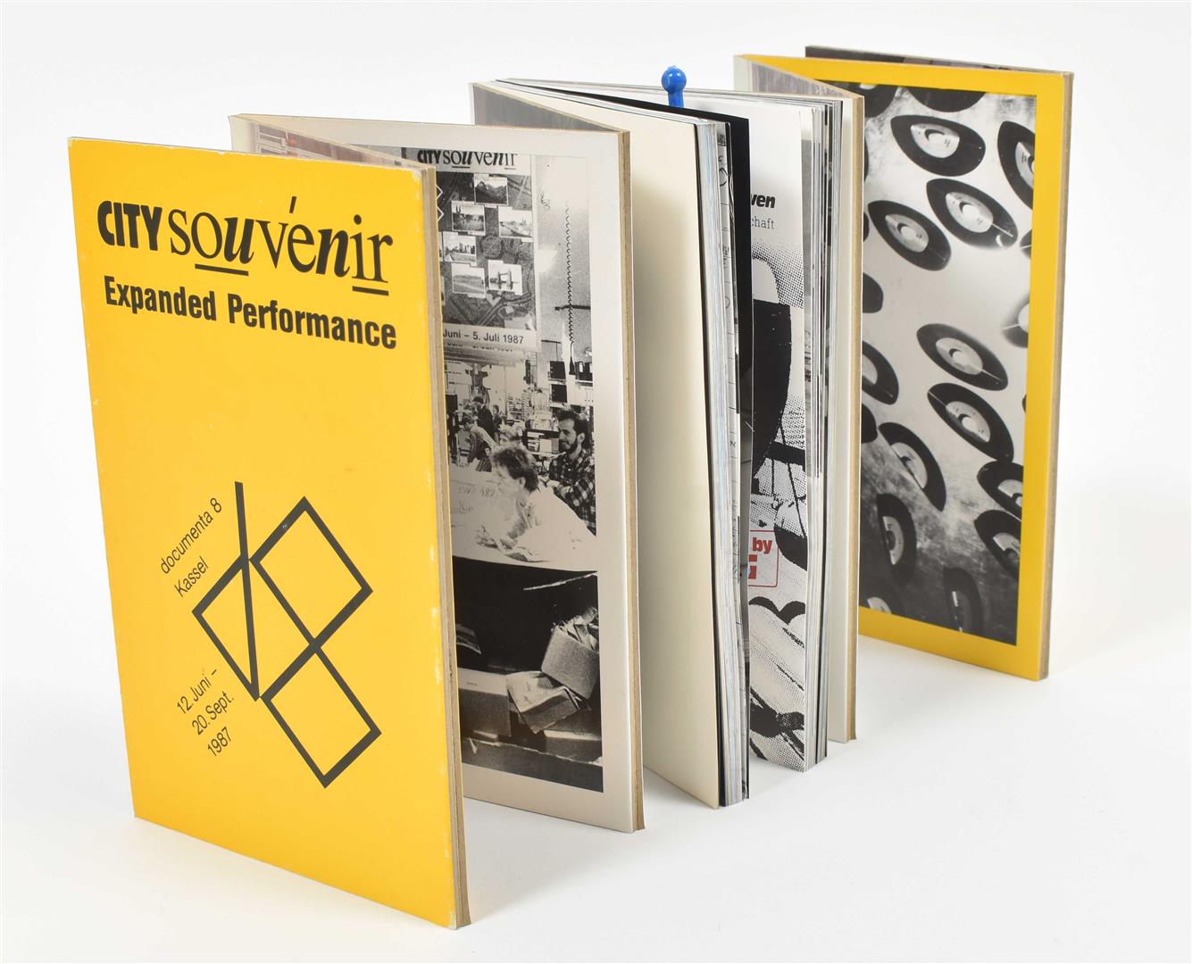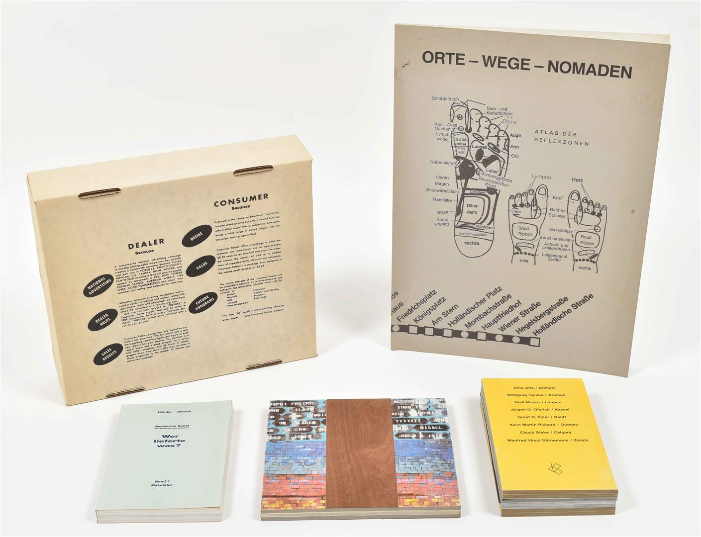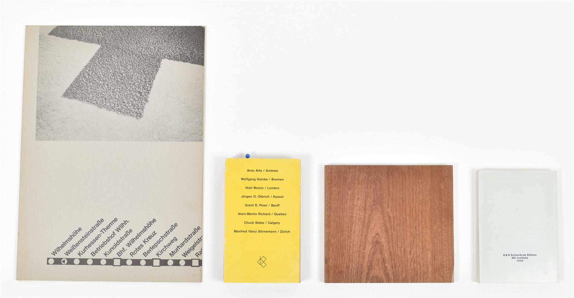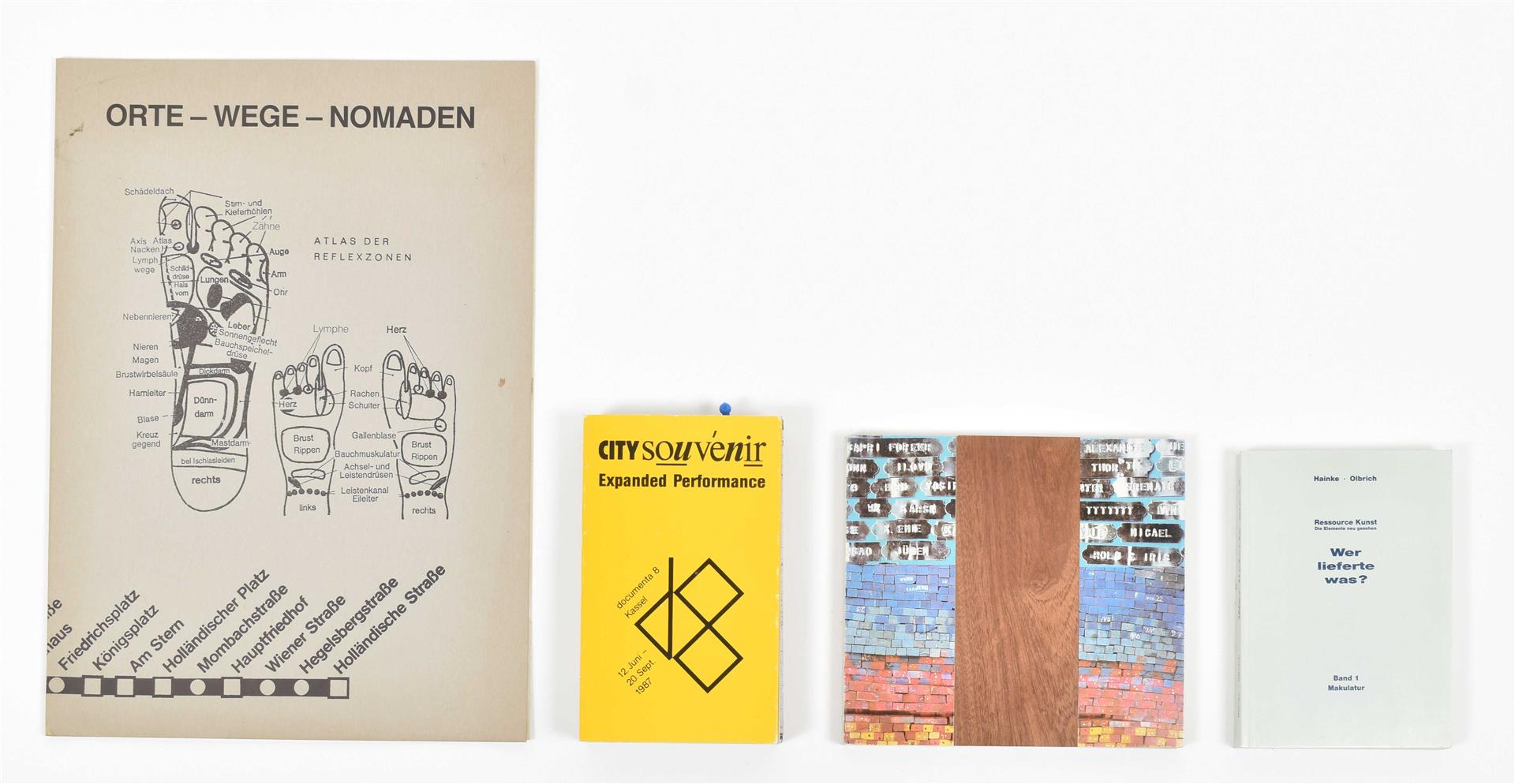 (2) Resource Kunst. Schierbrock/Kassel, Schierbrock Edition/NO Institute, 1989. Two volumes, 129/ 32 pp. (3) Orte-Wege-Nomaden. Catalogue for a group exhibition at Kunstraum Kunoldstrasse Kassel, 1986. Softcover, 64 x 32.5 cm, 4 pp. with fold-outs. (4) City Souvenir: Expanded Performance, 12. Juni - 5. Juli 1987. Kassel, J. O. Olbrich, 1987. Leporello, 21.5 x 13 cm, with mounted cocktail stick. Features documentation of Olbrich's performance at Documenta 8. (total 5)
