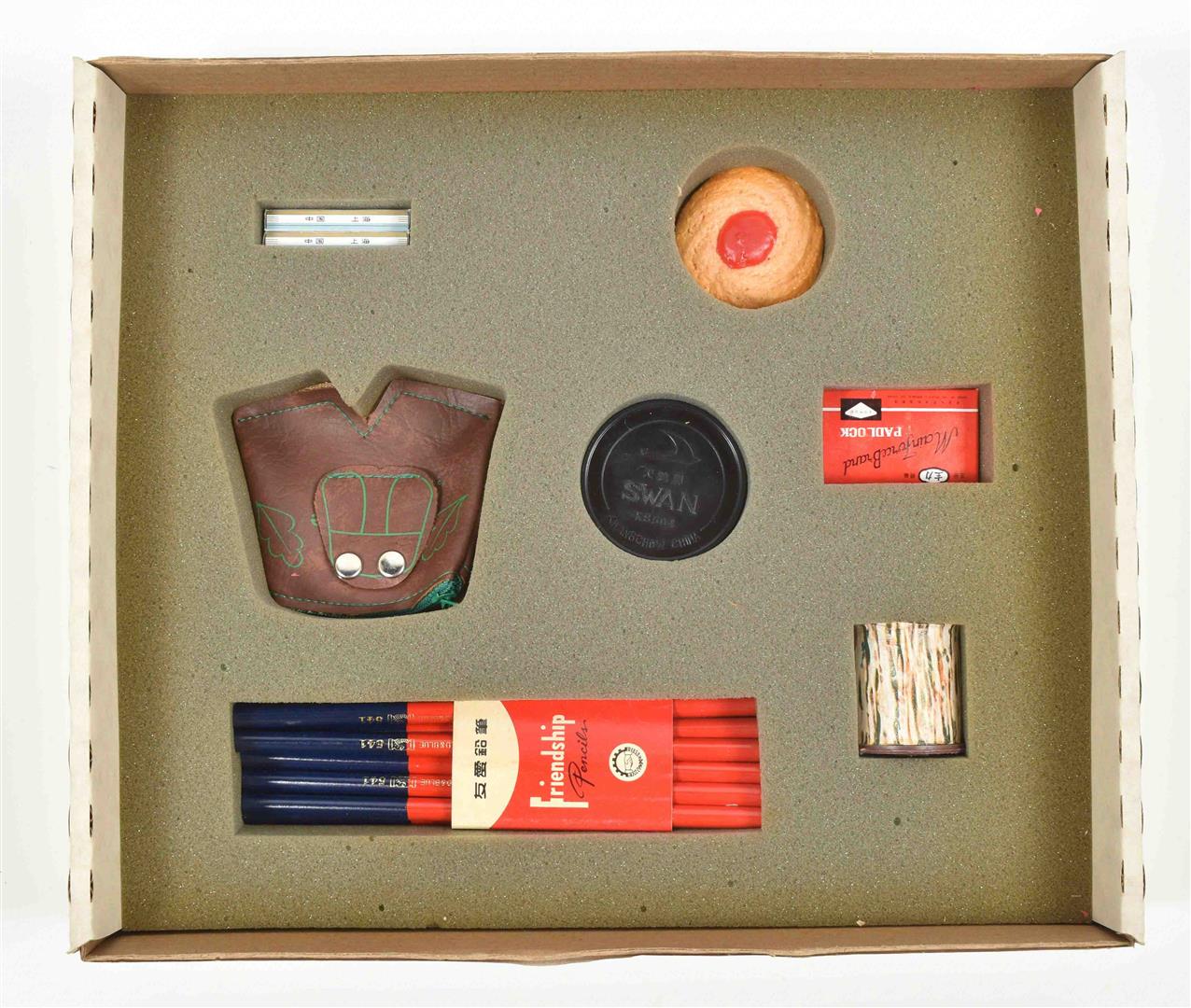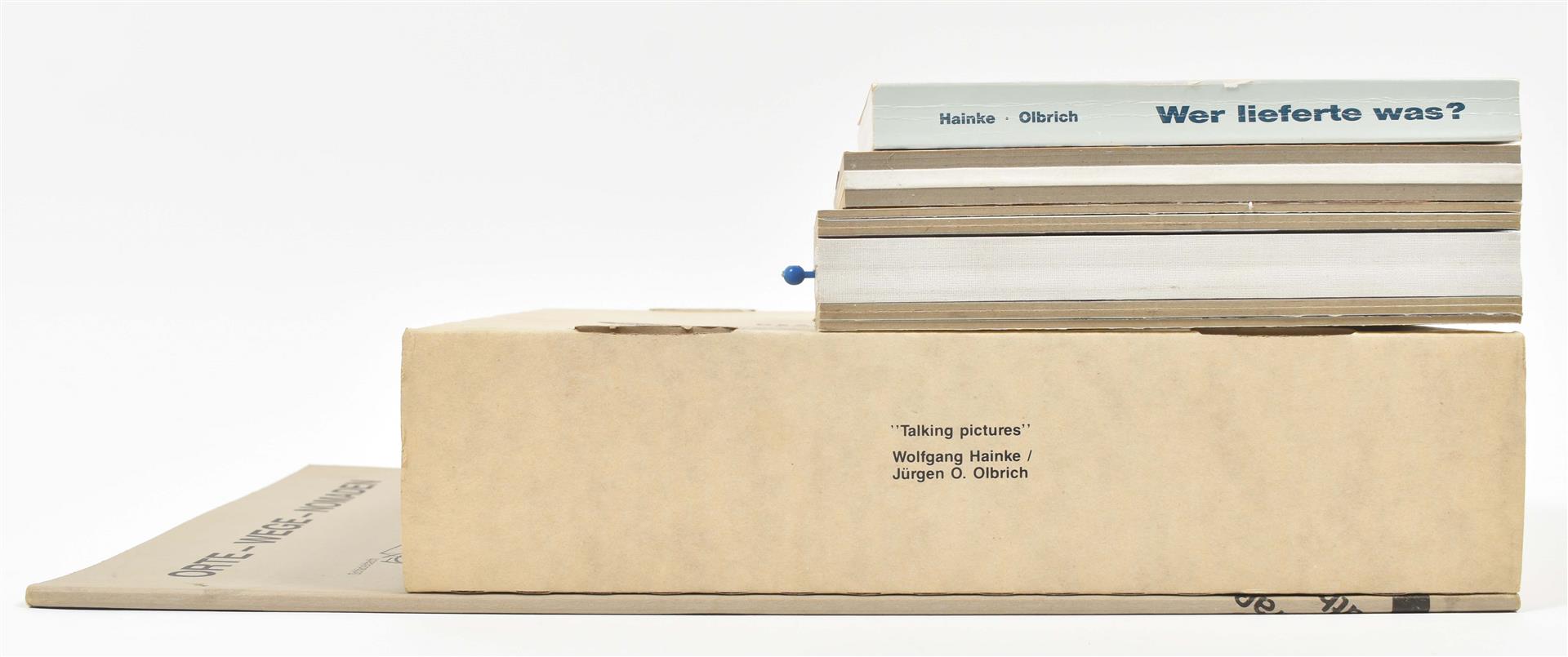 (1) Talking Pictures: Two Image Works. Wiesbaden, Harlekin Art, 1988. Multiple in printed cardboard box, 34 x 30 x 8.5 cm, signed and numbered 172/199. Contains an assembling of objects in a polyurethane insert, hardcover book with slides and a vinyl album, painted plastic leaf and text sheets. In mint condition.