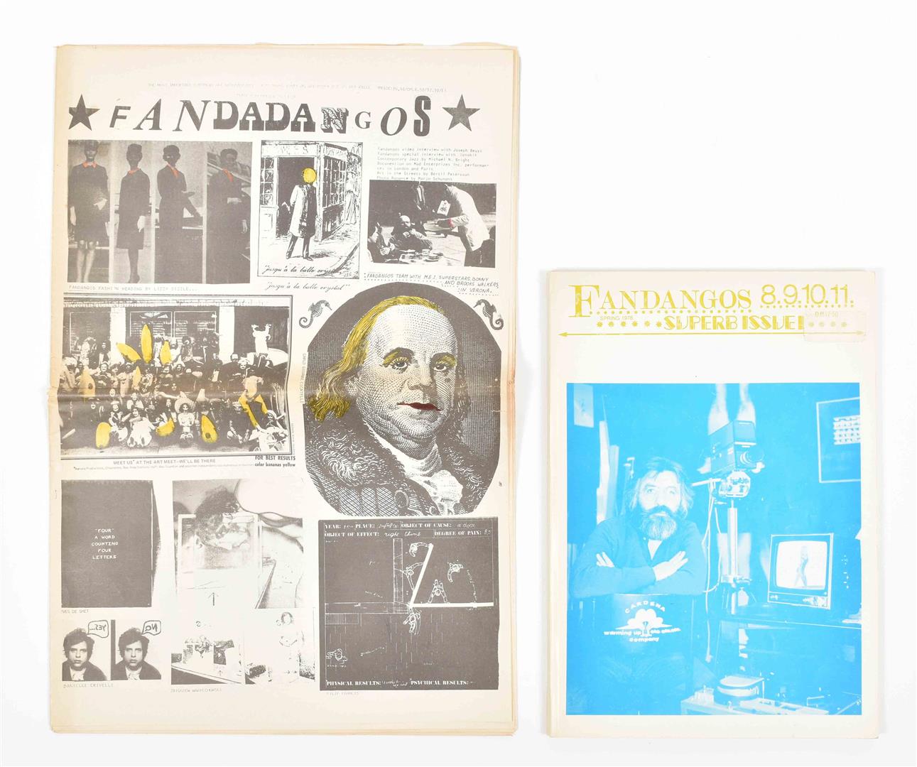 Contributions by Anna Banana, Bill Gaglione, Michael Druks, Michel Cardena, J.C. Kocman, Filip Francis et al. Folded copy with toning and profound wear to spine and edges. (2) Fandangos 8.9.10.11 Superb Issue! Softcover, 30 x 21 cm, 180 pp. Printed black and blue on white, with some additional stamps. Contributions by Raul Marroquin, Marjo Schumans, Martha Hawley, Ulises Carrion, Peter Frank, Robert Filliou, Reindeer Werk, Charlemagne Palestine, Laurie Anderson, Jeffrey Deitch et al. Fine copy. (total 2)