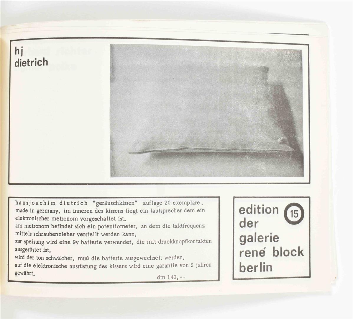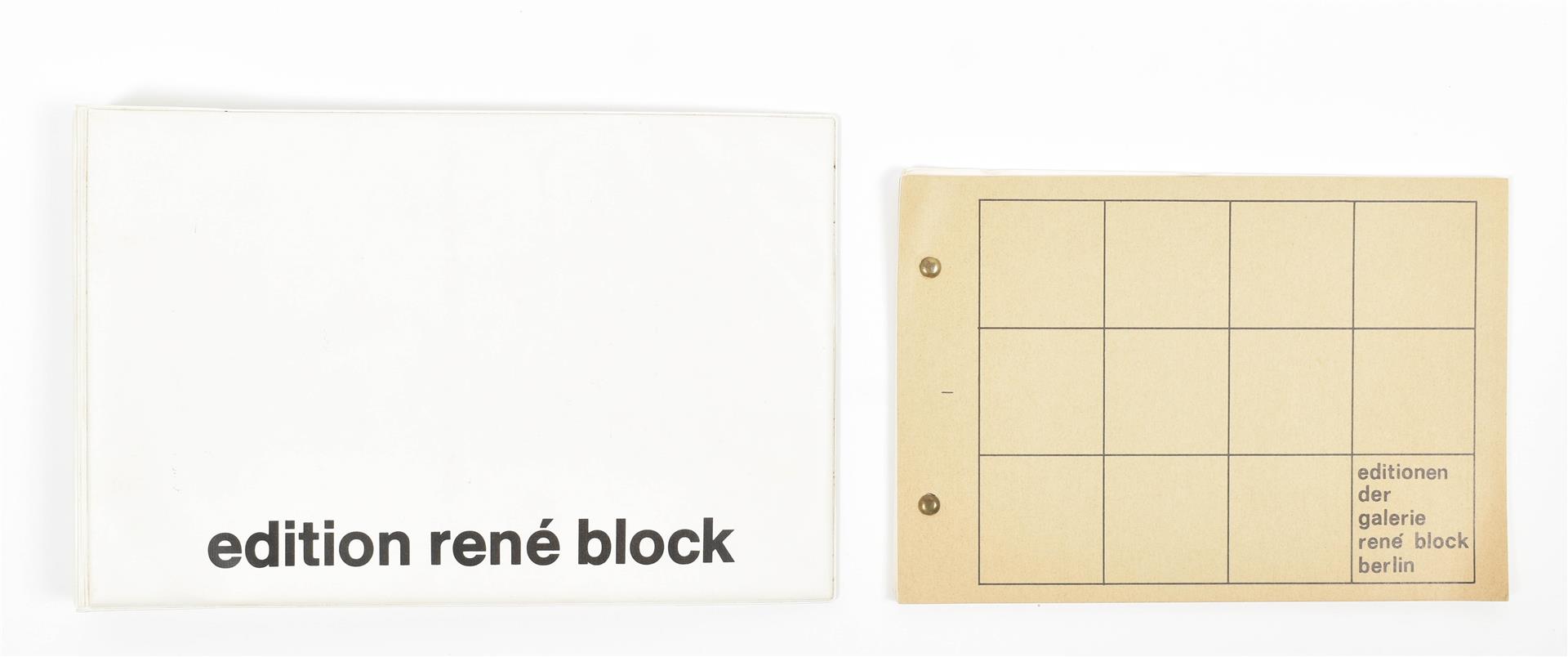 (1) Editionen der Galerie René Block Berlin, undated ca. 1973. Brown printed wrappers, clip-bound, 14.5 x 21 cm, 26 pp. Each numbered page promotes one multiple. This compilation includes Nos.1 to 29, missing No.20, 25 and 26. Artists featured are Wolf Vostell (Klammerbuch, Deutsche Studententapete), Joseph Beuys (Das Schweigen, Filtzanzug), Gerhard Richter, Sigmar Polke, Diter Roth (Literaturwurste), Rebecca Horn (Handschuhfinger), Palermo et al.