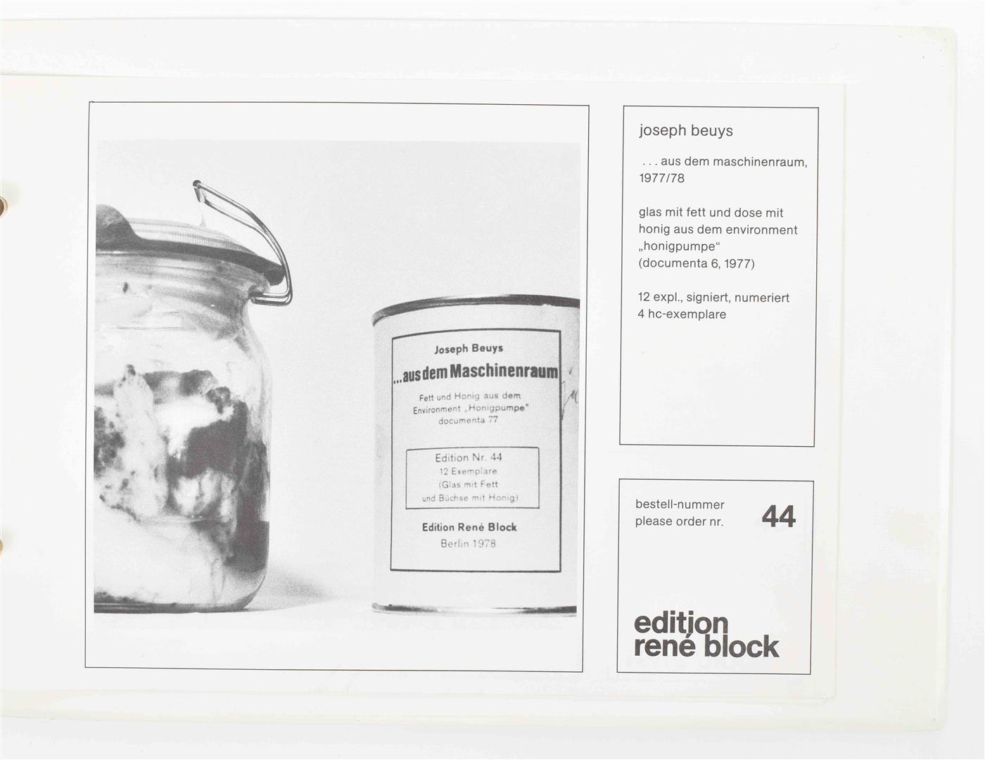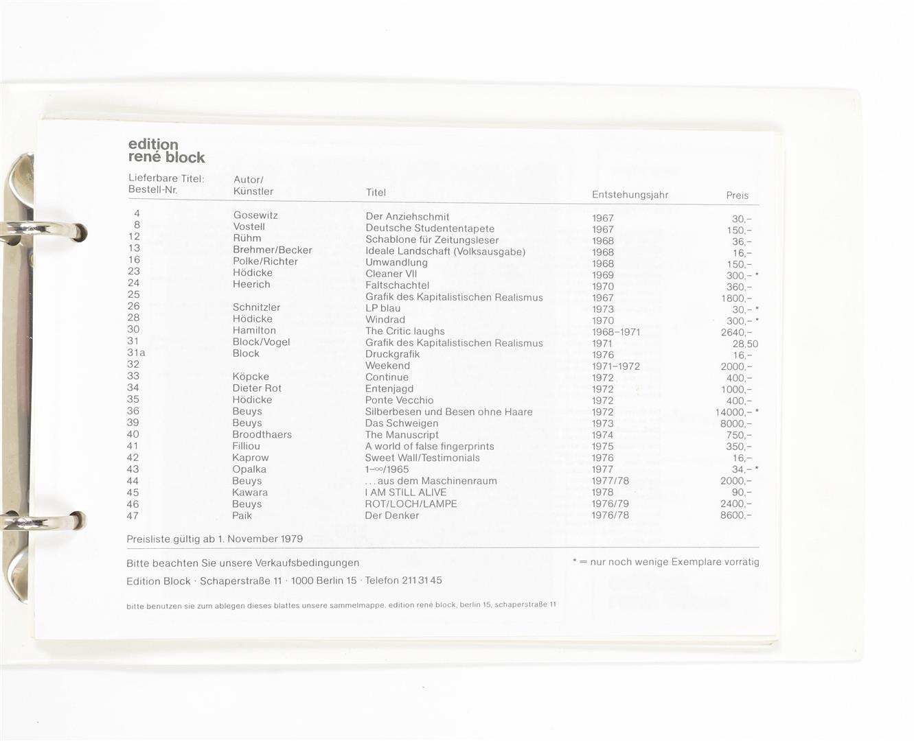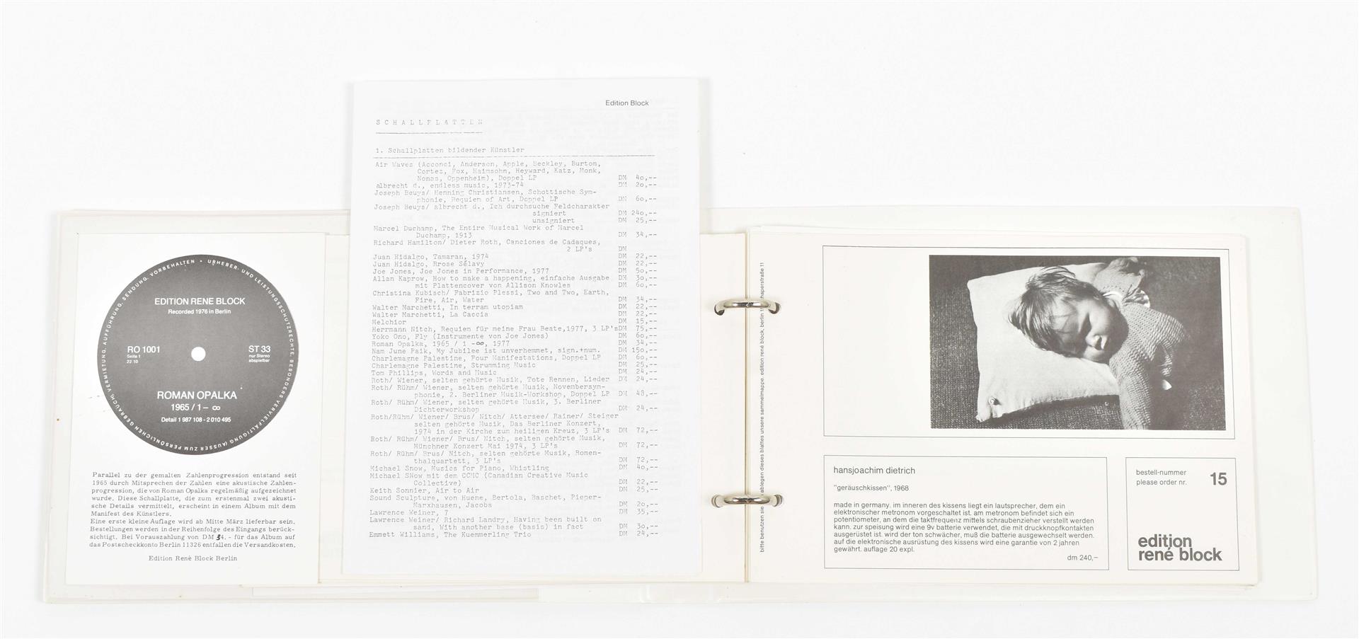 (2) An almost identical catalogue, with 42 pages housed in a white plastic two-ring binder, 25 x 16.5 x 3 cm. Contains sheets for multiples Nos.1 to 47 (missing No.36, 37, 38, 39, 40 and 46) plus an introductory page listing available items until 1 November 1979. This later catalogue features some new pictures of the same items, some multiples are sold out or have become more expensive. (3) Added is a list with artists' sound works available from Edition Block and (4) a promotional card for a Roman Opalka album produced in 1965. (total 4)