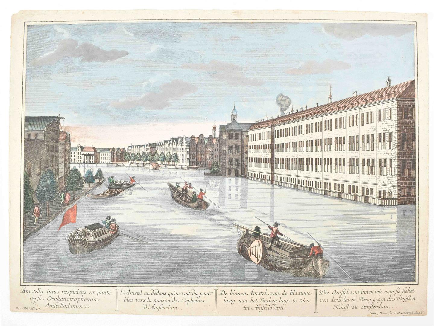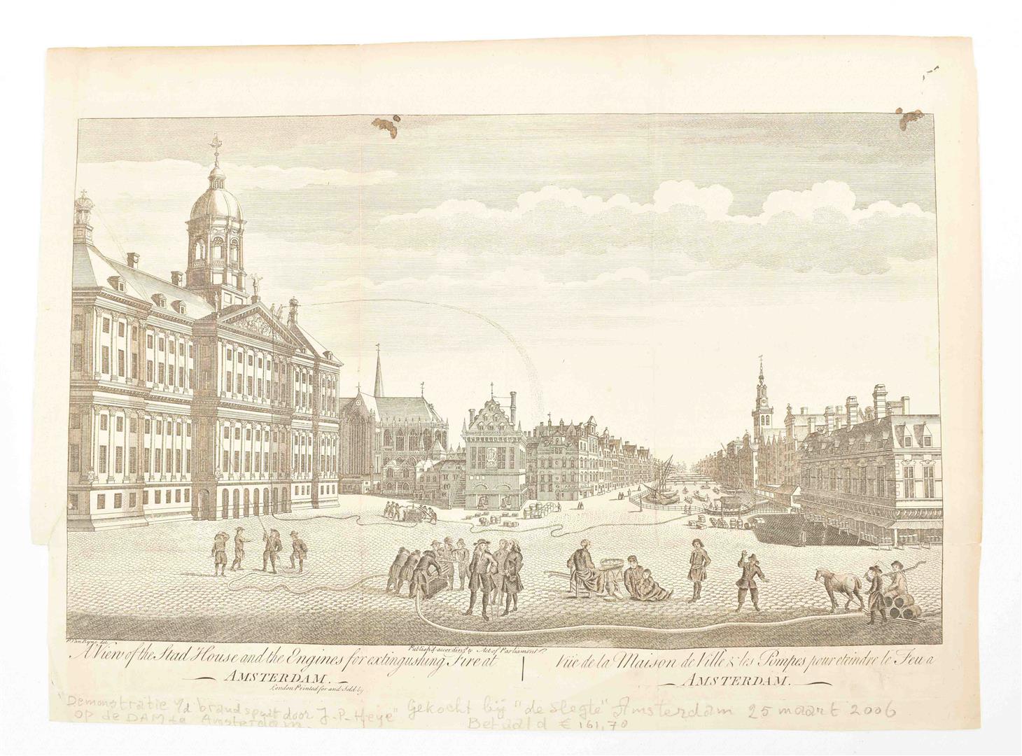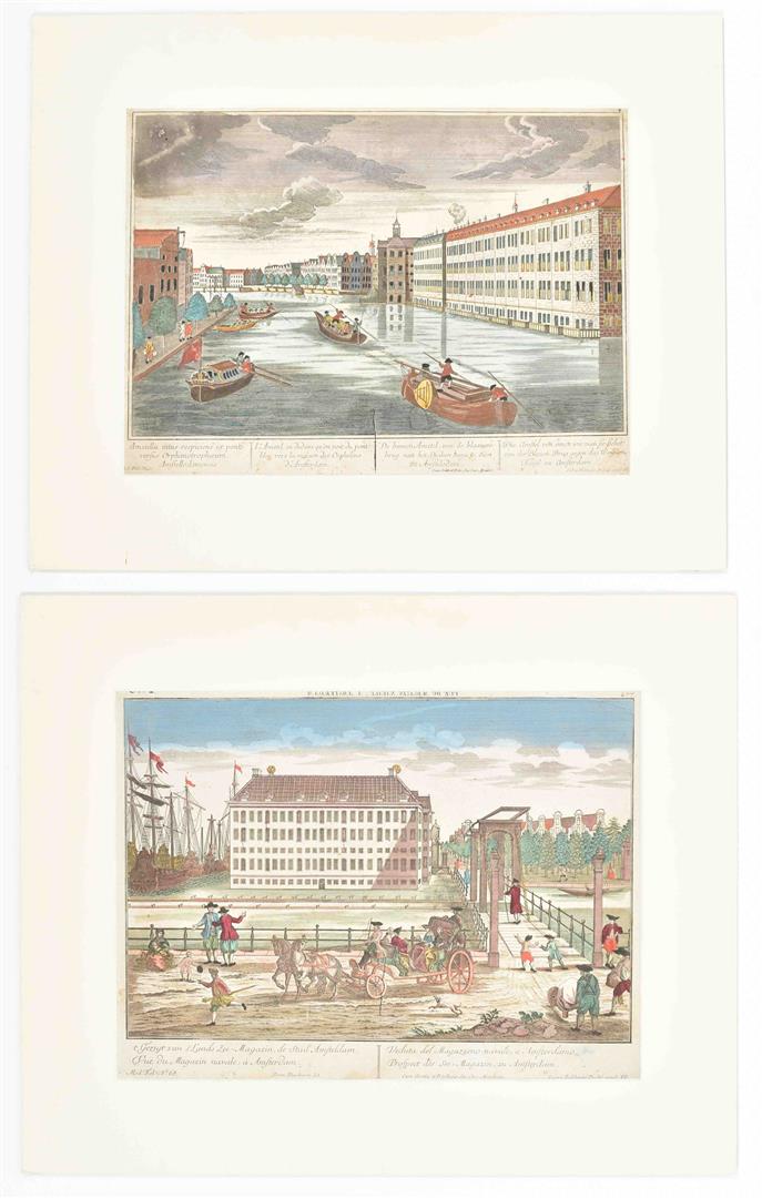 na het Diaken huys te Zien tot Amstelodam. Contemp. handcol. engr. optical view, 30 x 40.5 cm, w. captions in Latin, French, Dutch and German and numb. "Med. Fol.o No 10" below the image. Augsburg, G.B. Probst, ca. 1770. Trimmed just outside/ on the plate mark, some minor imperfections in blank margins. (2) Vuë de Magasin Navale, à Amsterdam. Contemp. handcol. engr. optical view, 31.5 x 41 cm, after P. van Blankaert, w. caption in reverse in French and no. 277 (and no. 2 in pen) above the image, and captions in Dutch, French, Italian and German below the image. Ibid., idem, ca. 1770. Under passepartout. Vaguely waterst. in lower corners, central vertical fold, minor other imperfections. -and 2 other optical views of Amst., incl. 1 publ. by Probst. Added: A view of the Amst. stadhuis w. fire trucks, an uncol., fold. version of a print that is usually seen as a col. optical print.