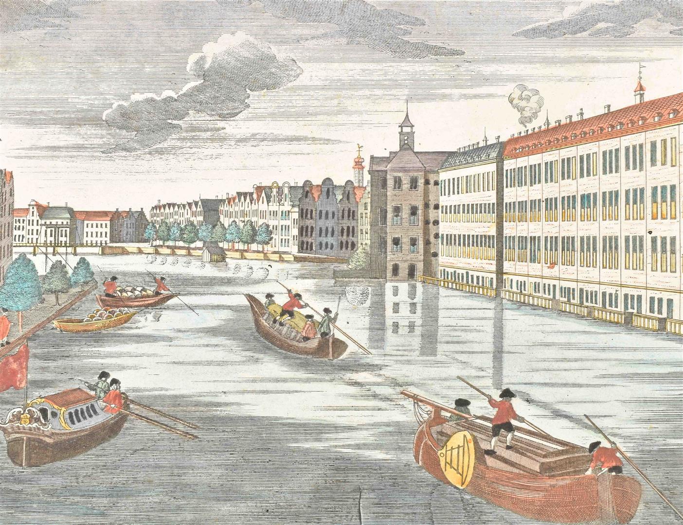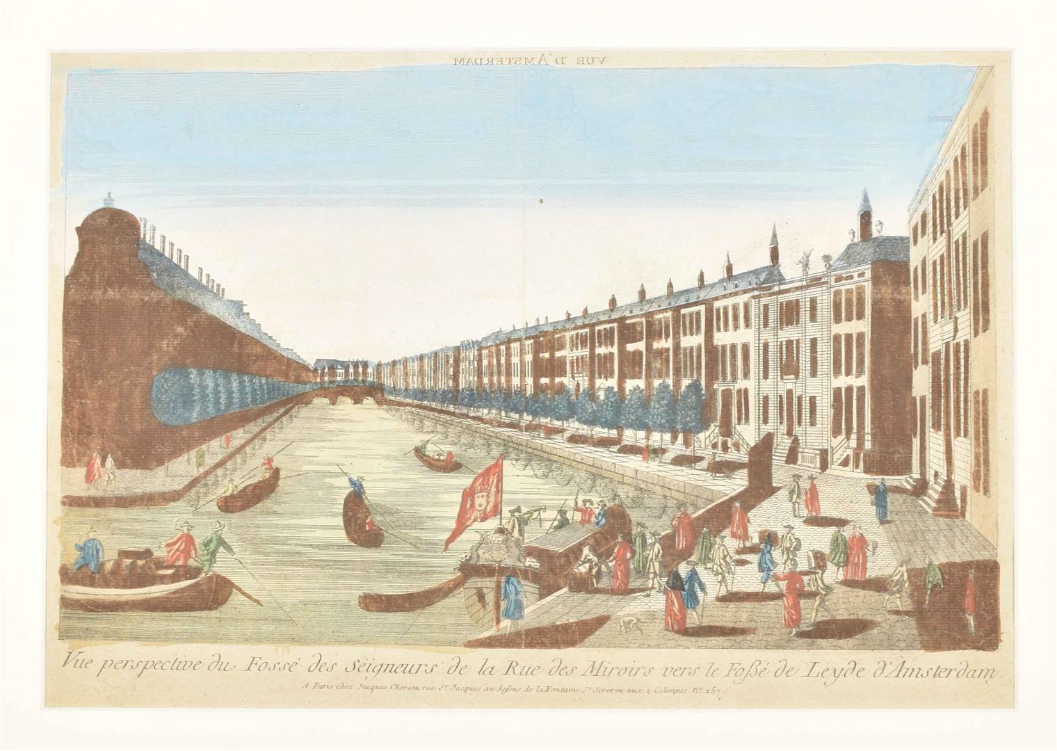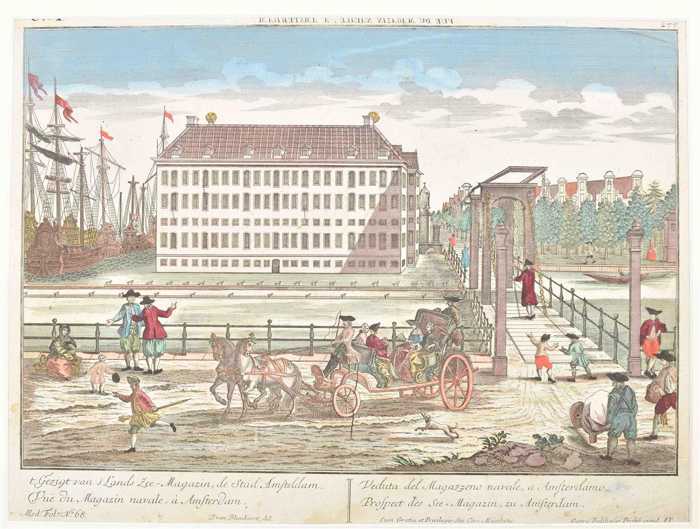 na het Diaken huys te Zien tot Amstelodam. Contemp. handcol. engr. optical view, 30 x 40.5 cm, w. captions in Latin, French, Dutch and German and numb. "Med. Fol.o No 10" below the image. Augsburg, G.B. Probst, ca. 1770. Trimmed just outside/ on the plate mark, some minor imperfections in blank margins. (2) Vuë de Magasin Navale, à Amsterdam. Contemp. handcol. engr. optical view, 31.5 x 41 cm, after P. van Blankaert, w. caption in reverse in French and no. 277 (and no. 2 in pen) above the image, and captions in Dutch, French, Italian and German below the image. Ibid., idem, ca. 1770. Under passepartout. Vaguely waterst. in lower corners, central vertical fold, minor other imperfections. -and 2 other optical views of Amst., incl. 1 publ. by Probst. Added: A view of the Amst. stadhuis w. fire trucks, an uncol., fold. version of a print that is usually seen as a col. optical print.