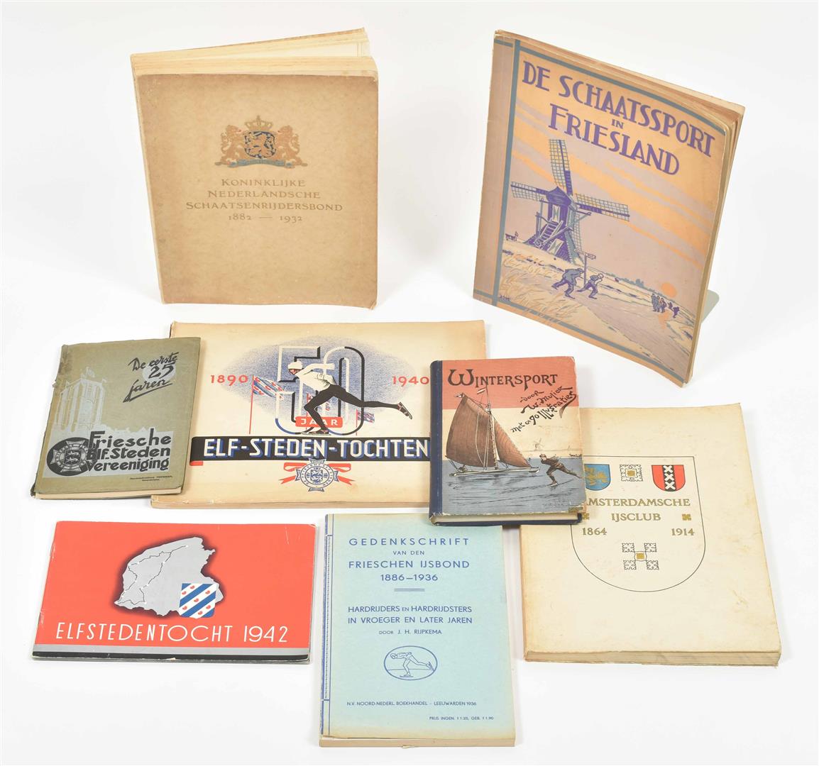 (1) De schaatssport in Friesland. Leeuwarden, D.Y. Alta, 1948. (2) J.P. Wiersma, ed. Vijftig jaar elf-steden-tochten Friesche schaatsensport en schaatsen-industrie. Leeuwarden, Realta, 1941. (3) Amsterdamsche ijsclub, 1864-1914. Publ. for the 50 year anniversary. (4) Logboek van den achtsten Elfstedentocht per schaats op donderdag 22 januari 1942. (5) W. Muller. Wintersport. Haarlem, De Erven Loosjes, n.d. -and 3 others.